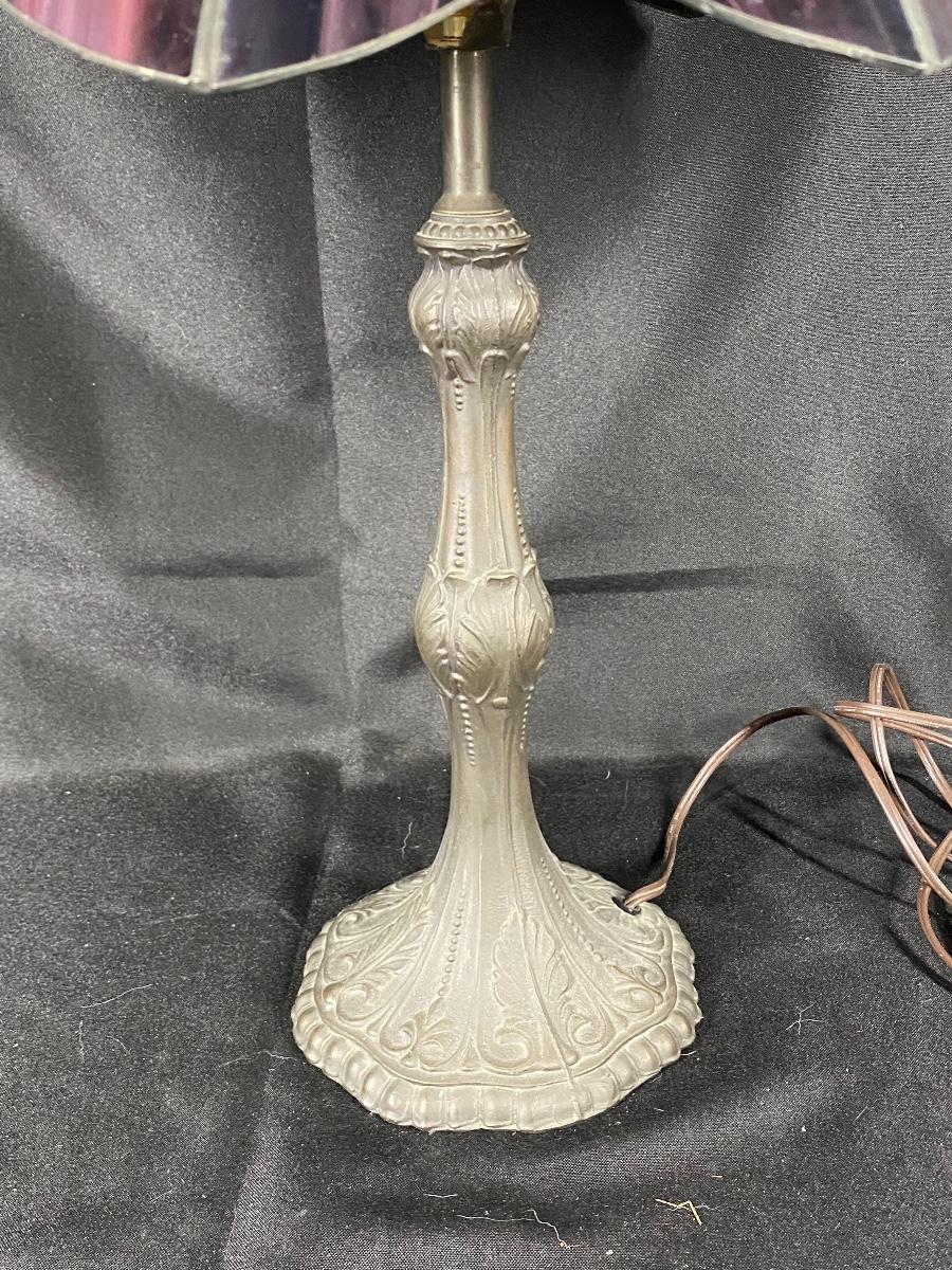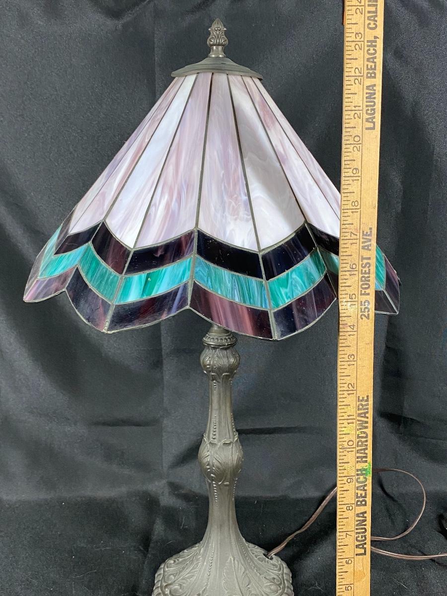 Art deco style slag glass tiffany lamp. Violet purple and green slag. About 24" tall. Needs to be cleaned, quite dusty.