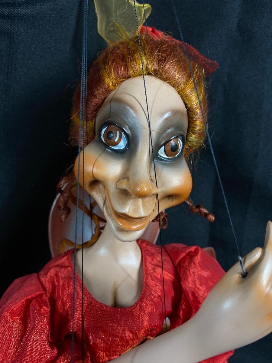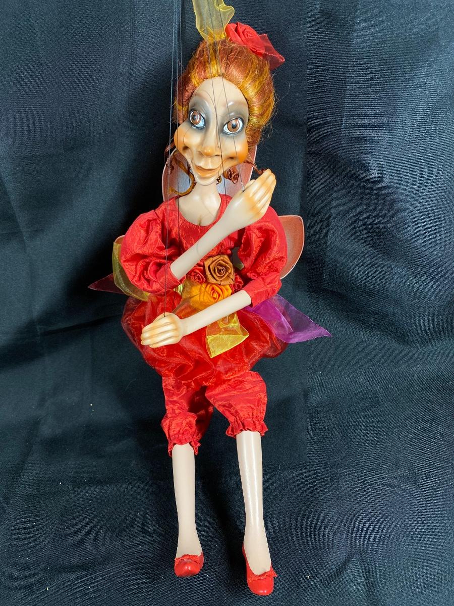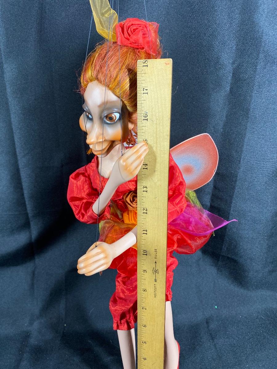 Porcelain art doll string puppet marionette. Exaggerated facial features, has wings like a fairy. Good condition. Strings are a little tangled. About 18" without the strings.