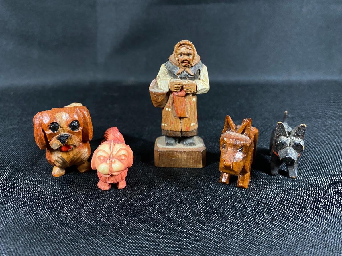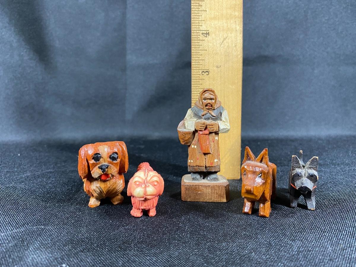 Set of 5 carved wood miniatures. Old lady with 4 dogs. Dogs are all different, About 2.5" size.