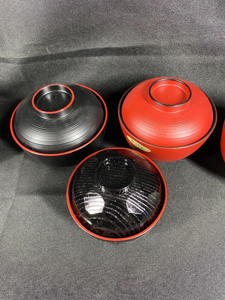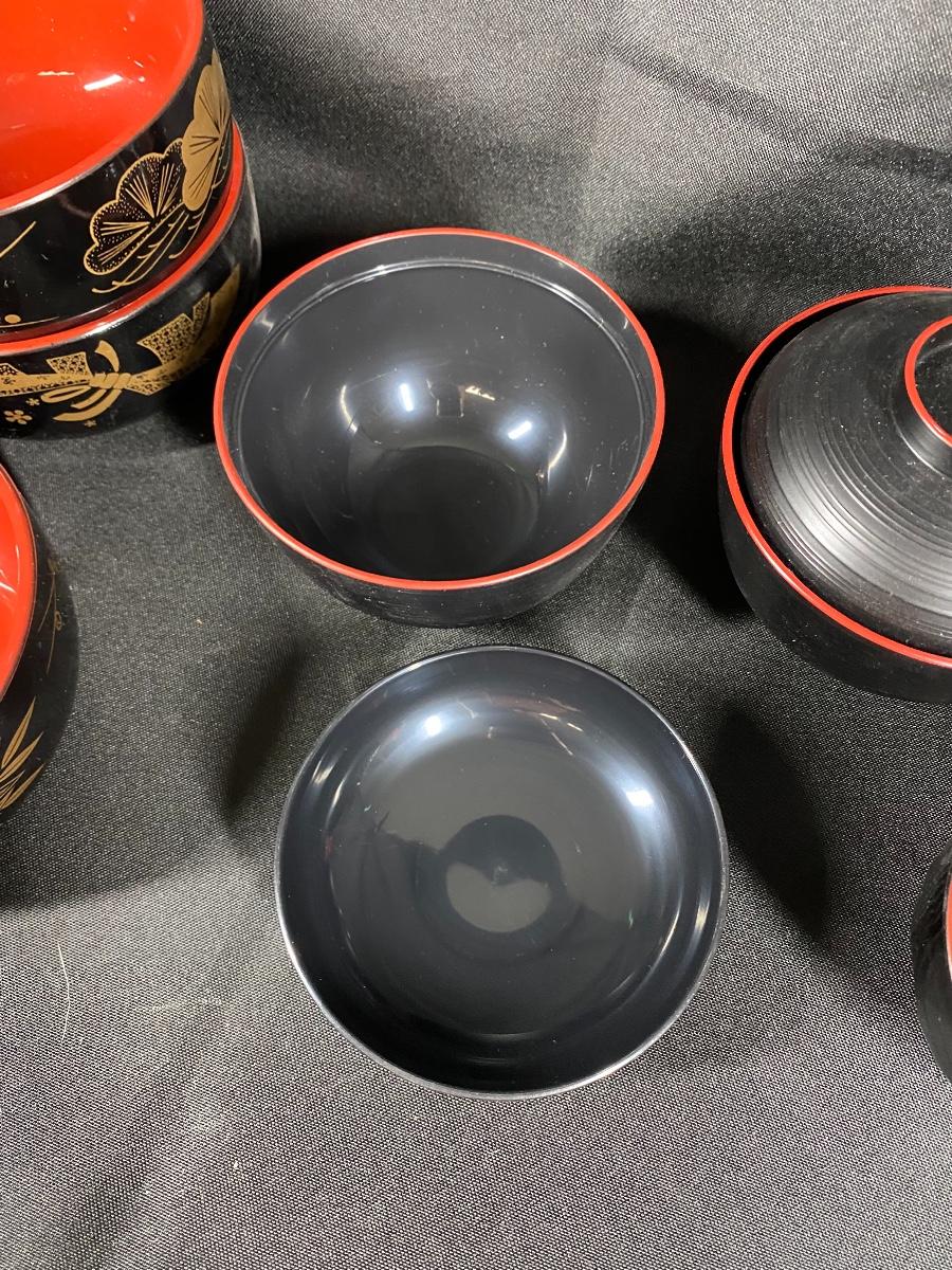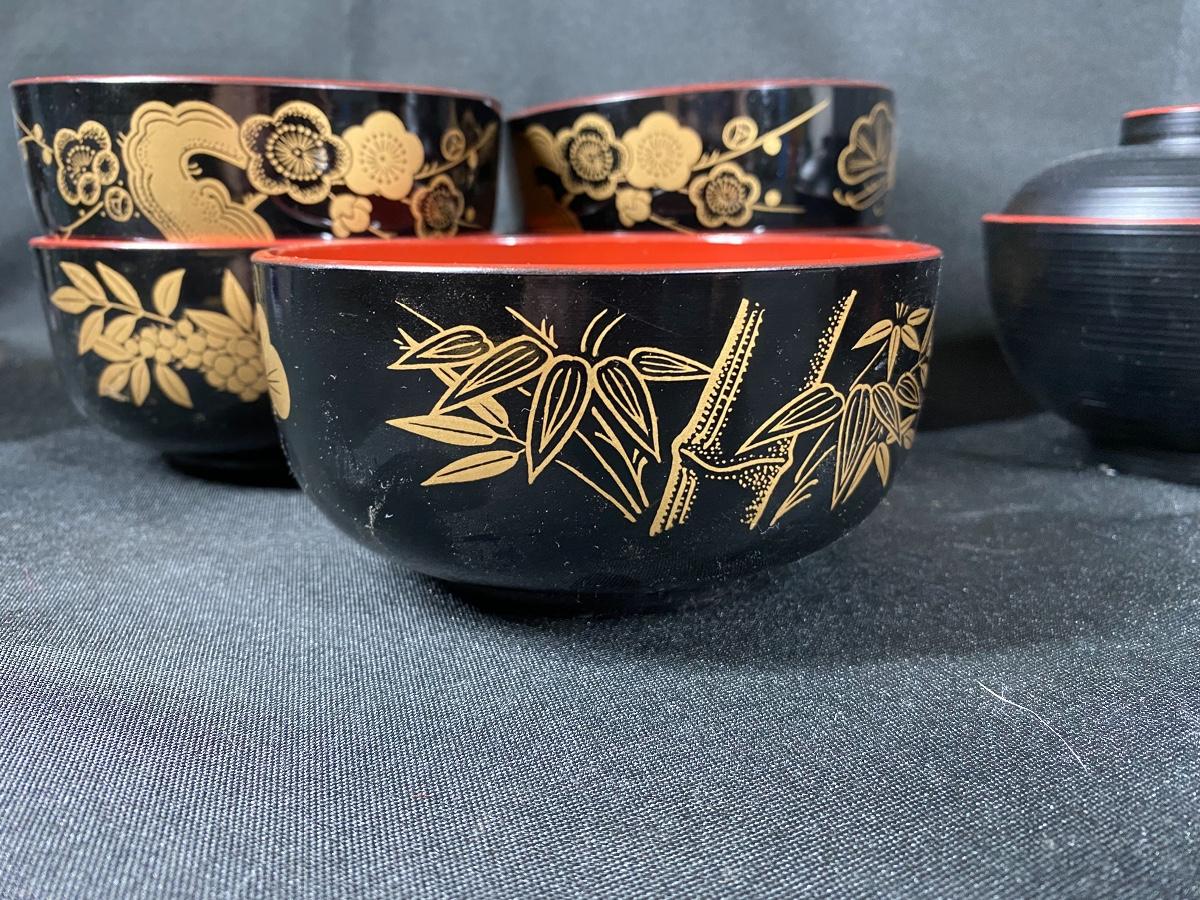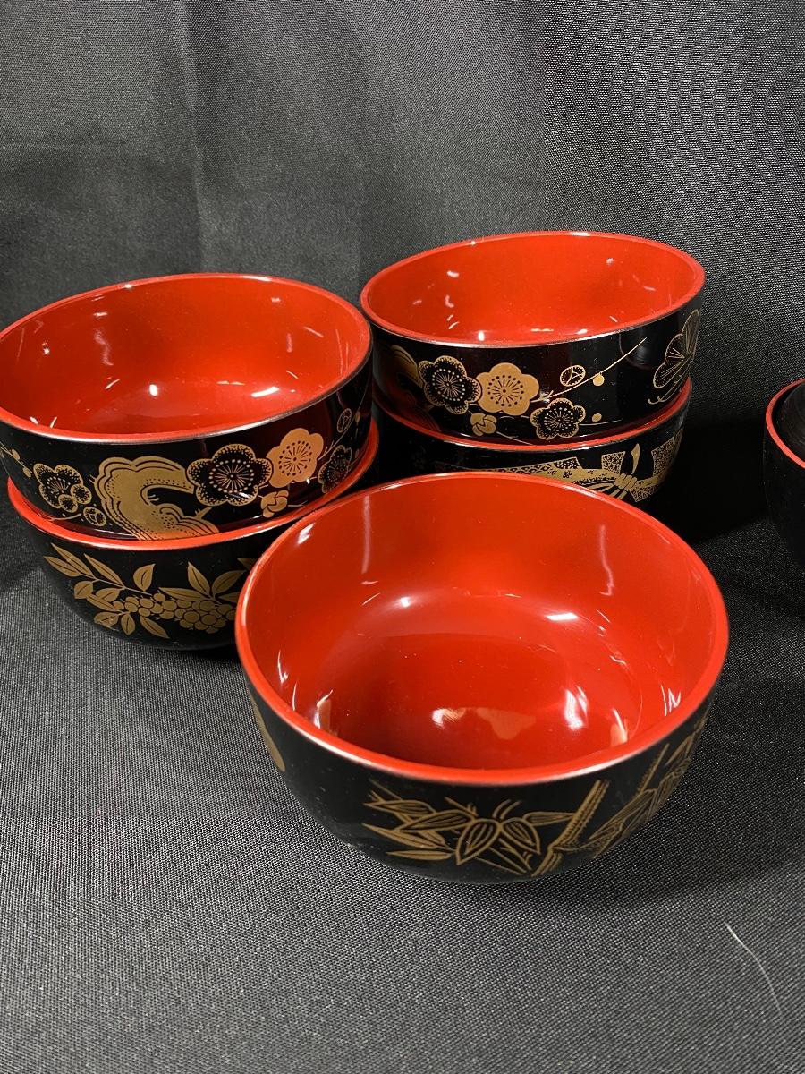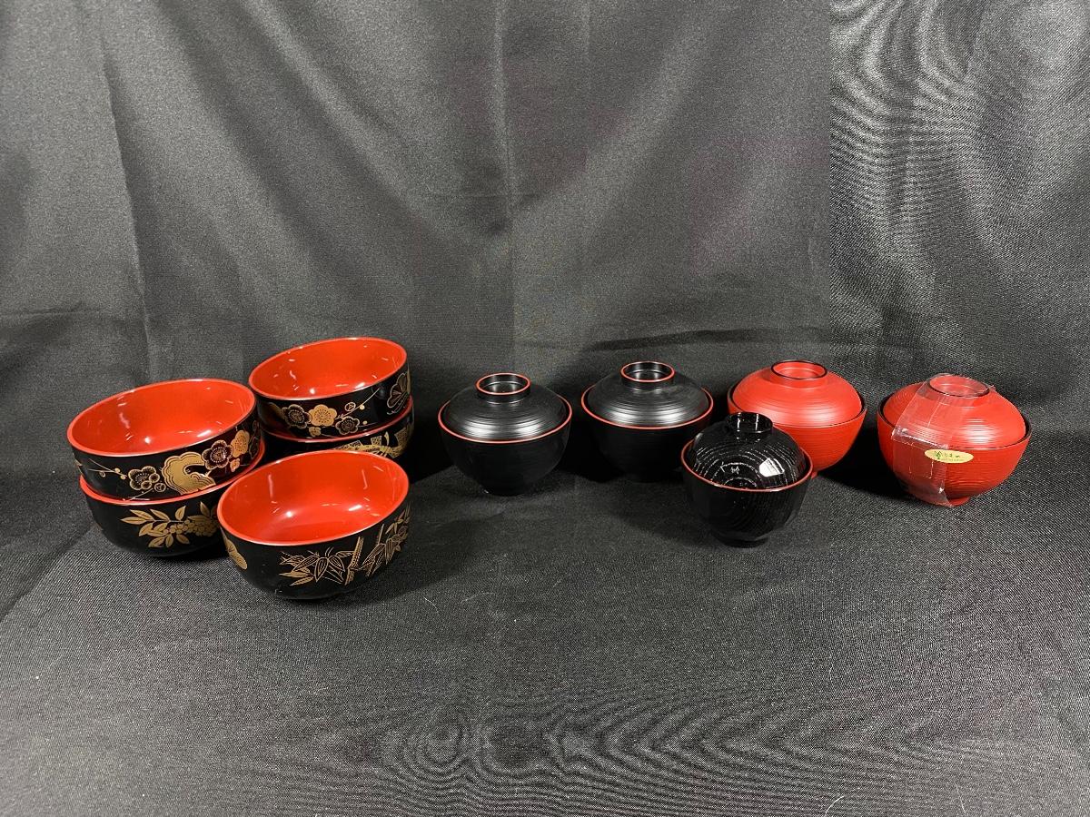 Set of 10 Asian style rice/soup bowls. Red and black. Some with gold bamboo and floral design, others with lids. All in good condition, possibly unused.