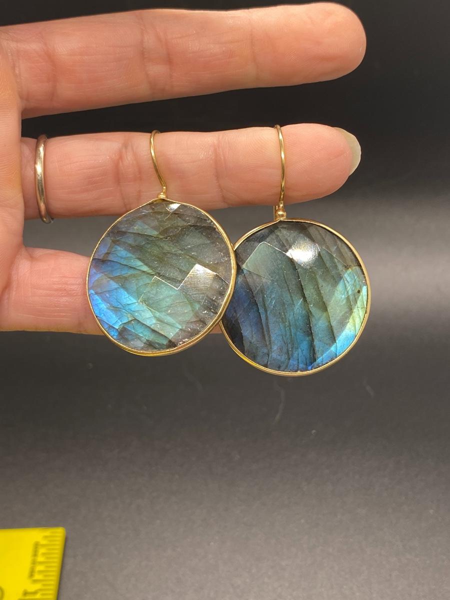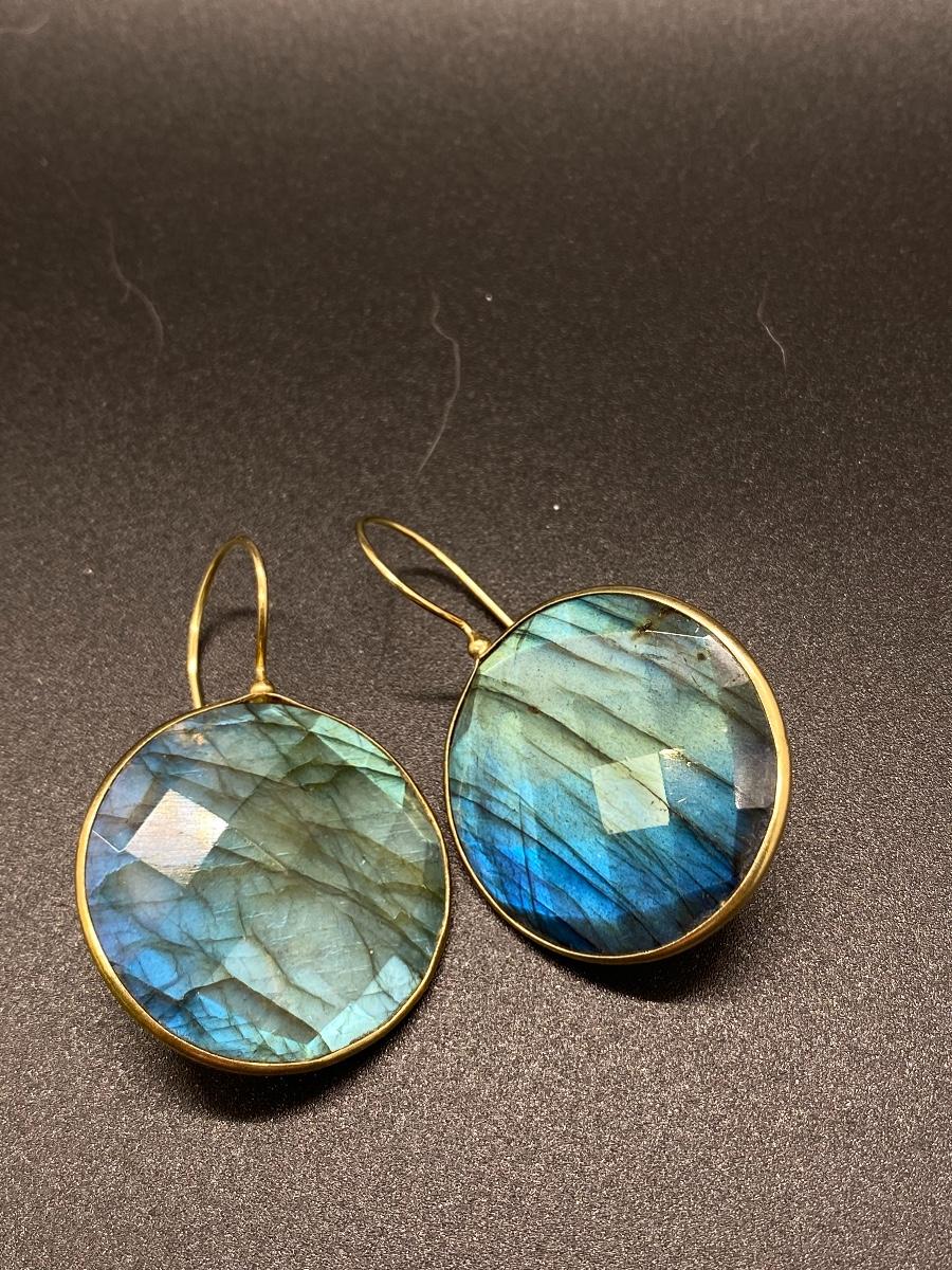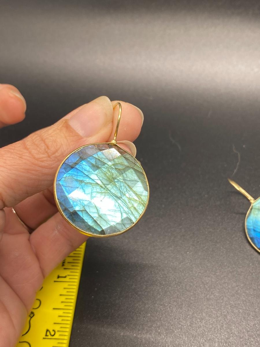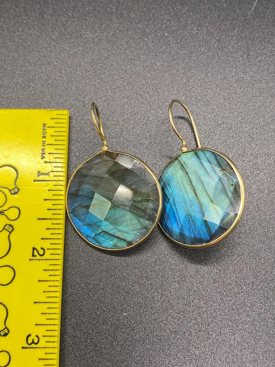 Pair of blue/green prism cut art glass earrings. Have a mother of pearl shimmer but they are glass. Gold tone metal wrap and post. About 2" total size.