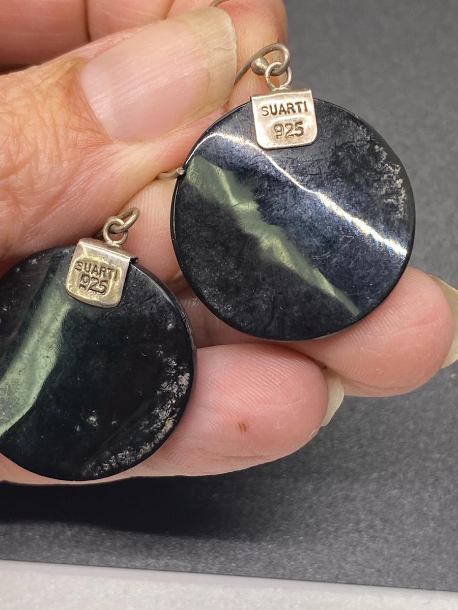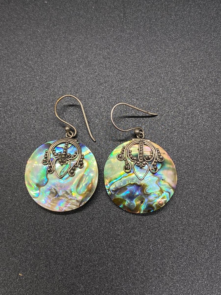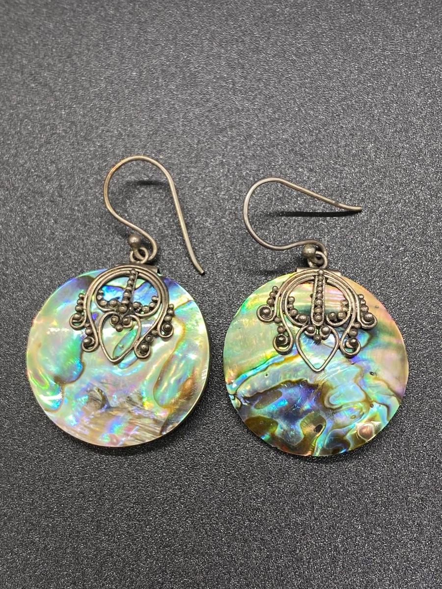 Mother of pearl & sterling silver drop earrings. Colorful MOP discs with ornate sterling details. Signed Suarti 925 on the back. Discs are about 1" size.