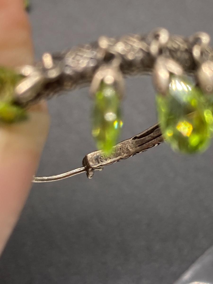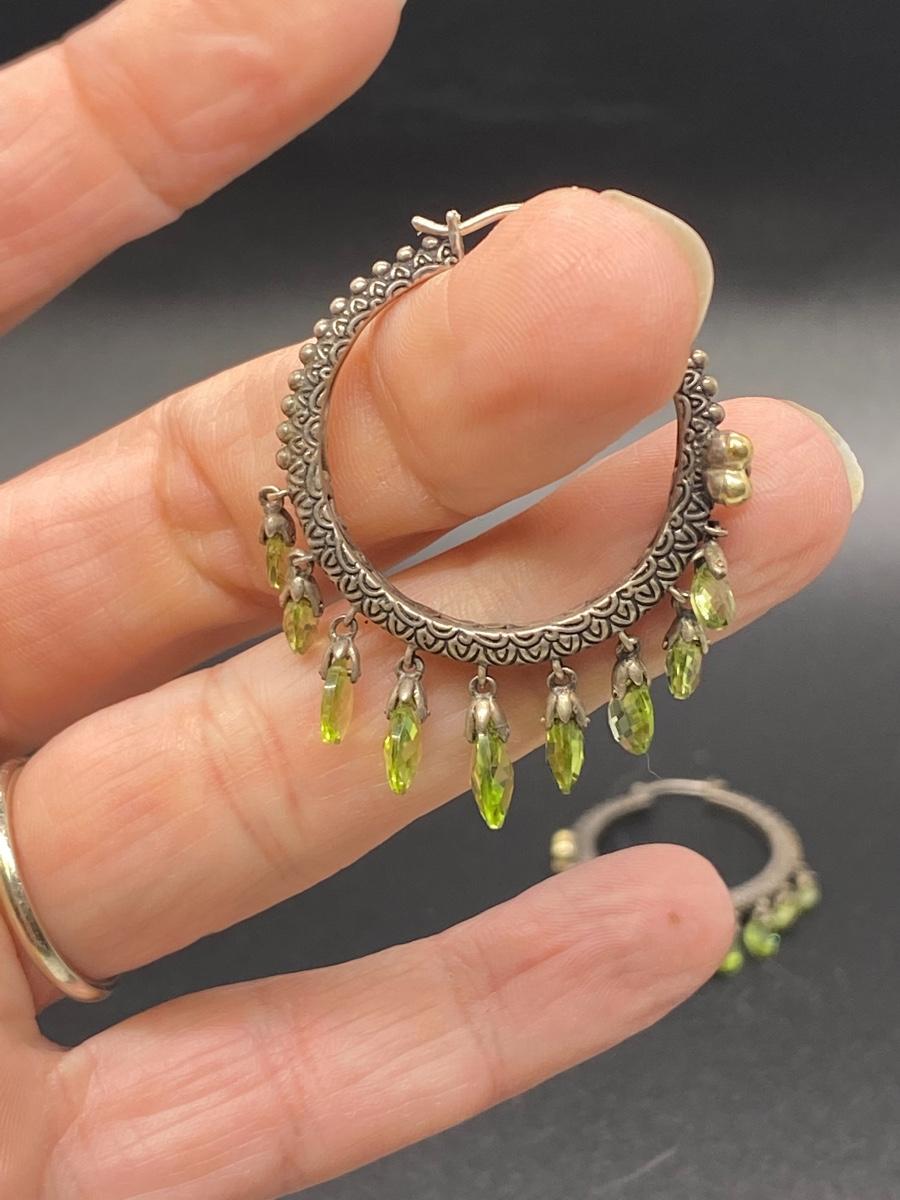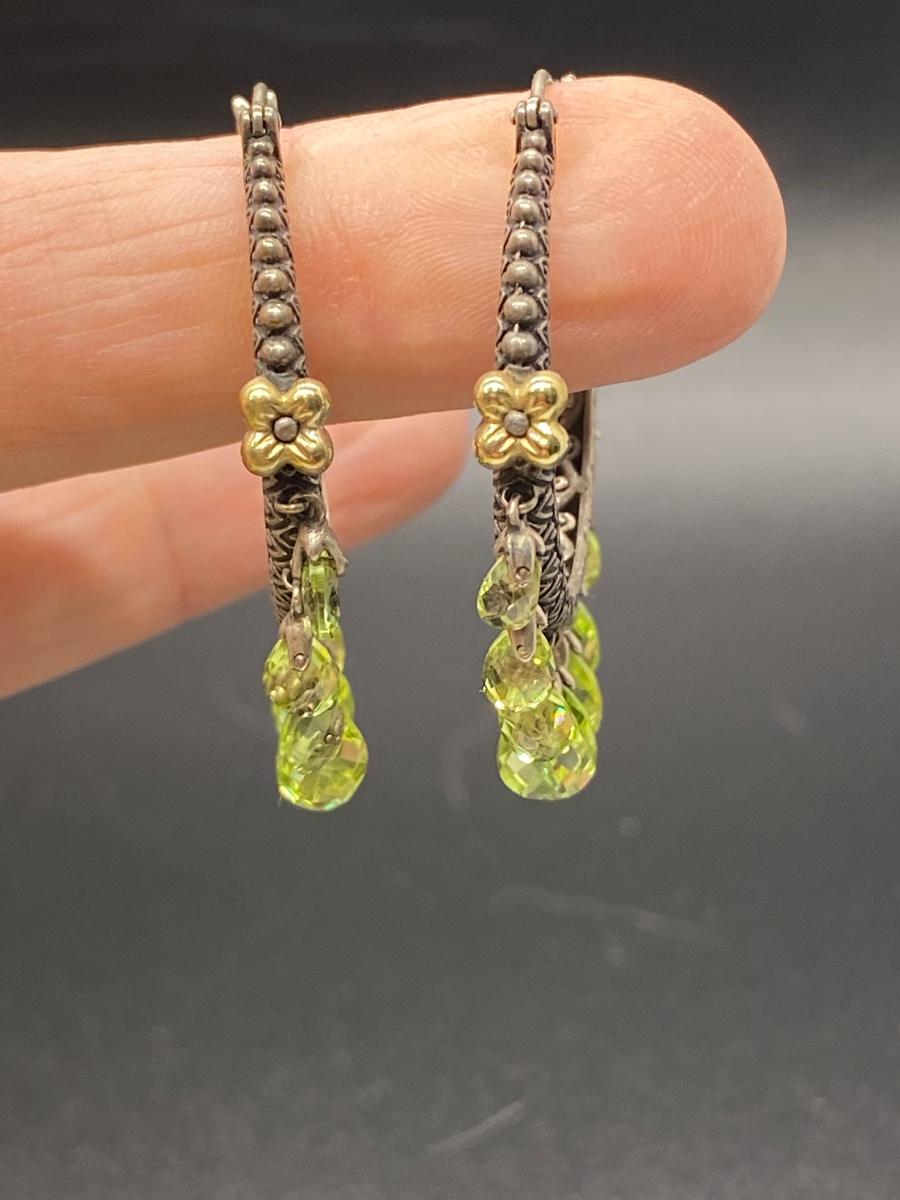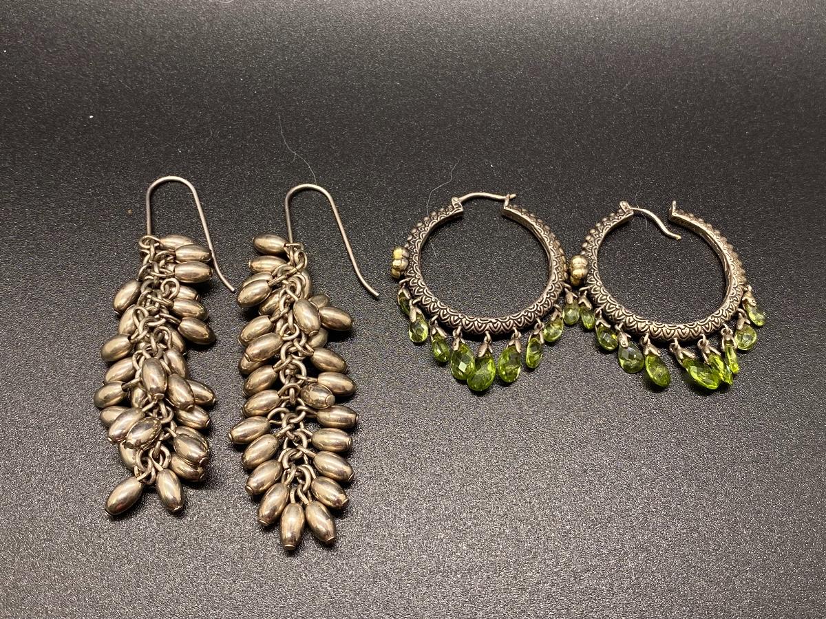 Two pairs of sterling silver drop earrings. The first pair are clusters bead dangle earrings, did not find any markings so they might not be sterling, but do look it. The hoop earrings have peridot gemstones hanging from the bottom and small 18k yellow gold flower on the front. They are marked both 18k and sterling, about 1.5" size. Both pairs in good condition.