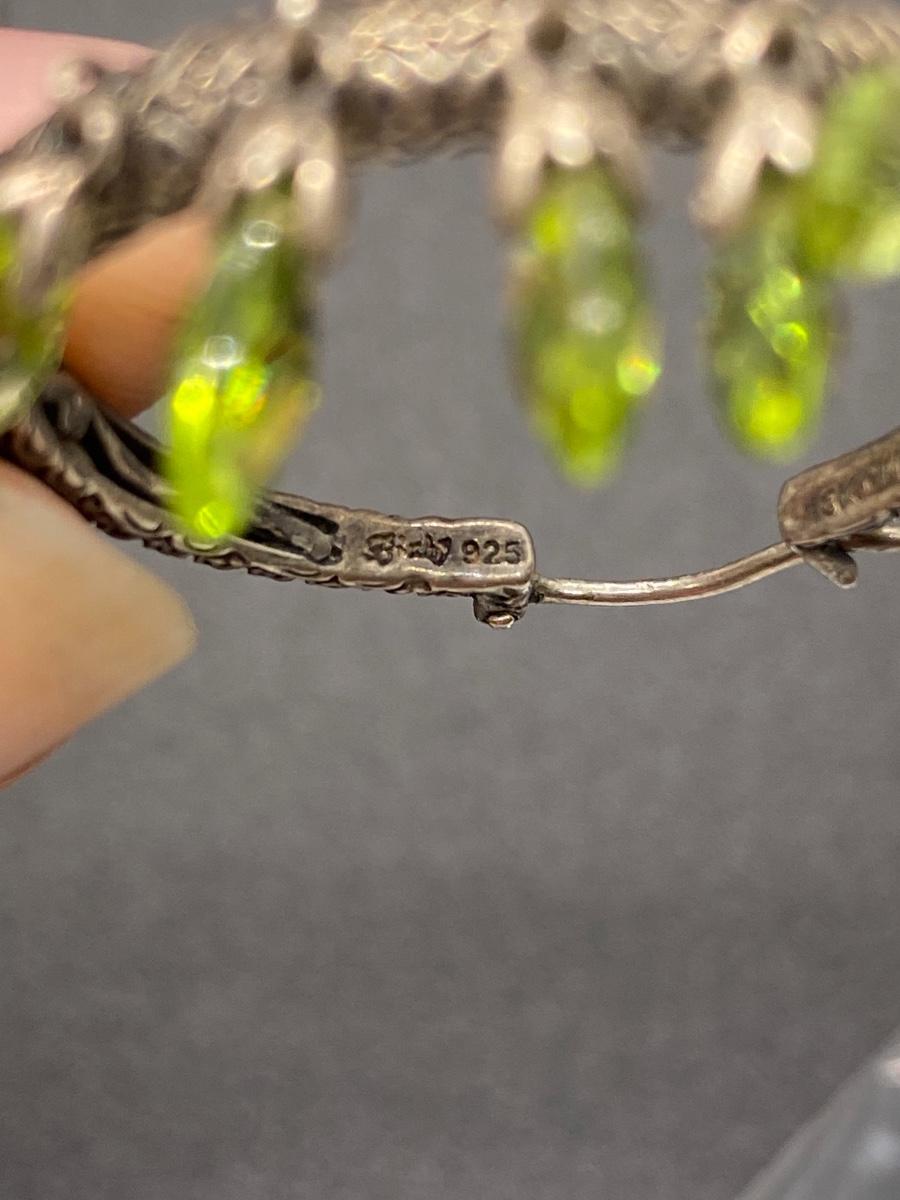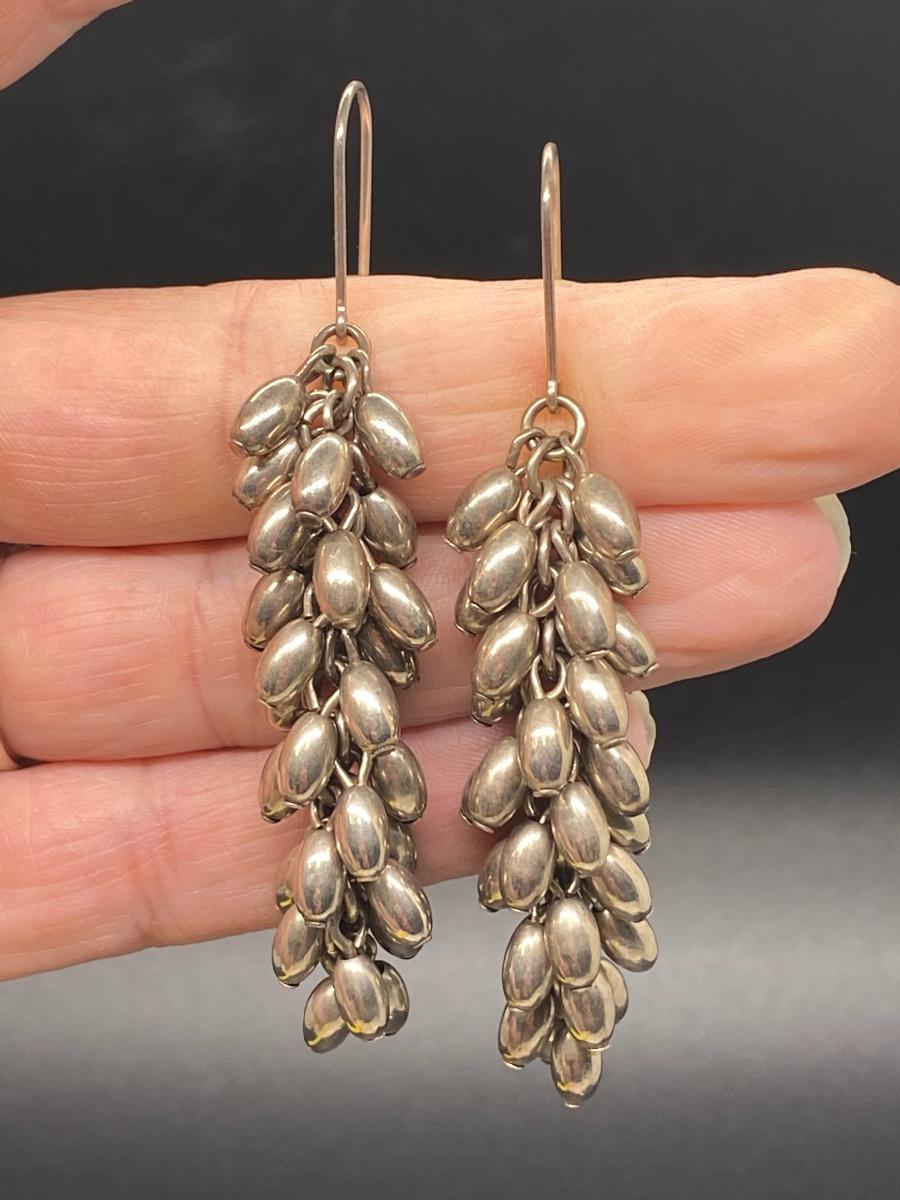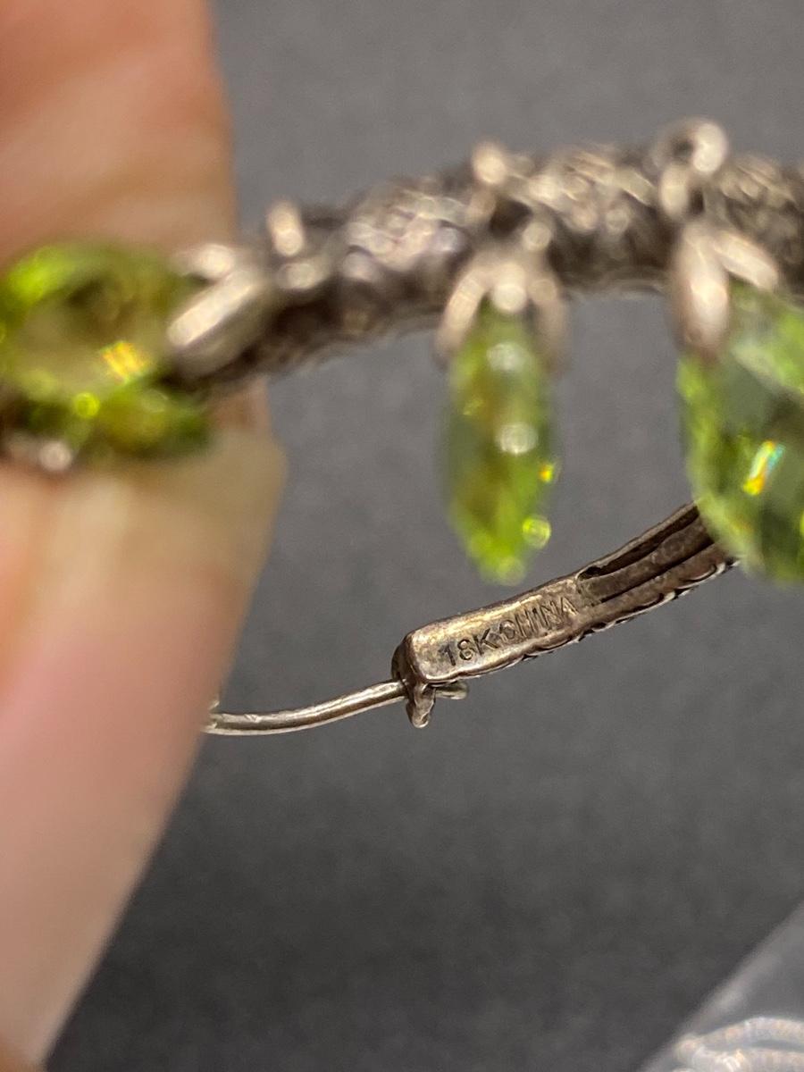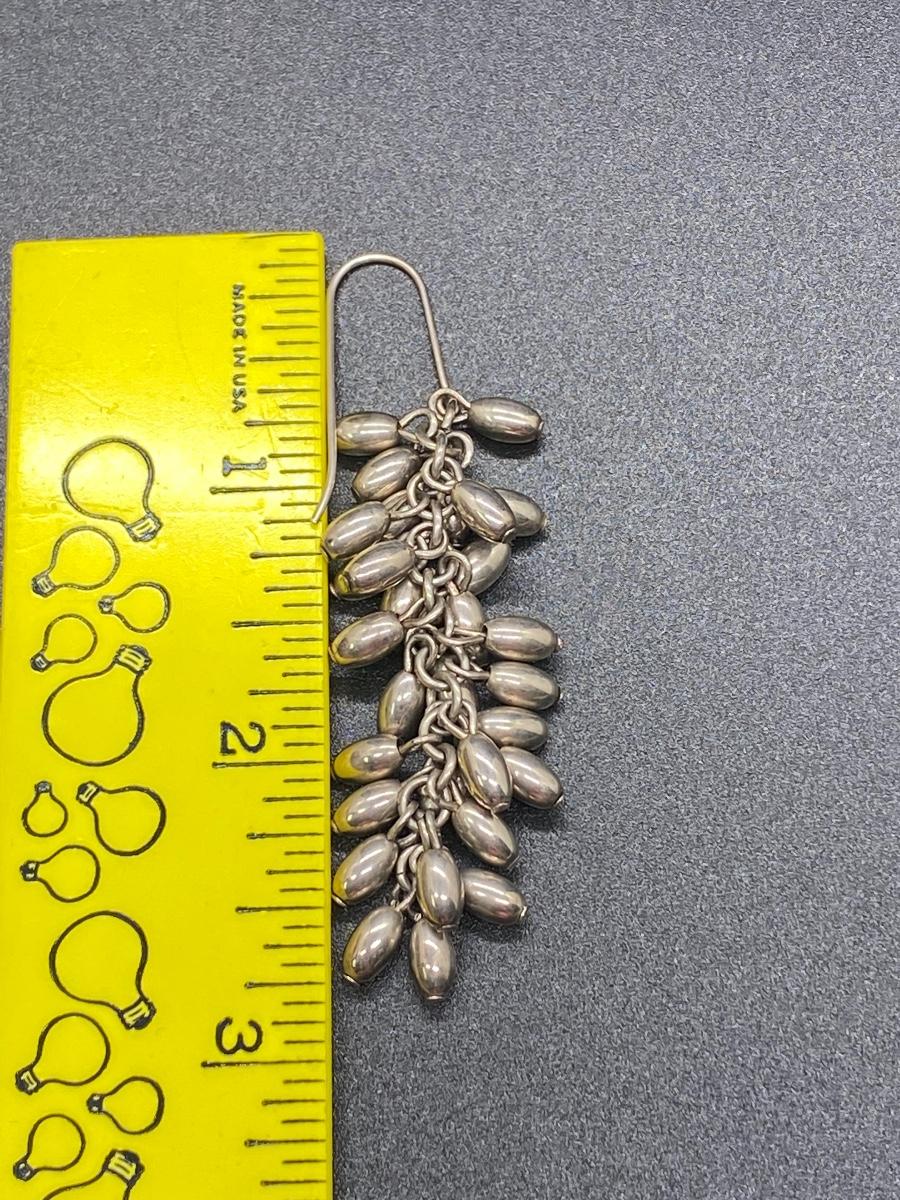 Two pairs of sterling silver drop earrings. The first pair are clusters bead dangle earrings, did not find any markings so they might not be sterling, but do look it. The hoop earrings have peridot gemstones hanging from the bottom and small 18k yellow gold flower on the front. They are marked both 18k and sterling, about 1.5" size. Both pairs in good condition.