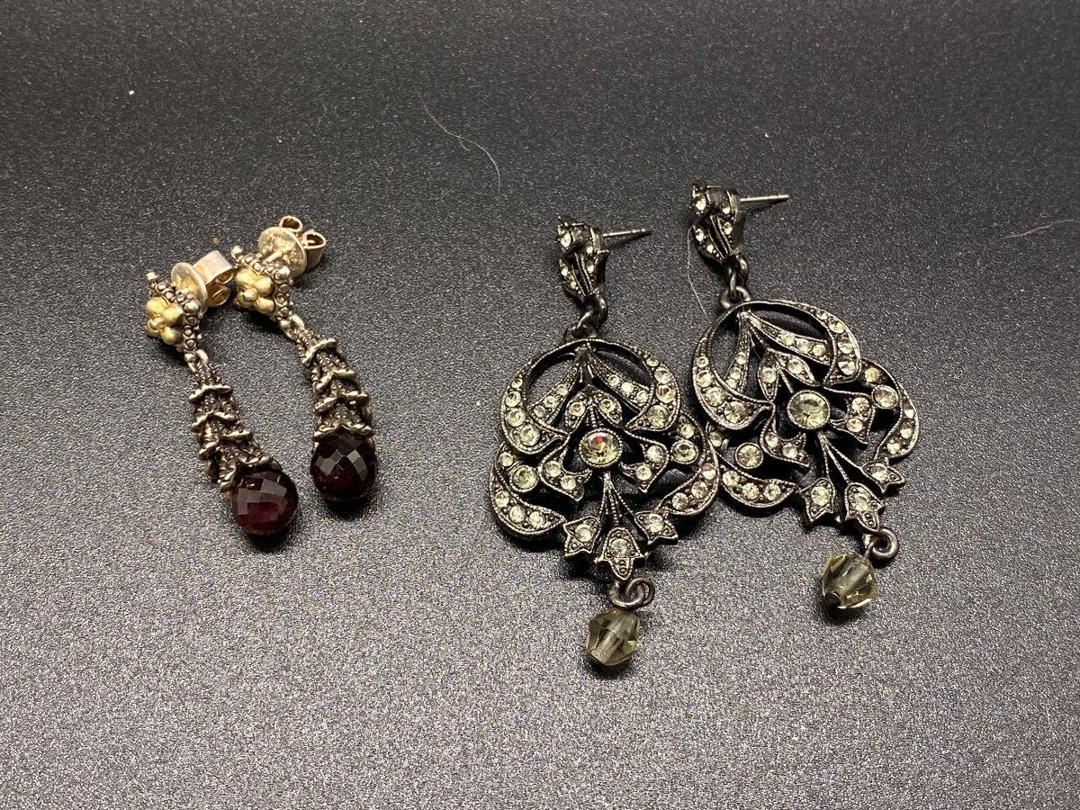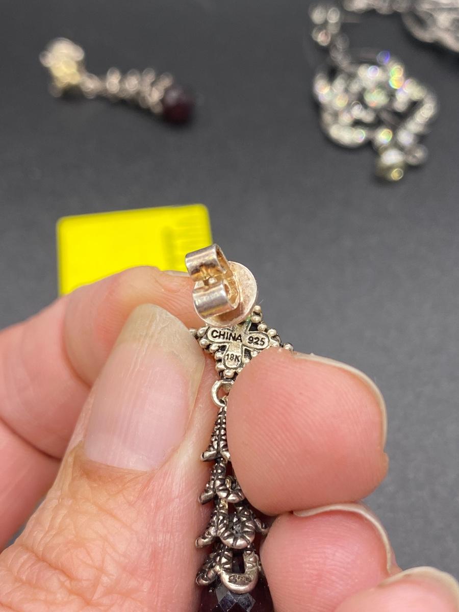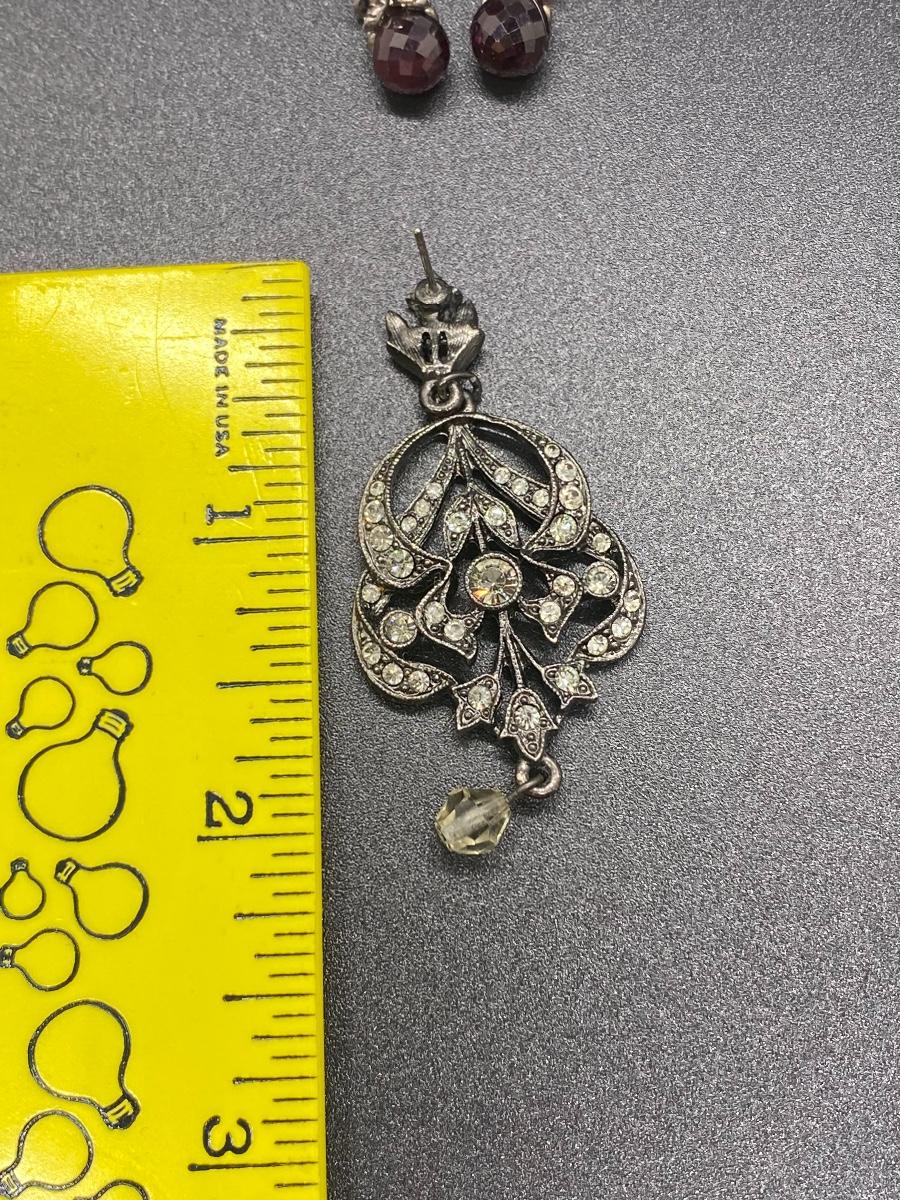 Two pairs of dangling earrings. The larger pair are unmarked rhinestone fashion earrings. The smaller pair are marked sterling 925 and 18k. Sterling articulated design with what looks like a faceted garnet bead on the end. Small 18k yellow gold flower at the top. Marked on the back.
