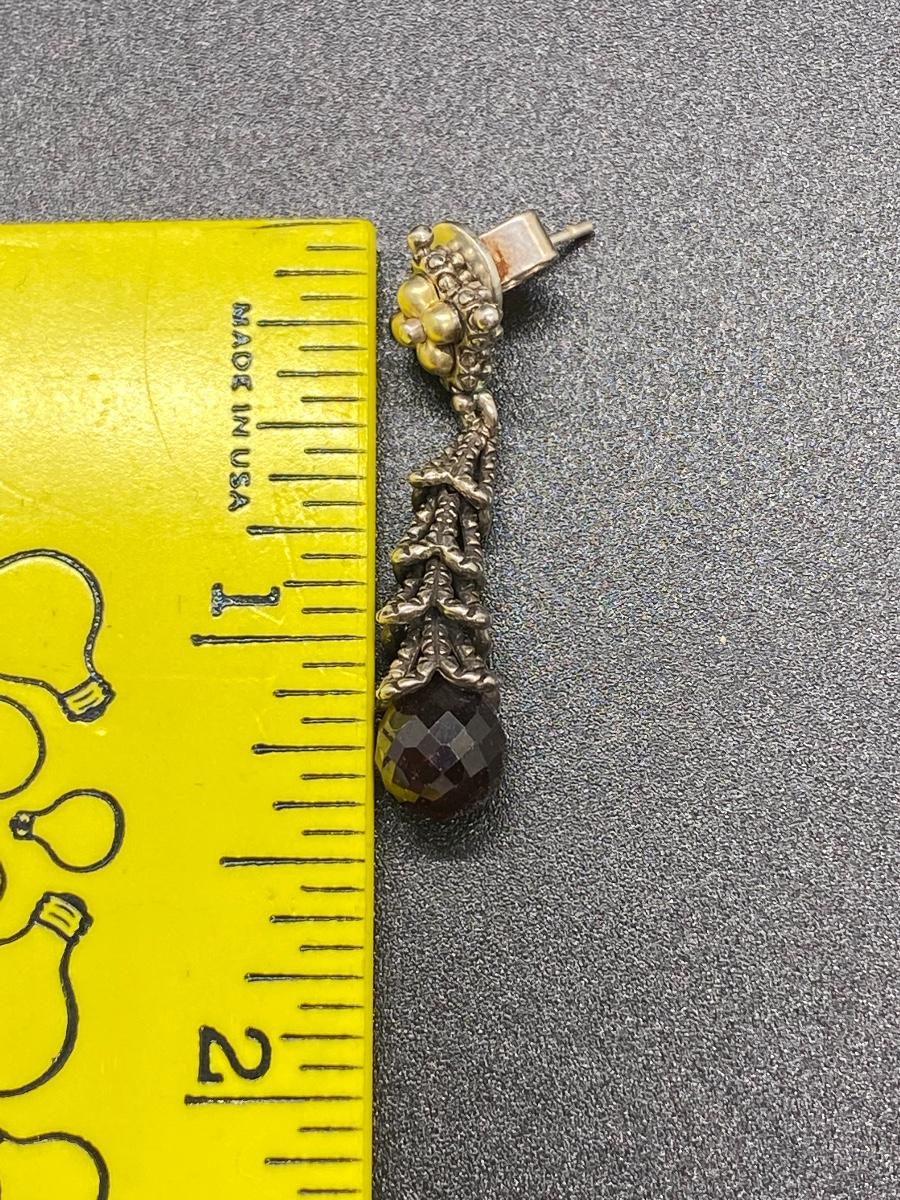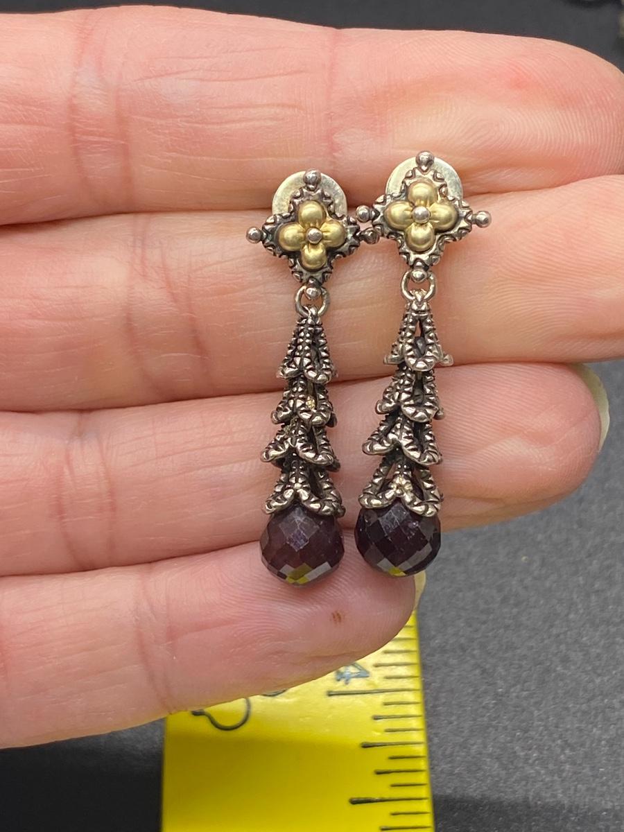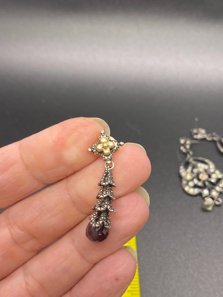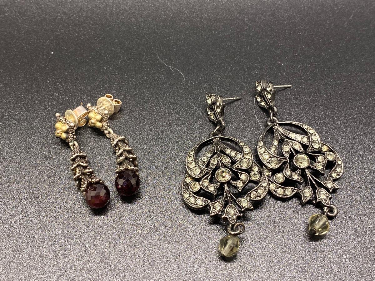 Two pairs of dangling earrings. The larger pair are unmarked rhinestone fashion earrings. The smaller pair are marked sterling 925 and 18k. Sterling articulated design with what looks like a faceted garnet bead on the end. Small 18k yellow gold flower at the top. Marked on the back.