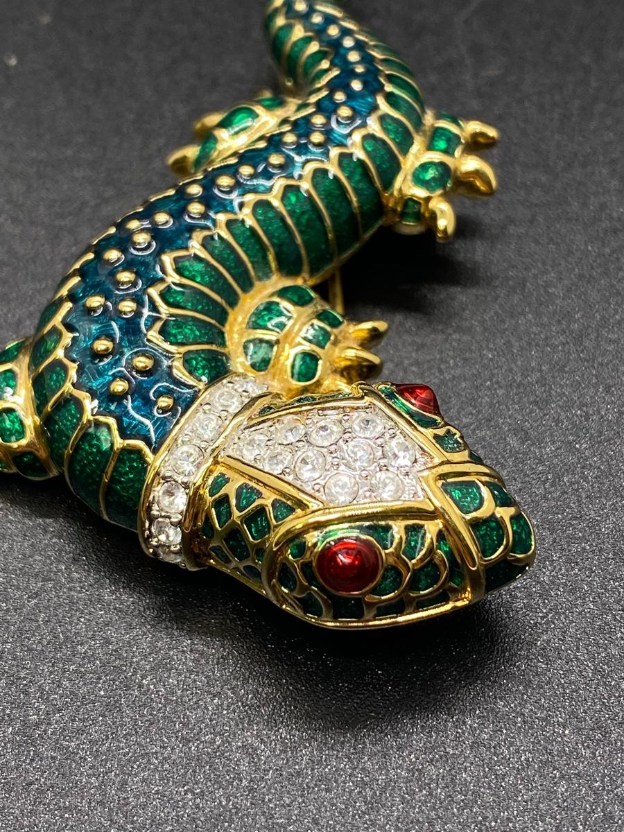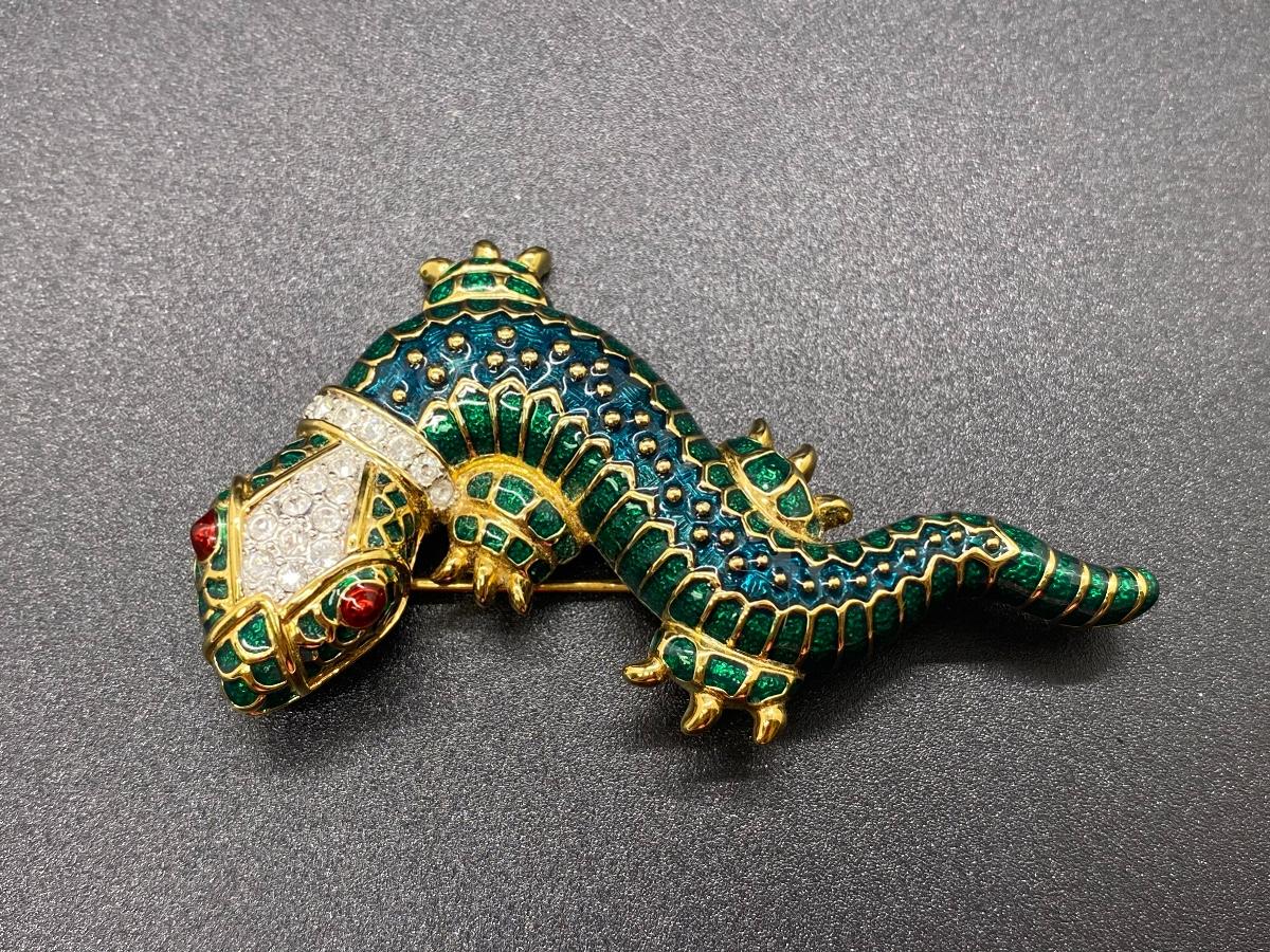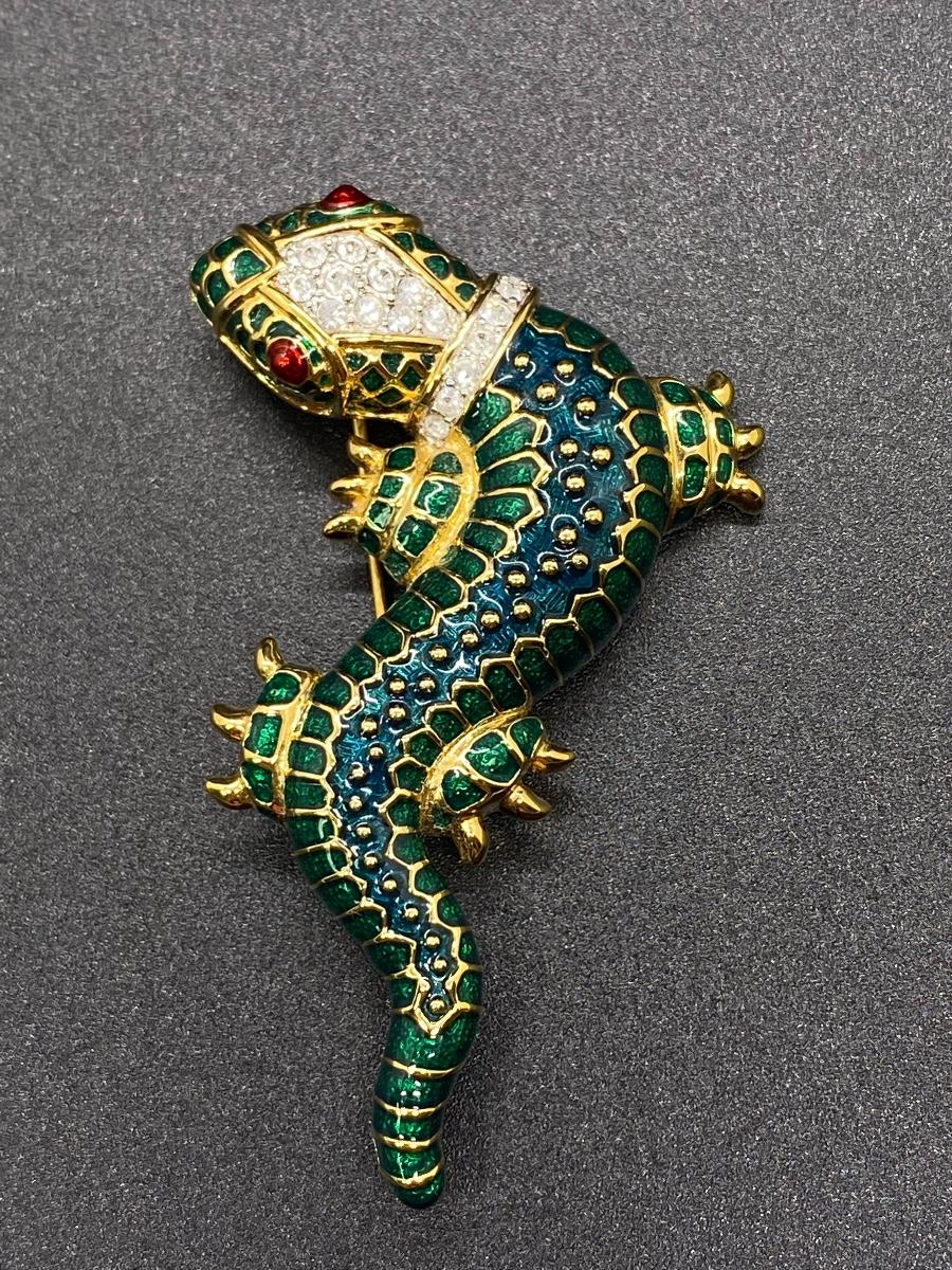 Vintage KJL Kenneth Jay Lane Green Enamel Rhinestone Lizard Reptile Gecko Pin Brooch