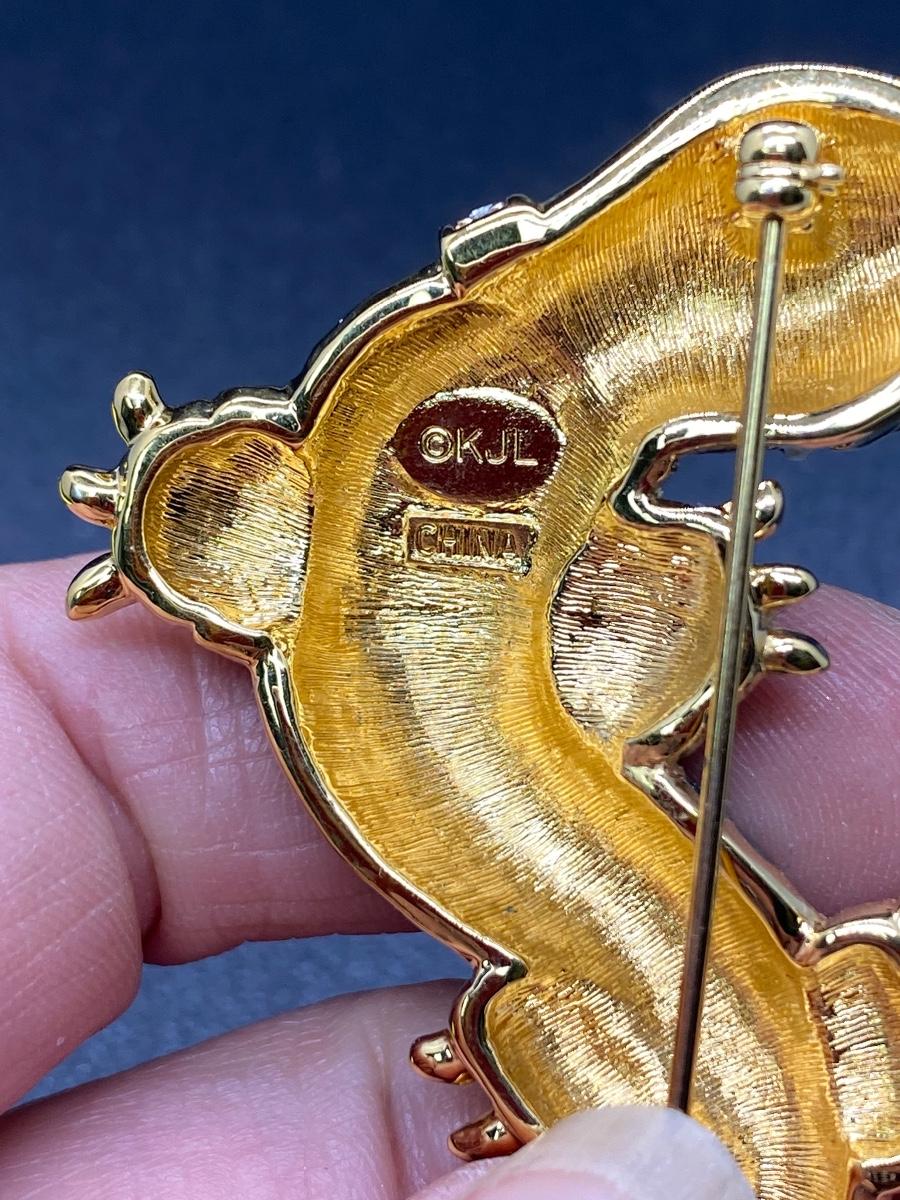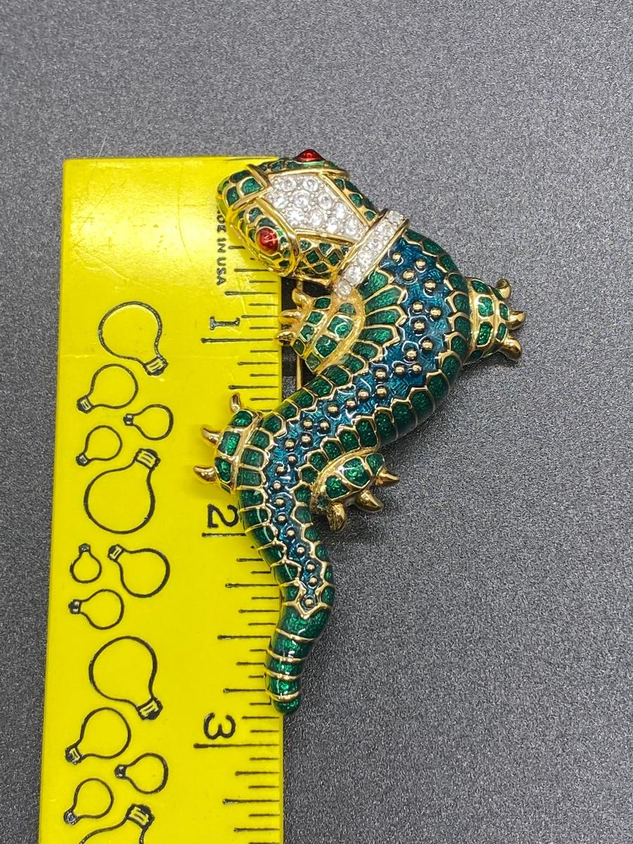 Vintage Kenneth Jay Lane gecko brooch. Beautifully done KJL pin set in a gold tone setting. Green enamel body, clear rhinestones on head, red enamel eyes. Measures almost 3" in length. Great condition. Marked on the underside.