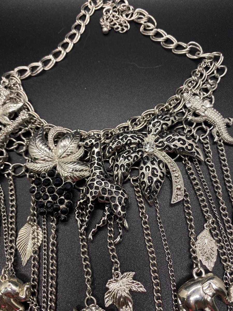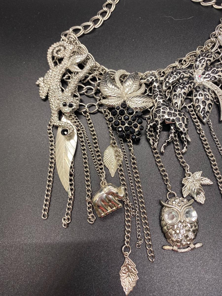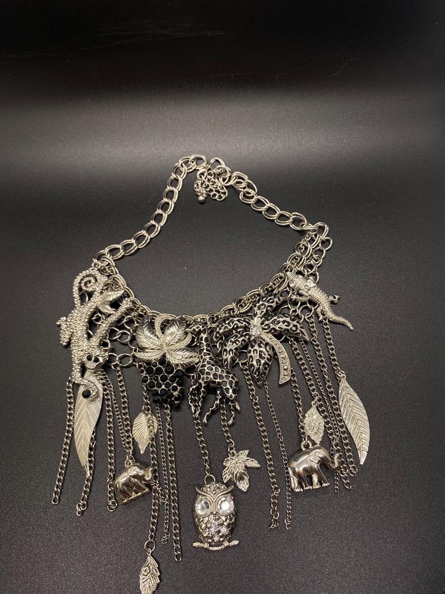 Interesting silver tone statement necklace. Collar bone choker length. Has multiple dangling chain pieces and charms attached. May be handmade. Has kind of a jungle theme to it. See photos.