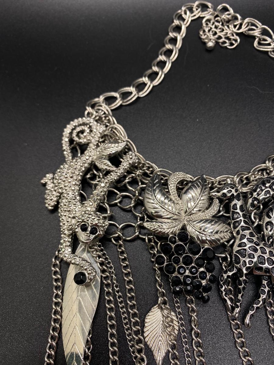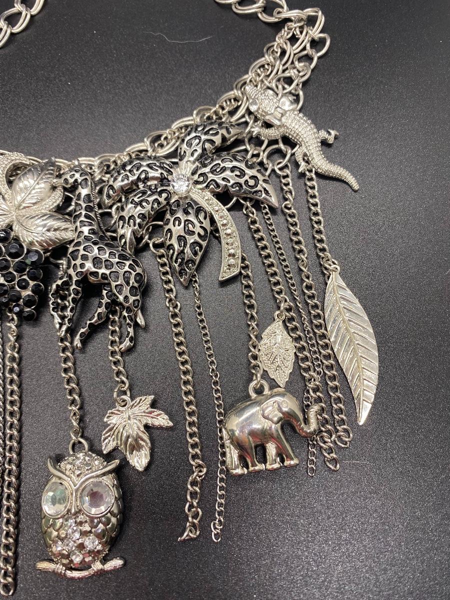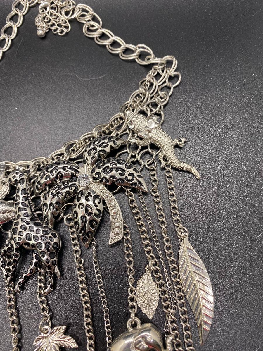 Interesting silver tone statement necklace. Collar bone choker length. Has multiple dangling chain pieces and charms attached. May be handmade. Has kind of a jungle theme to it. See photos.