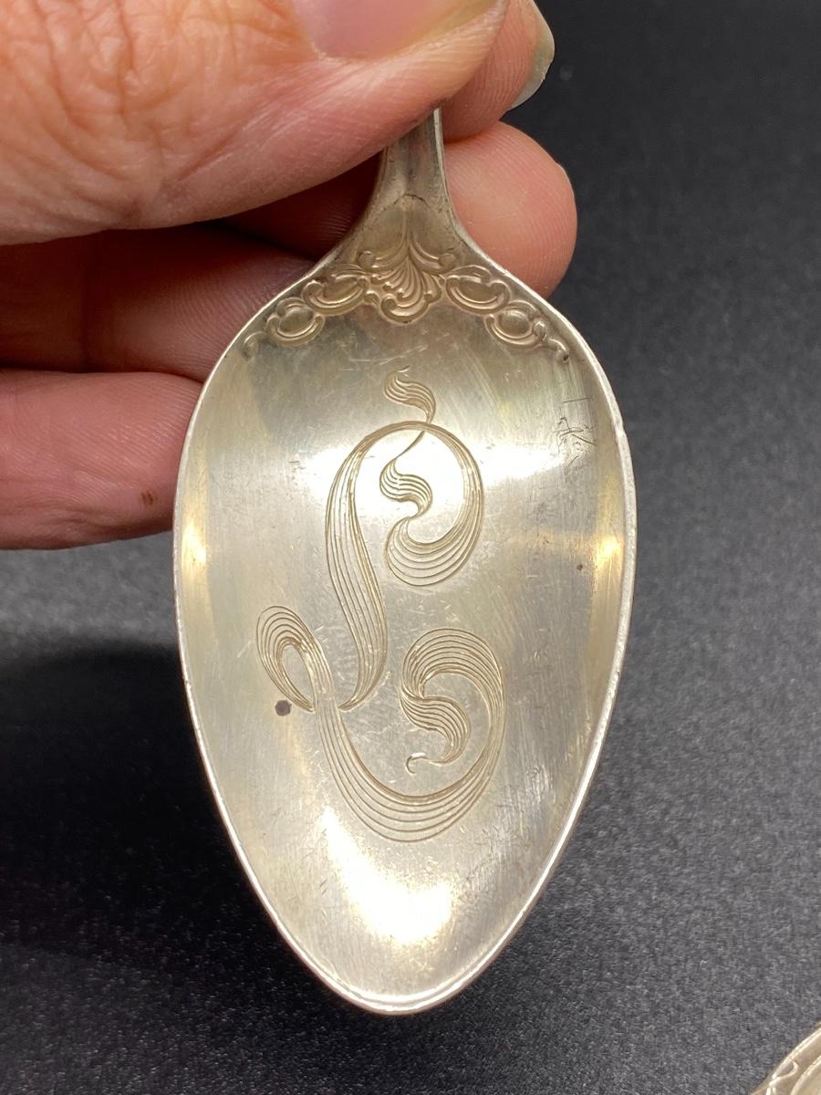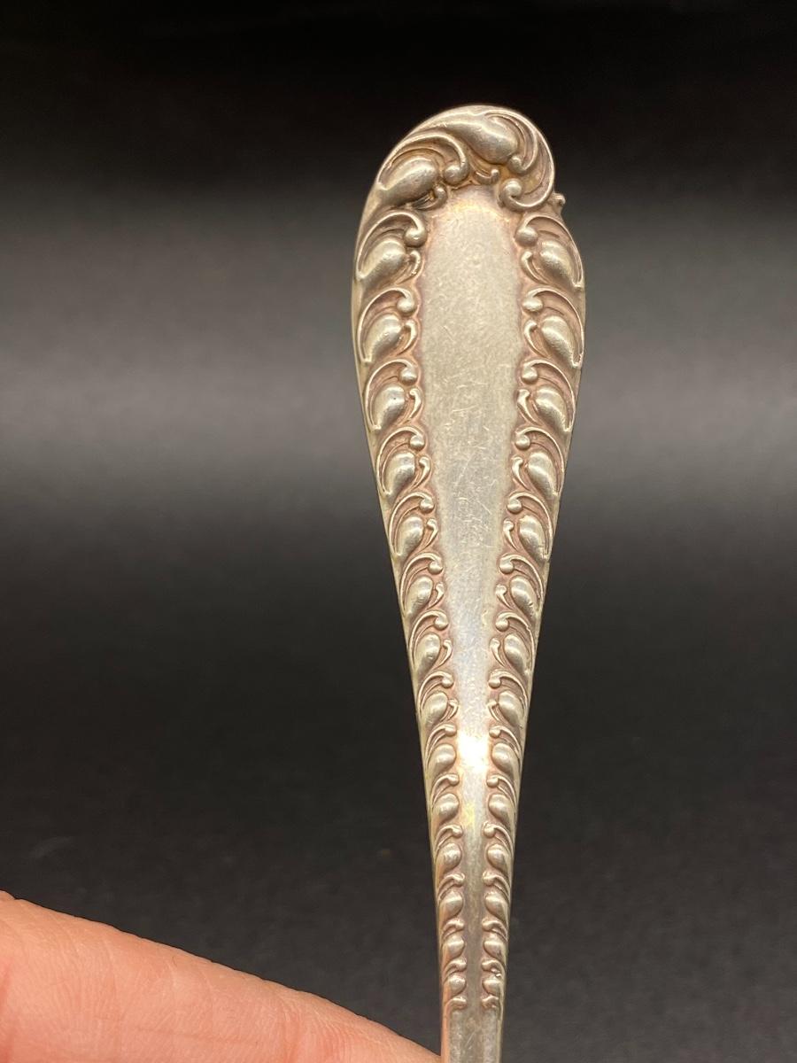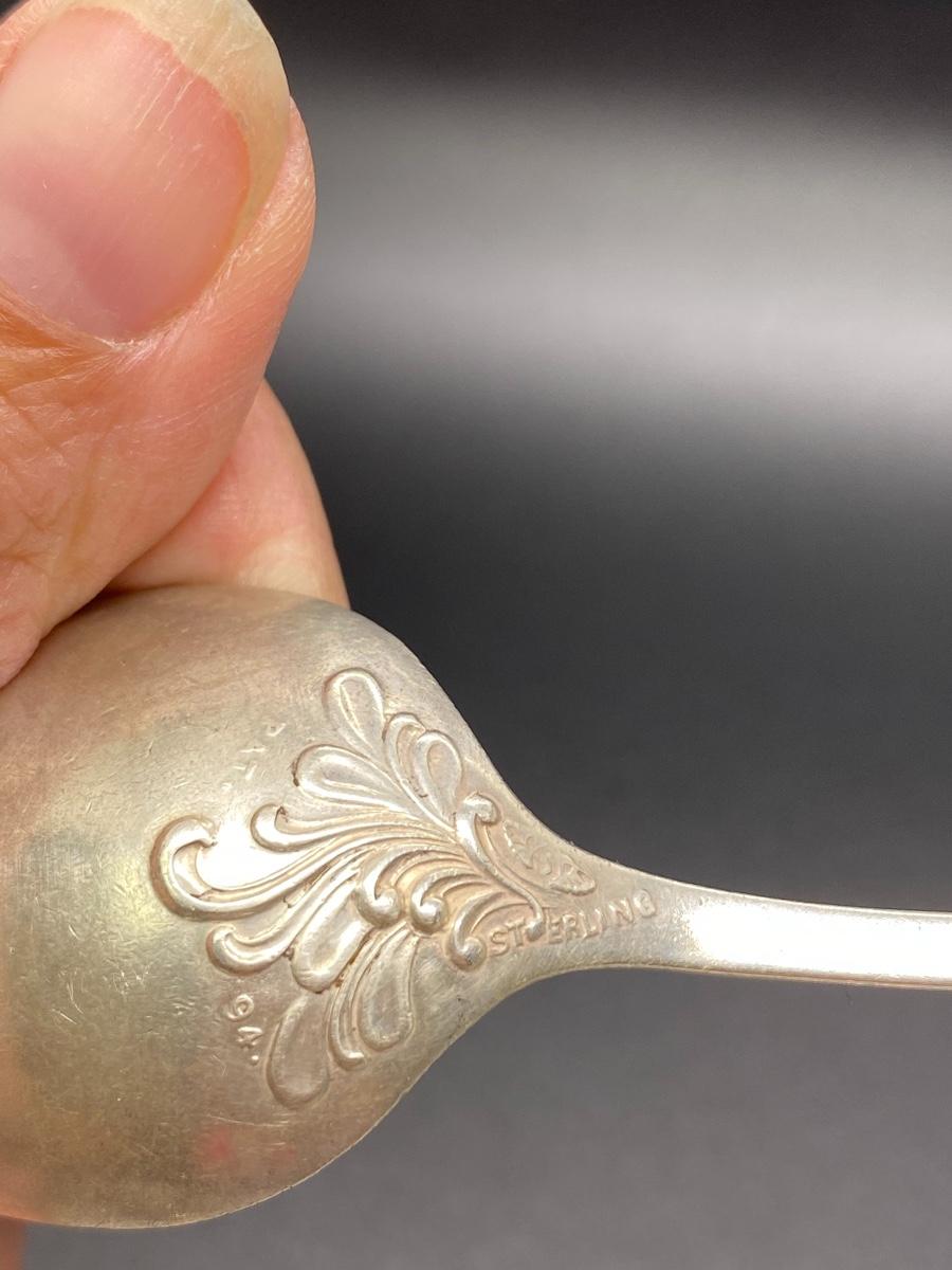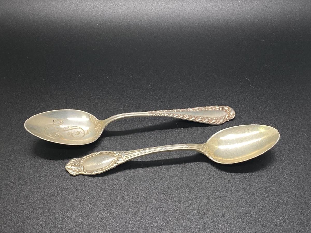 Pair of sterling silver dinner spoons. Both marked sterling. Good condition, great handle patterns. 61.6g tw.