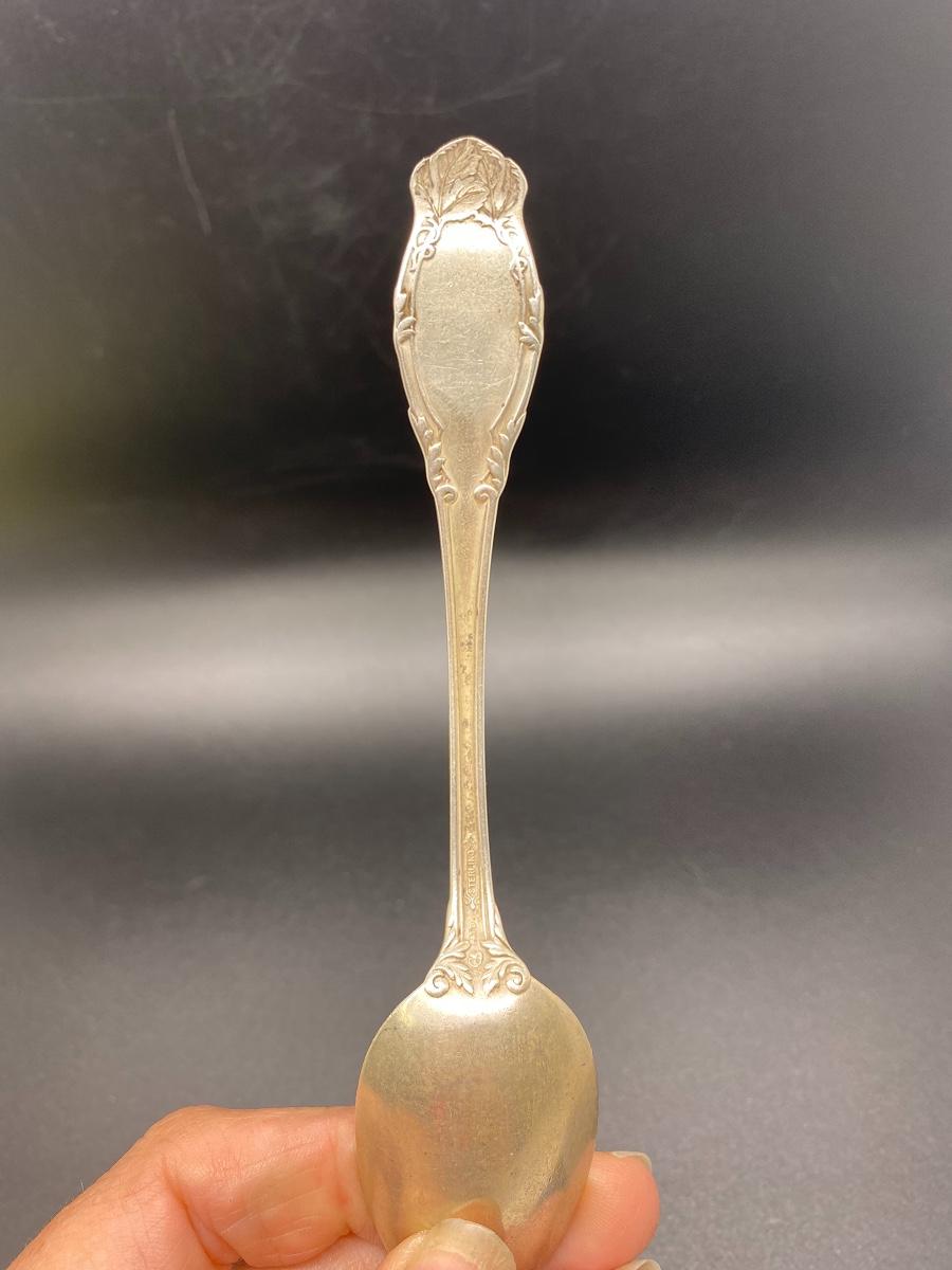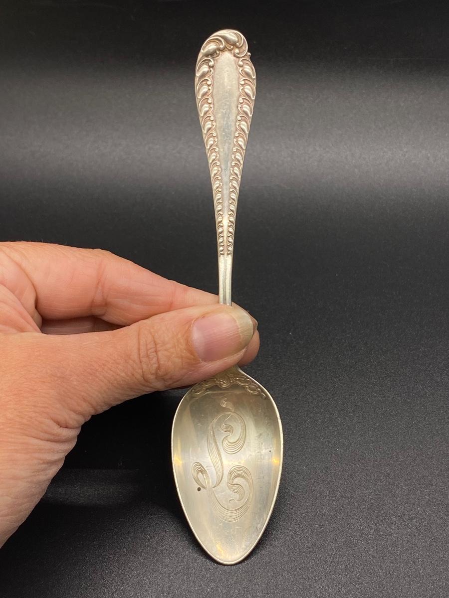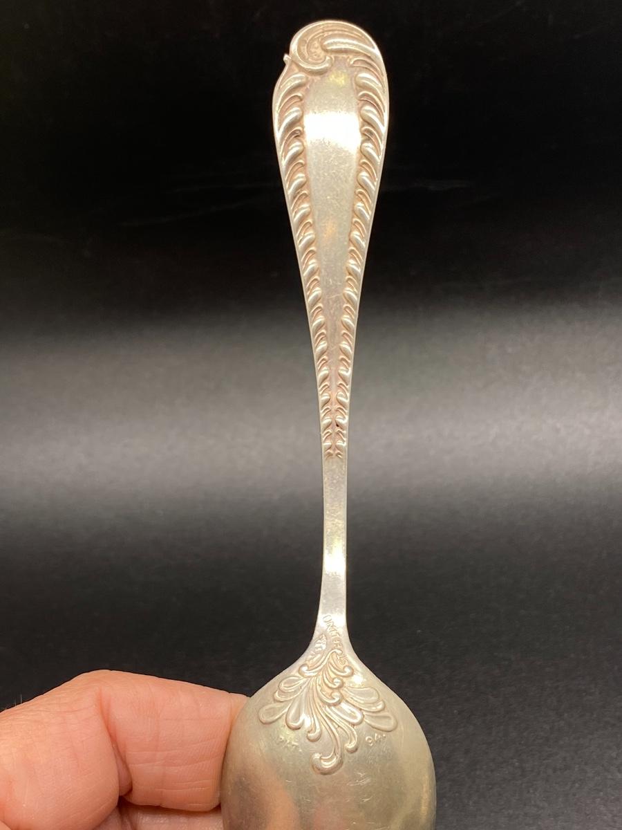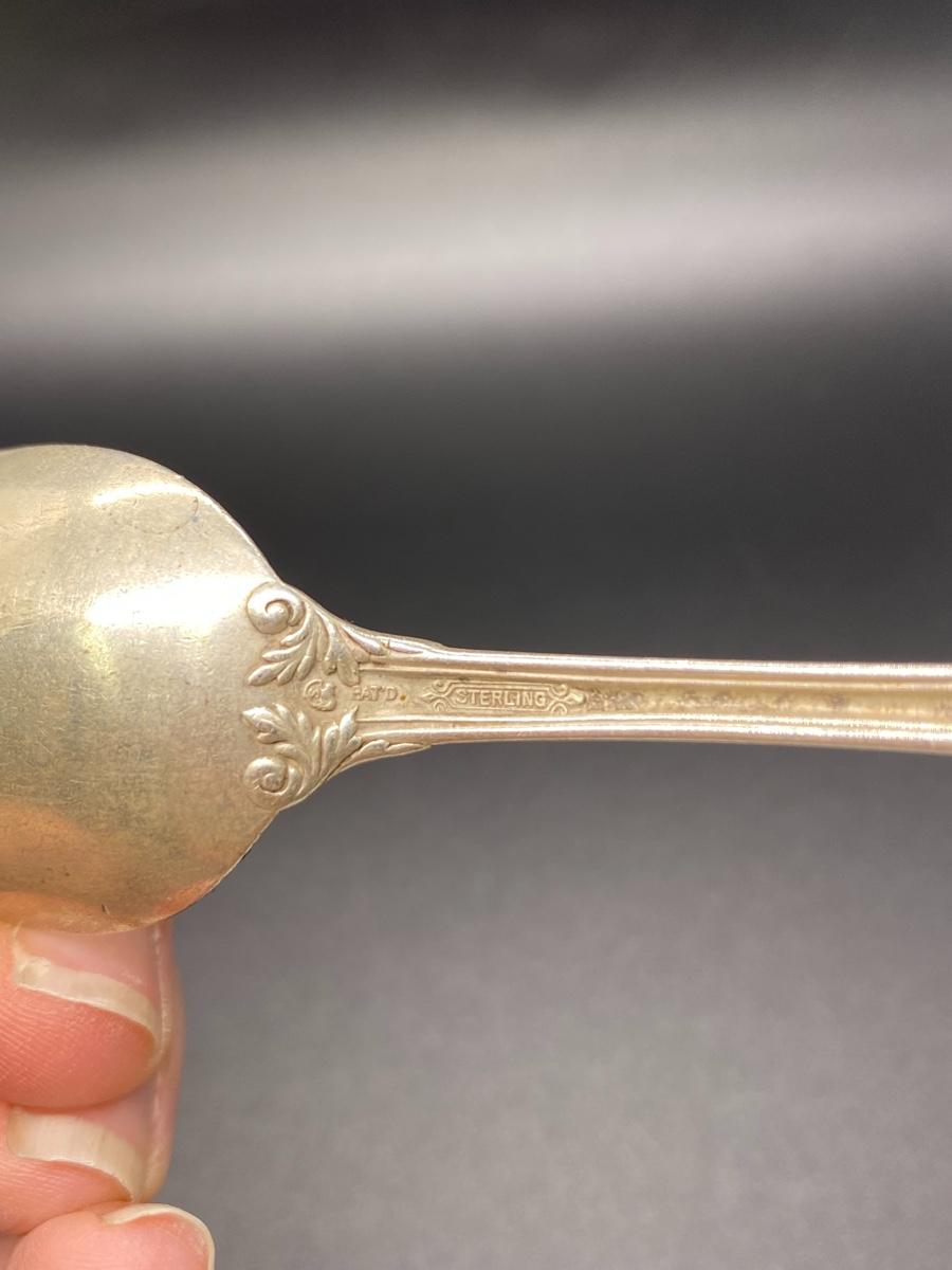 Pair of sterling silver dinner spoons. Both marked sterling. Good condition, great handle patterns. 61.6g tw.