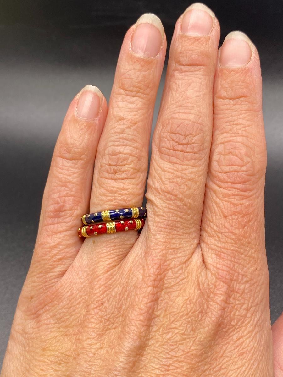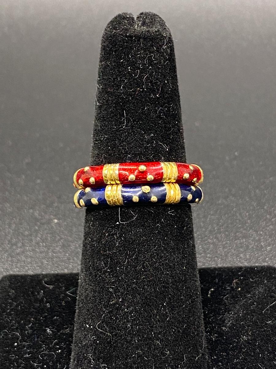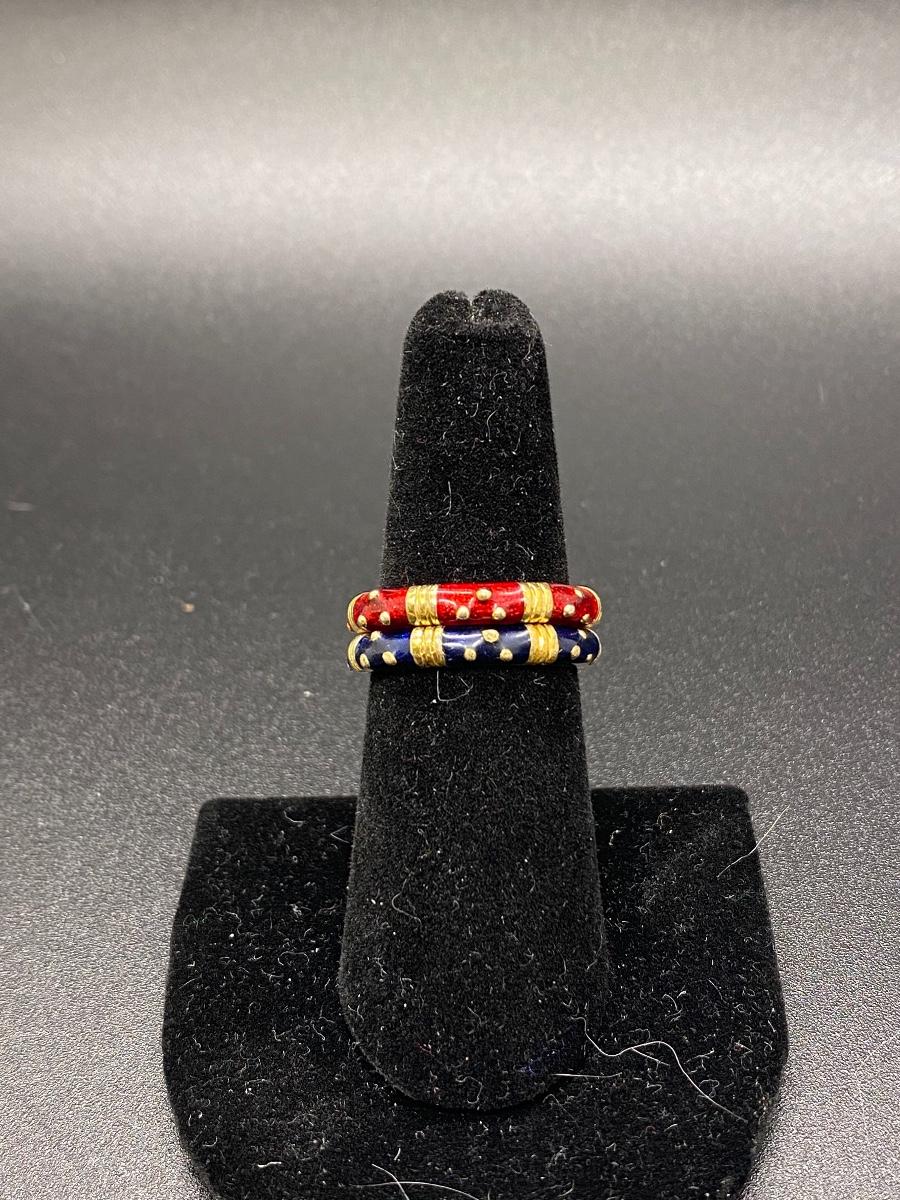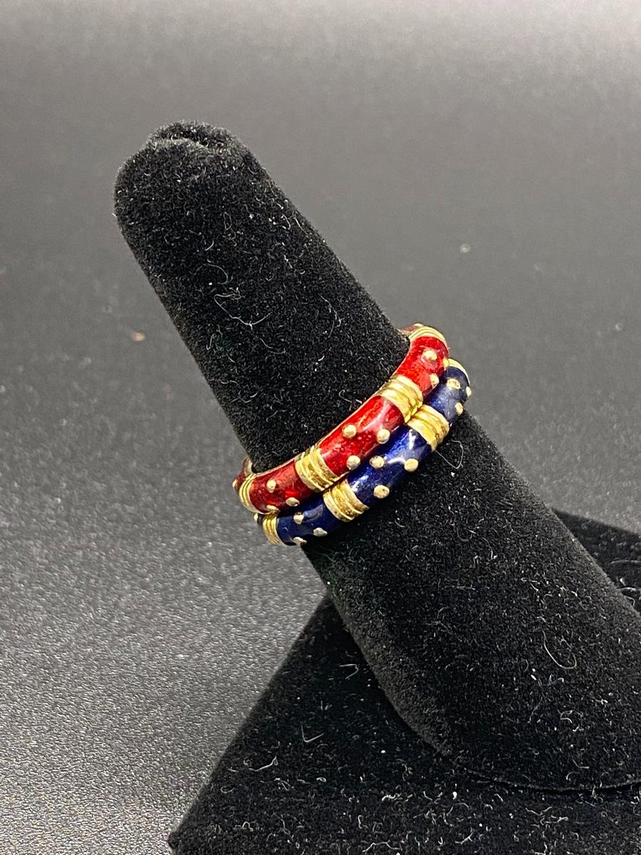 Red and navy enamel stacker rings. Goldtone metal. Wear together or separate. Fit like a 7.