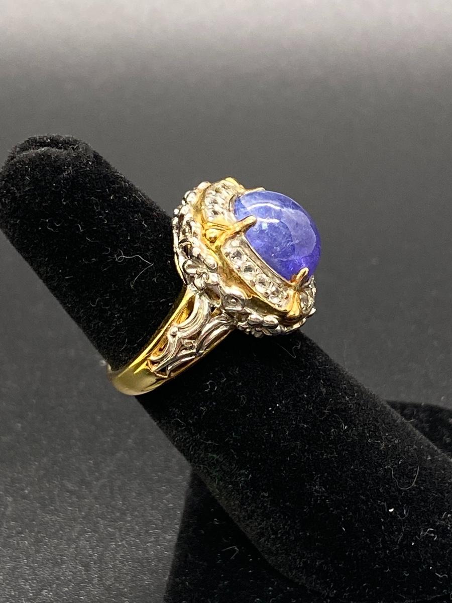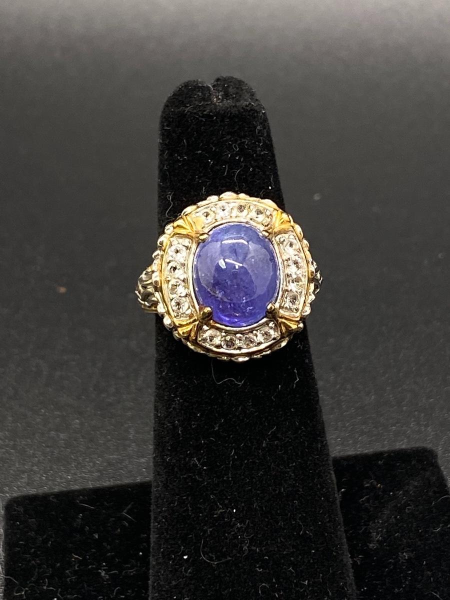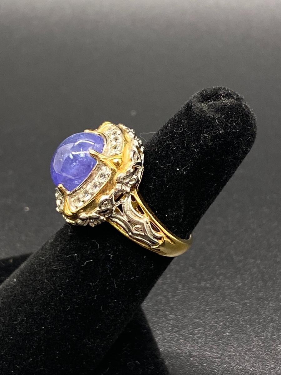 Gold over sterling cocktail ring. Stamped 925 on the inside, ring has gold and silver finishes. Violet blue cabochon center with CZ accents. Small fit, maybe a 5 or 5.5.