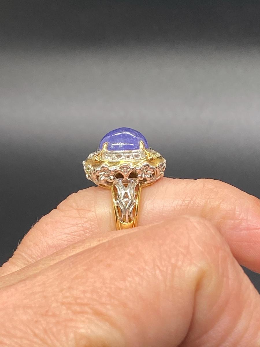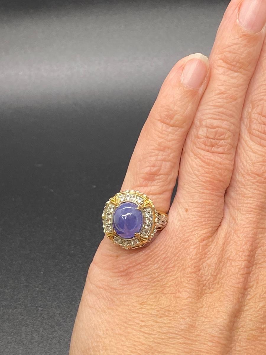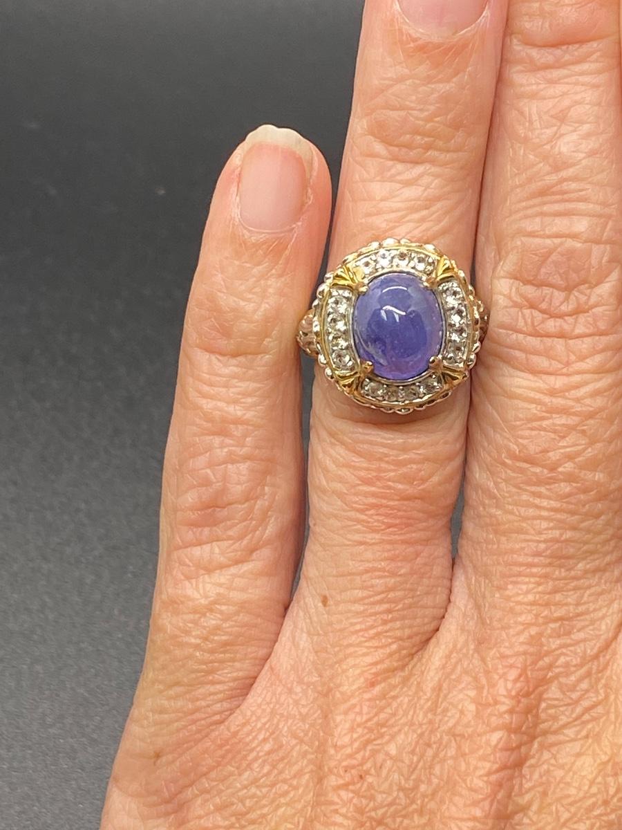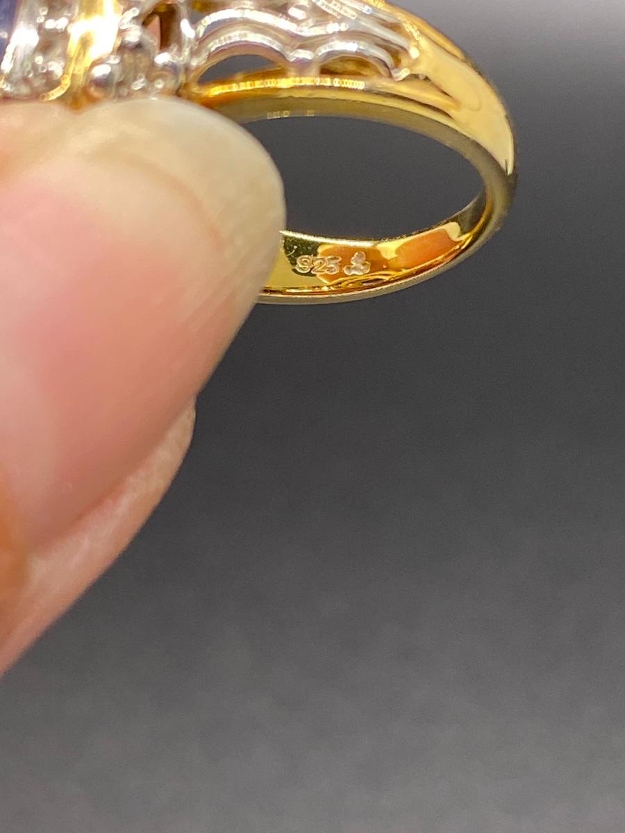Gold over sterling cocktail ring. Stamped 925 on the inside, ring has gold and silver finishes. Violet blue cabochon center with CZ accents. Small fit, maybe a 5 or 5.5.