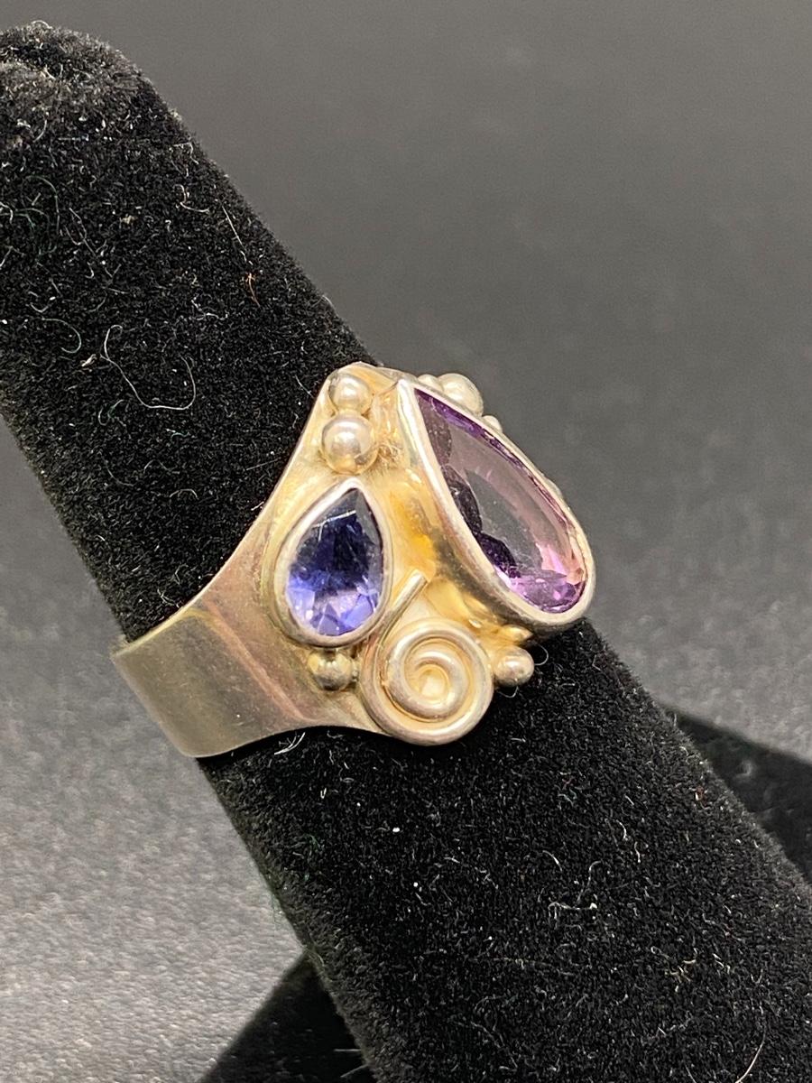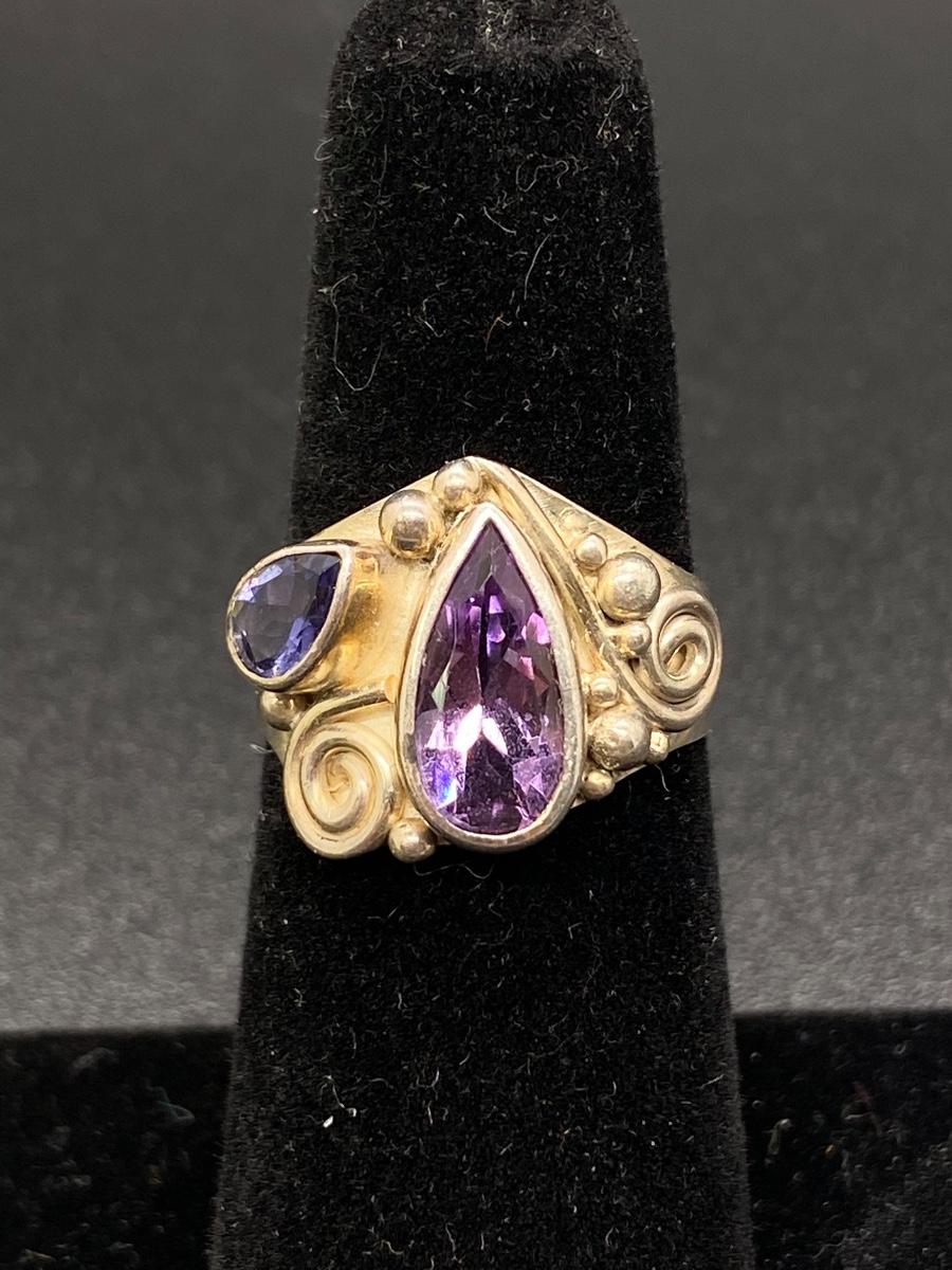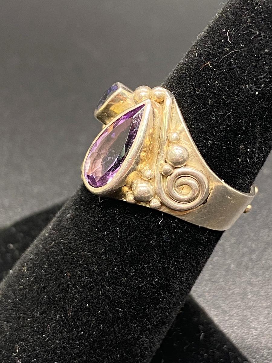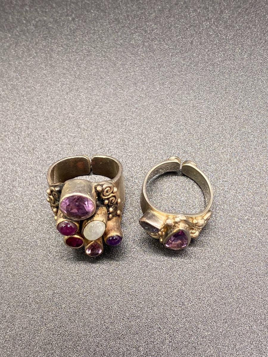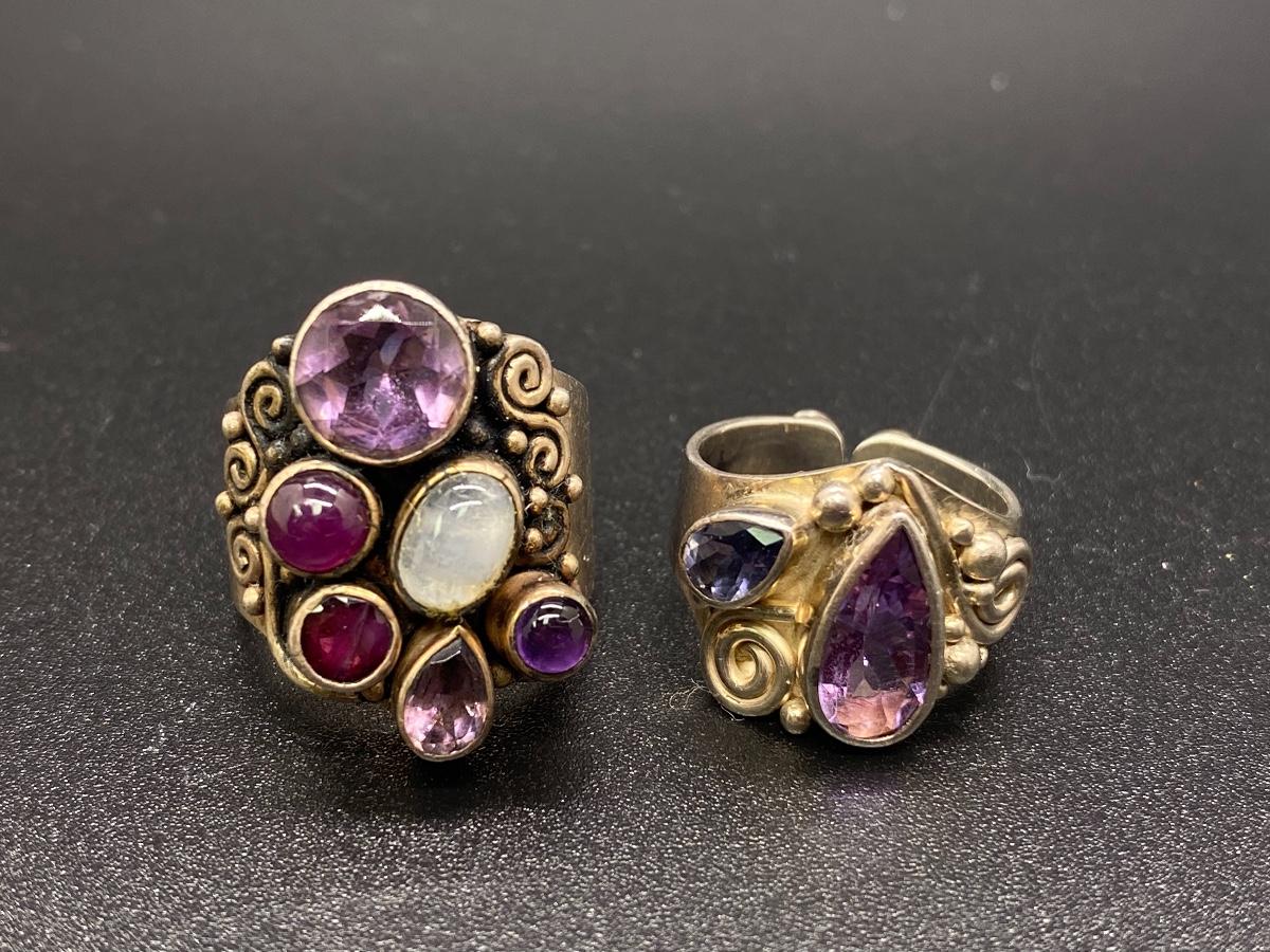 Pair of sterling silver and amethyst rings. Both can be sized. Cut gems and polished cabochon stones, variety of purple and violets. Currently around a size 6/7. Both are from Sajen.