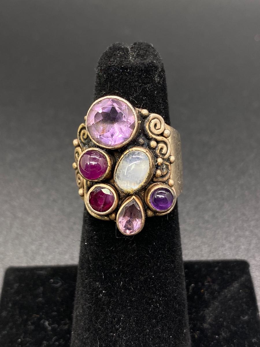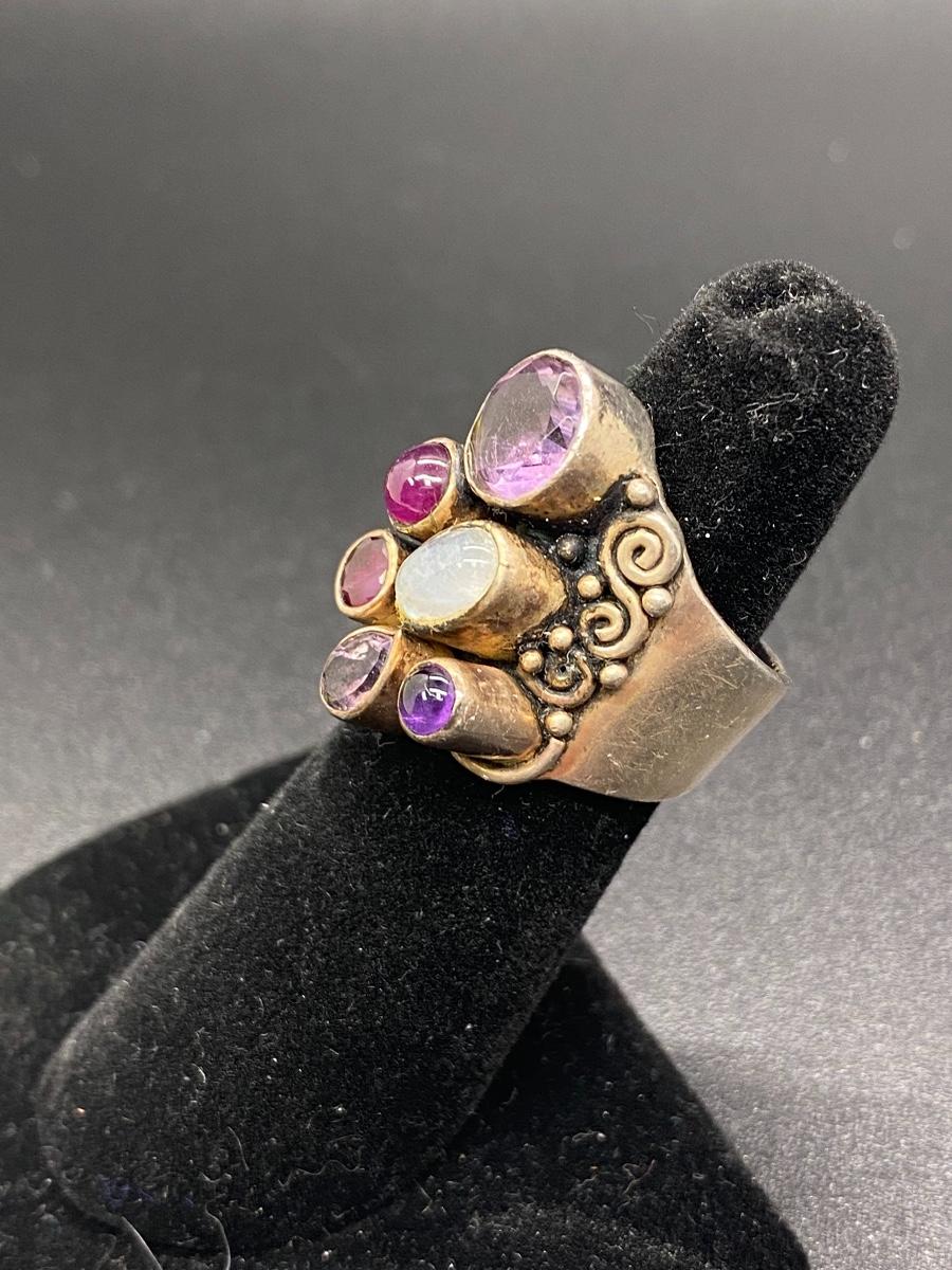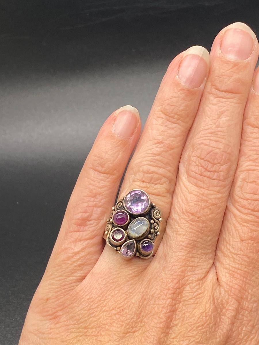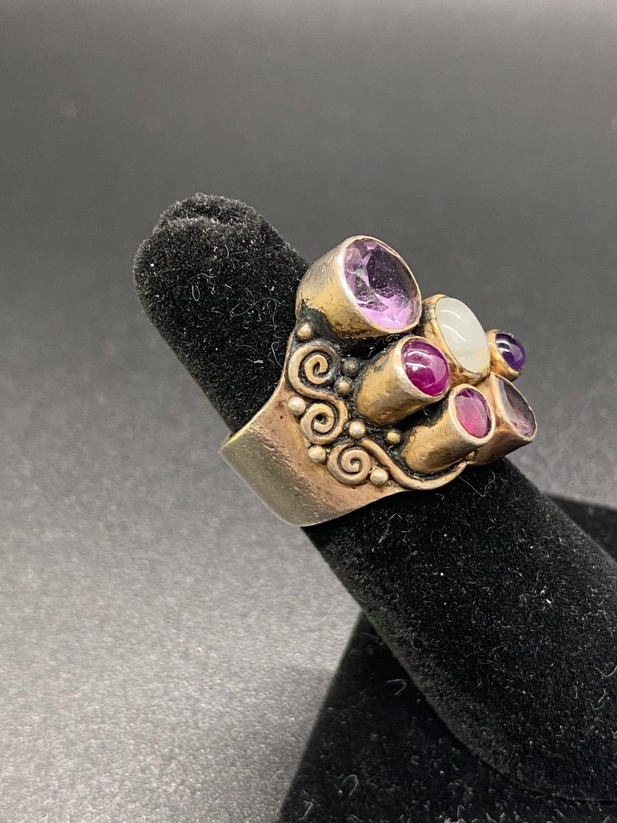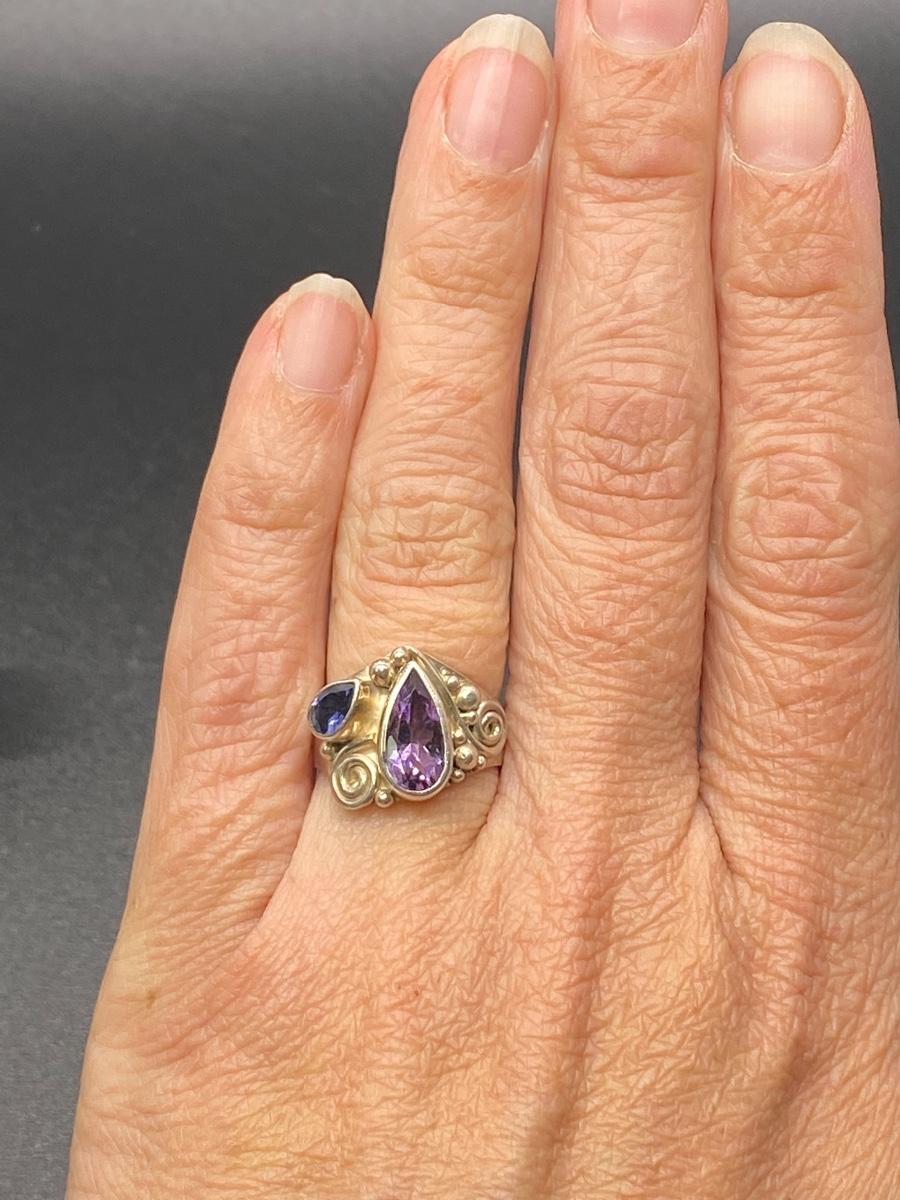 Pair of sterling silver and amethyst rings. Both can be sized. Cut gems and polished cabochon stones, variety of purple and violets. Currently around a size 6/7. Both are from Sajen.