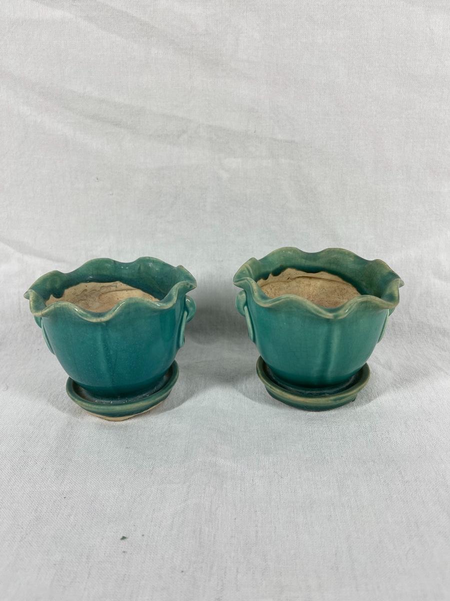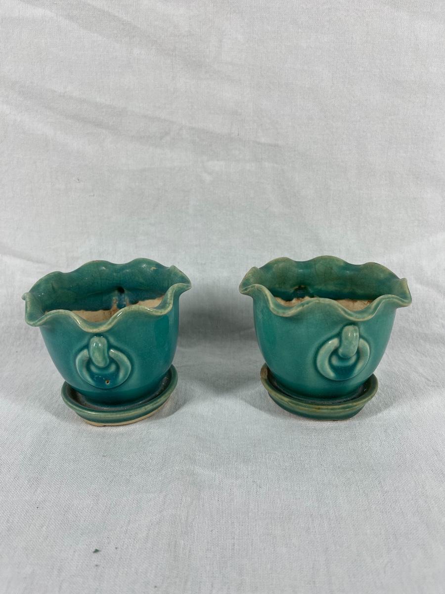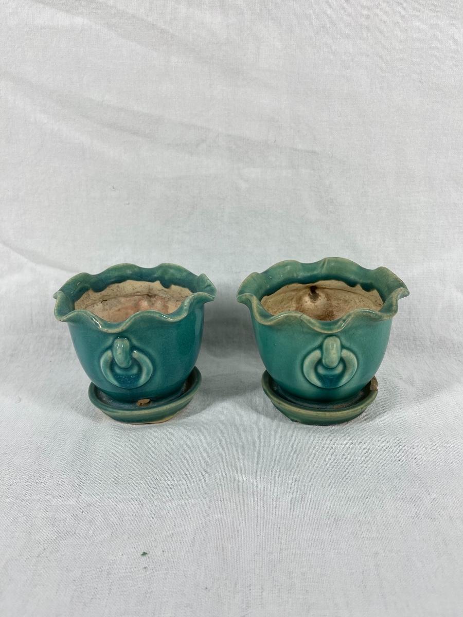 Pair of vintage green glaze ruffled planter pots. Small 3" size. Small chip in the edge. See photos.