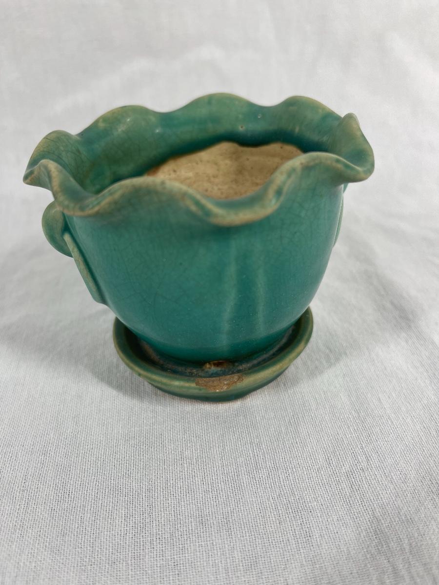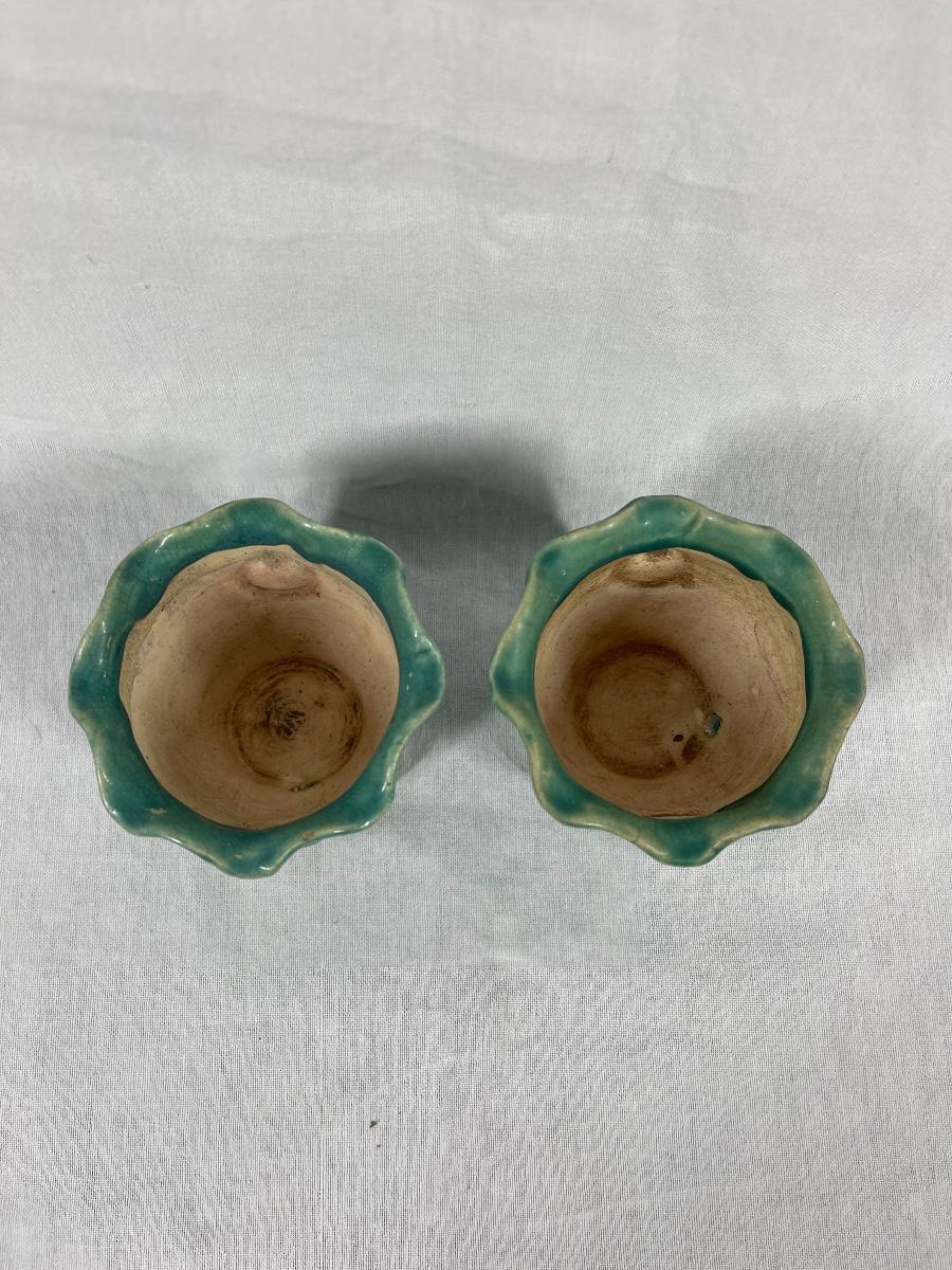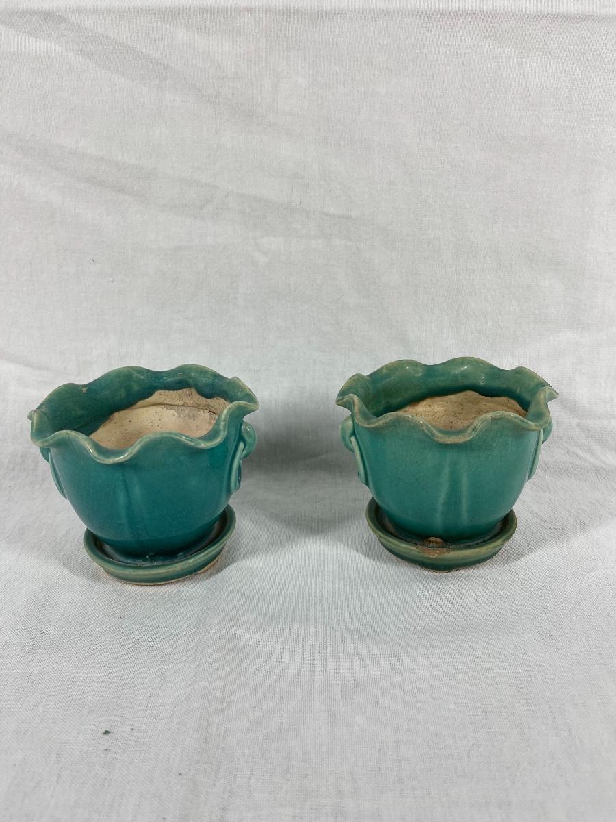 Pair of vintage green glaze ruffled planter pots. Small 3" size. Small chip in the edge. See photos.