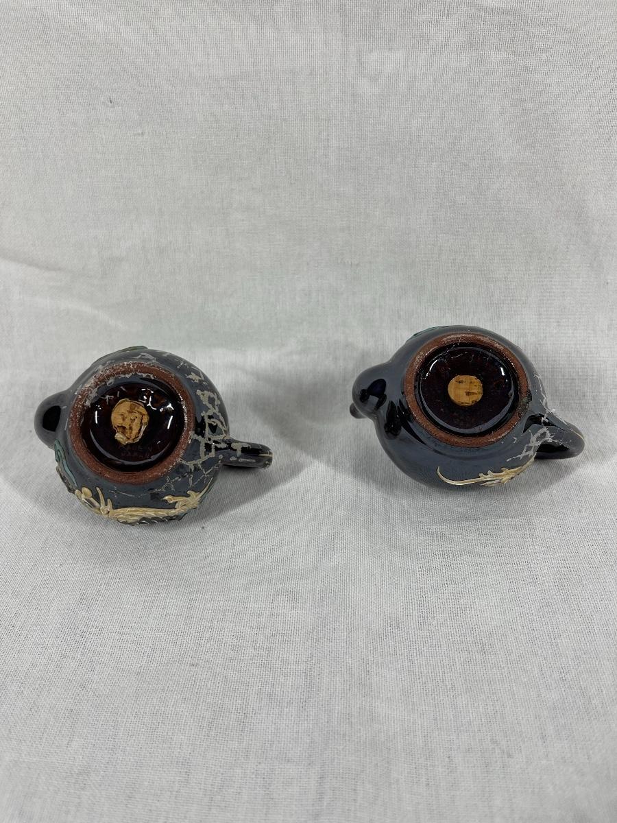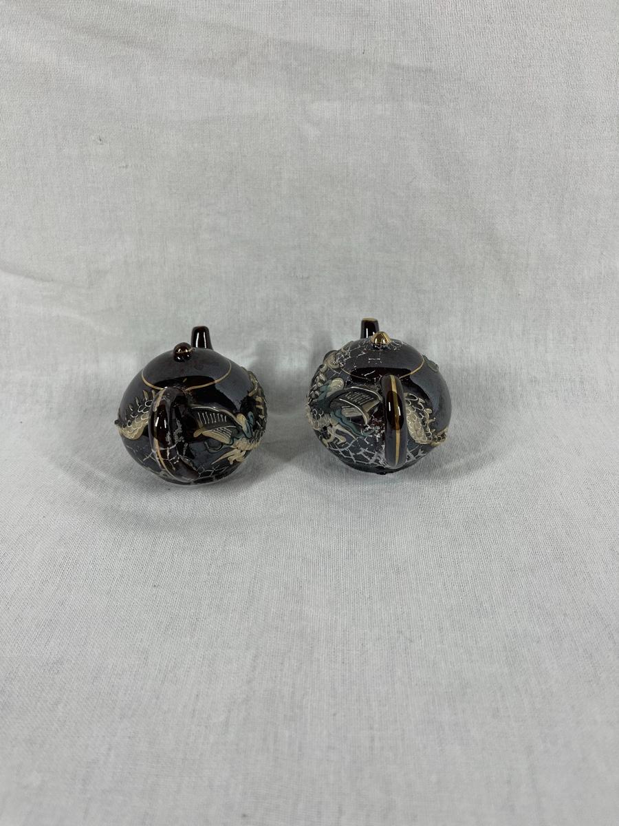 Pair of small tea pot shaped dragonware salt and pepper shakers. Good condition.