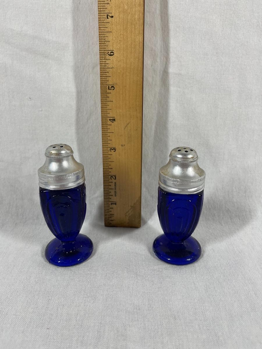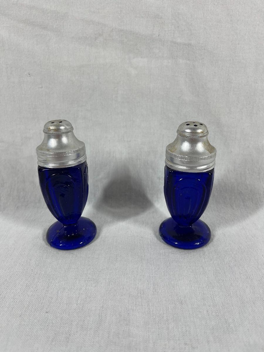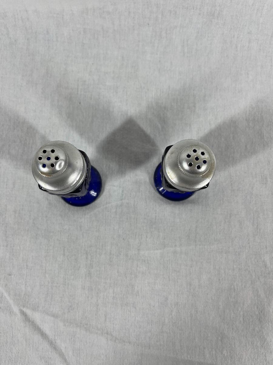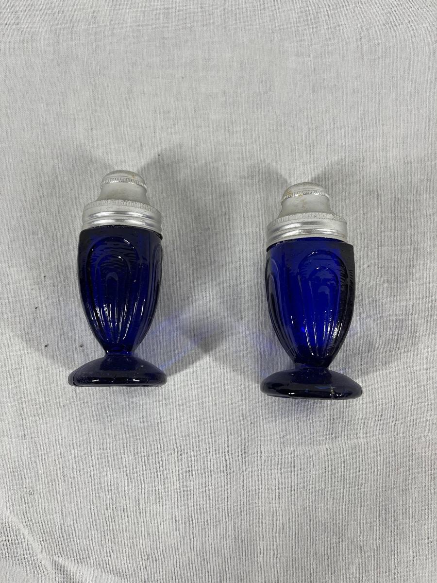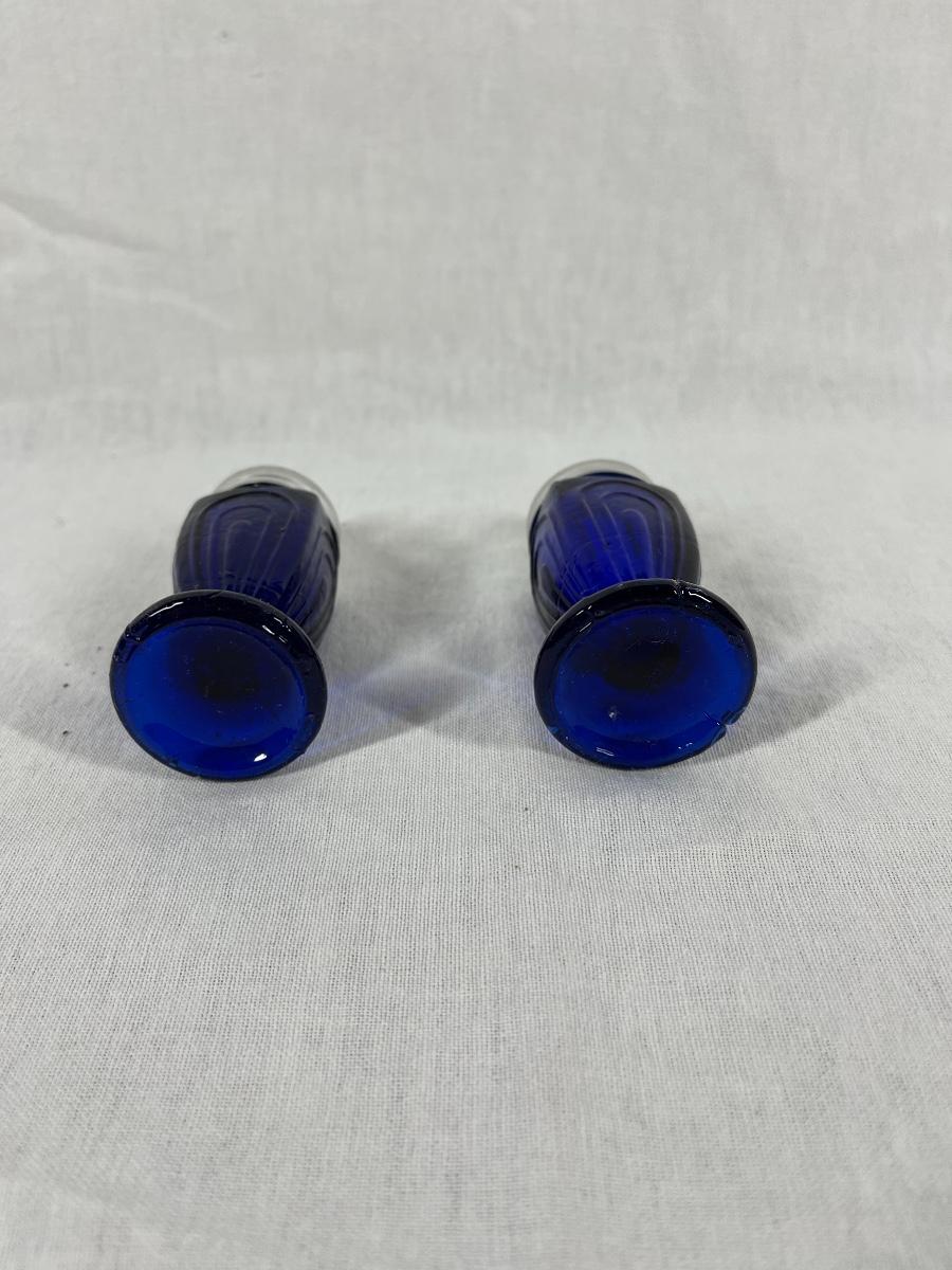 Pair of cobalt blue glass salt and pepper shakers. Good condition, about 3" size.
