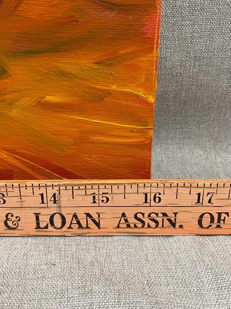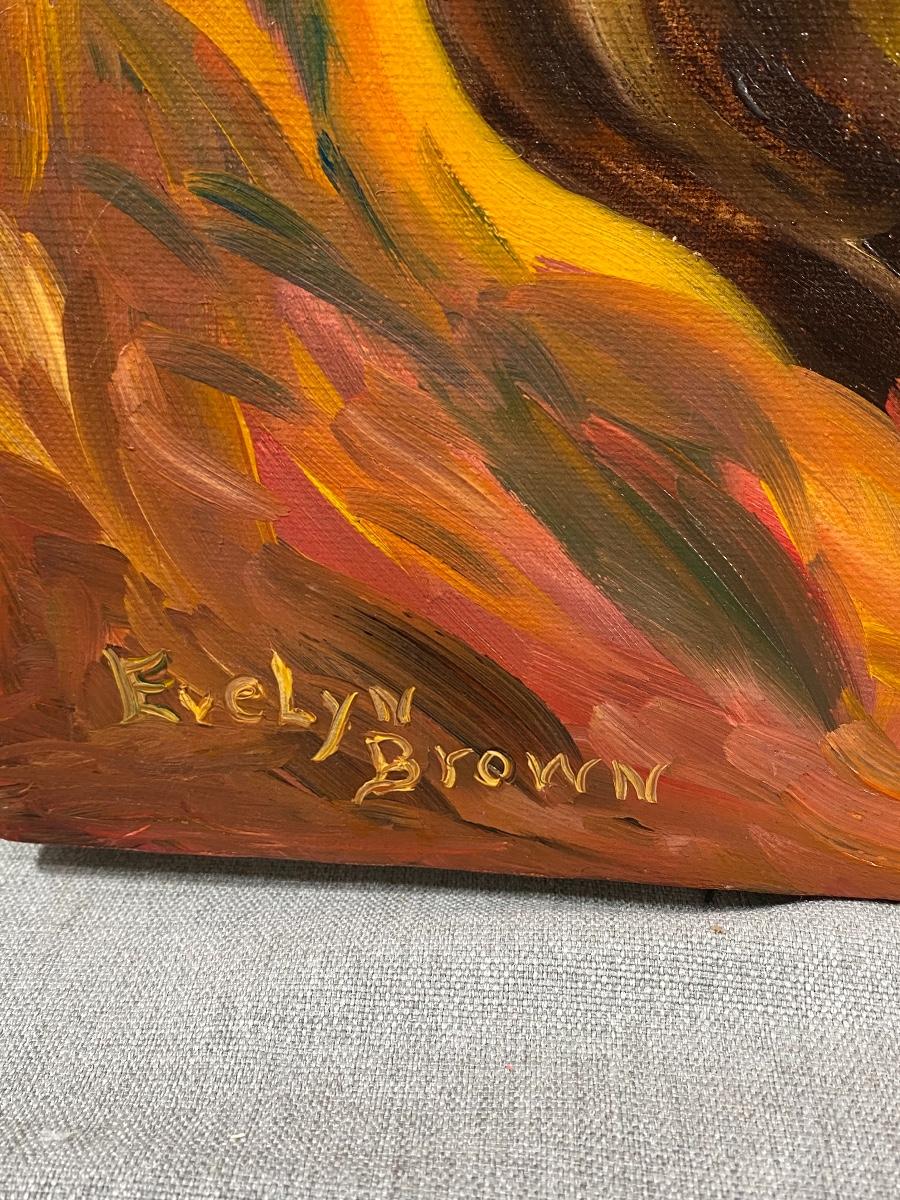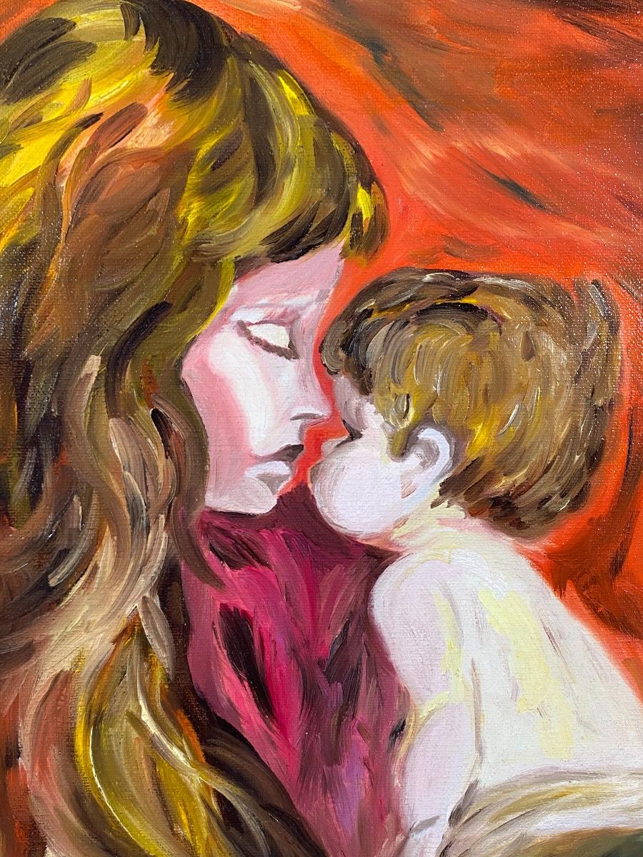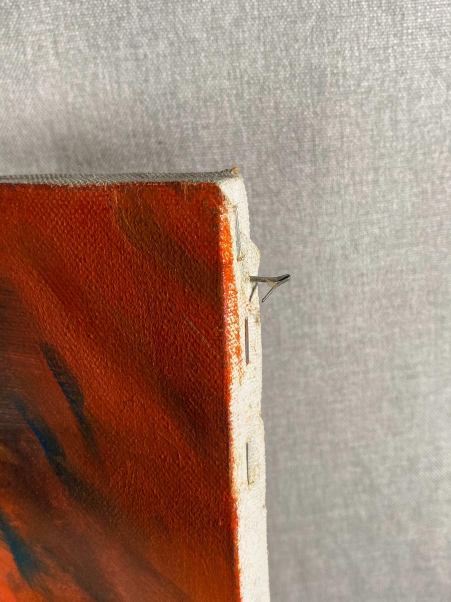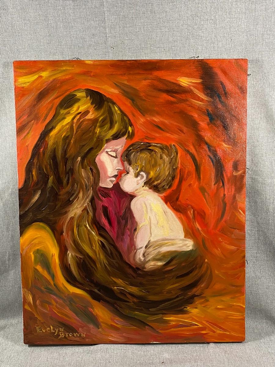 Mother & child painting by previous owner. Rusty orange and brown colors. Unframed. There is some staples in the sides sticking out it may have been framed at one time. Good condition.