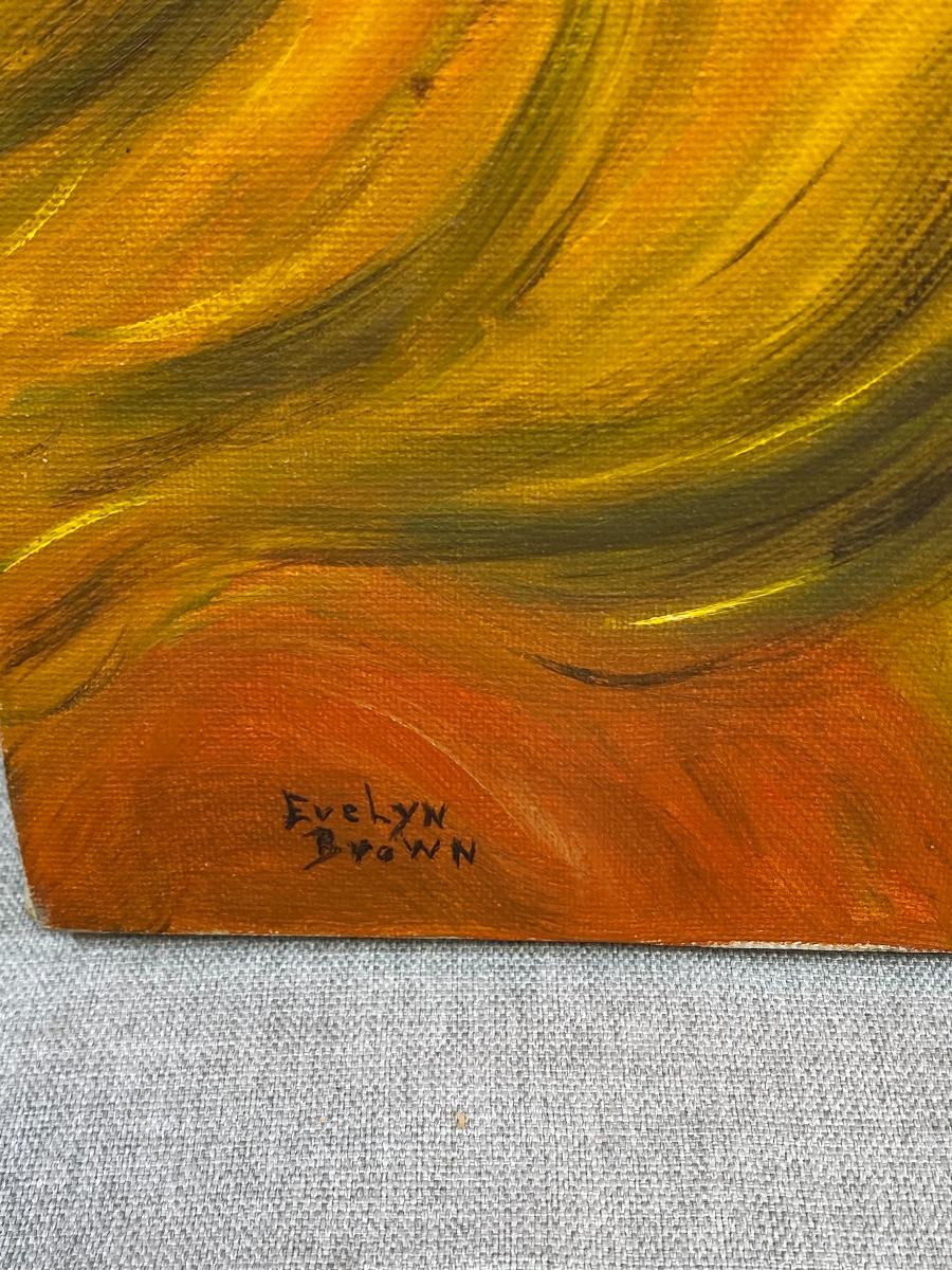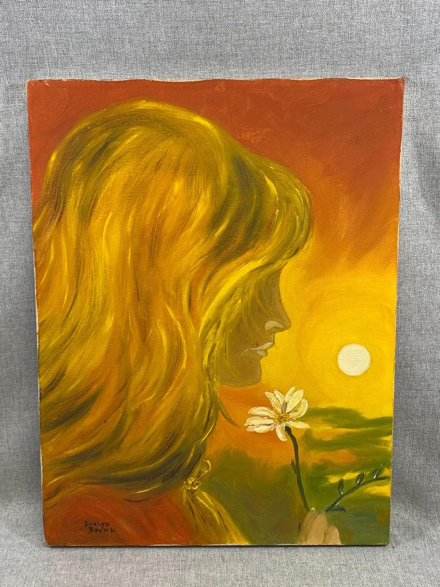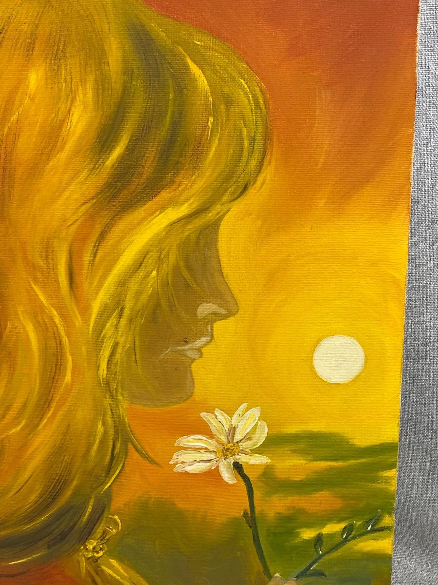 Vintage painting by previous owner. Vibrant orange and yellows, a girl with flower. Unframed. Dated 1967.