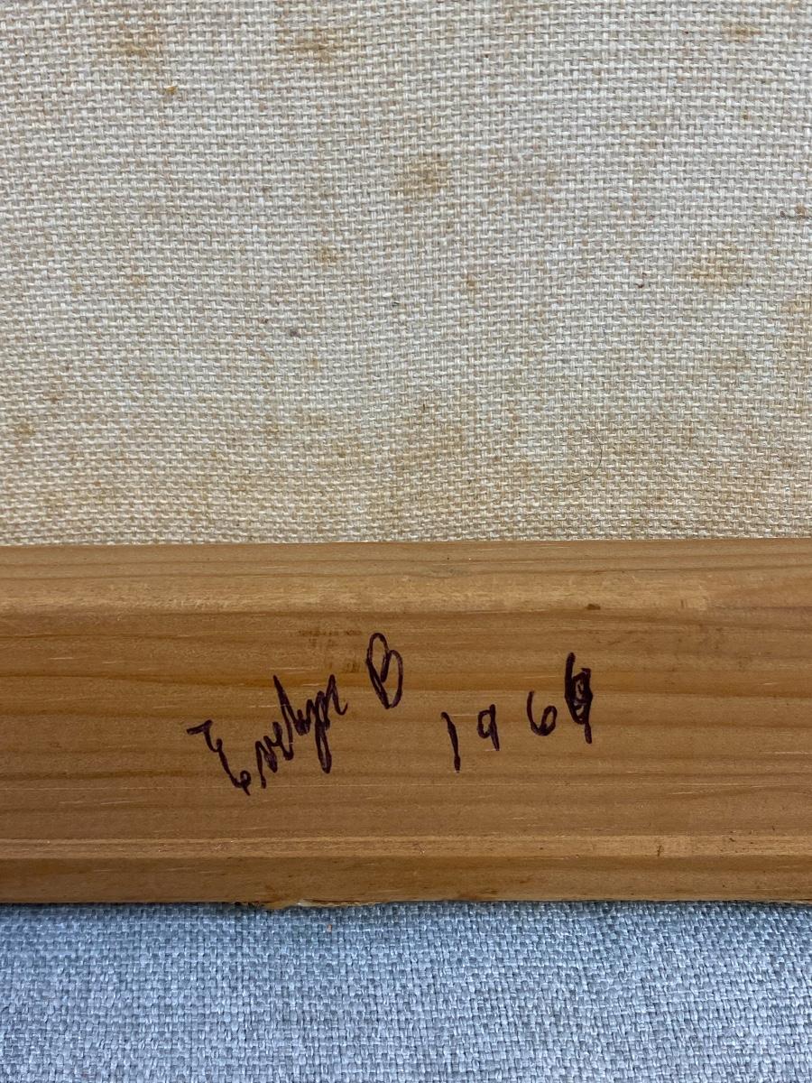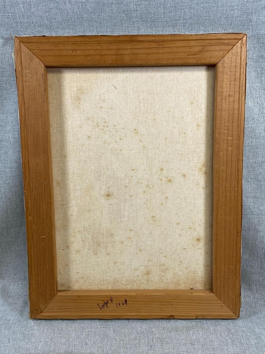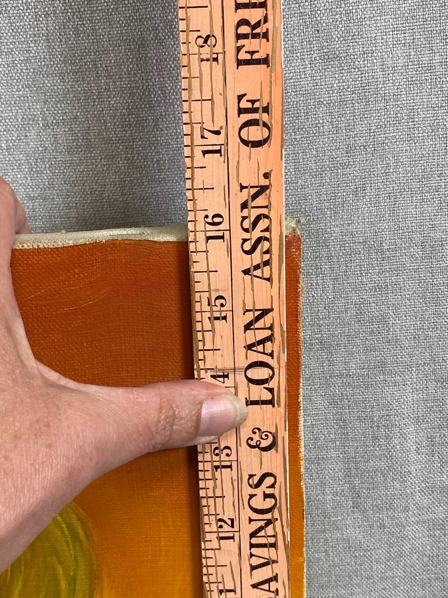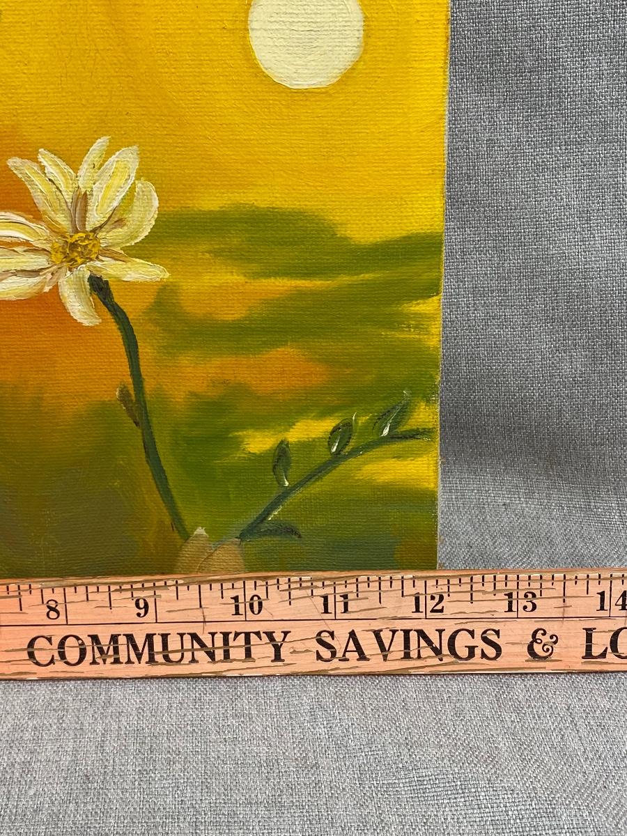 Vintage painting by previous owner. Vibrant orange and yellows, a girl with flower. Unframed. Dated 1967.