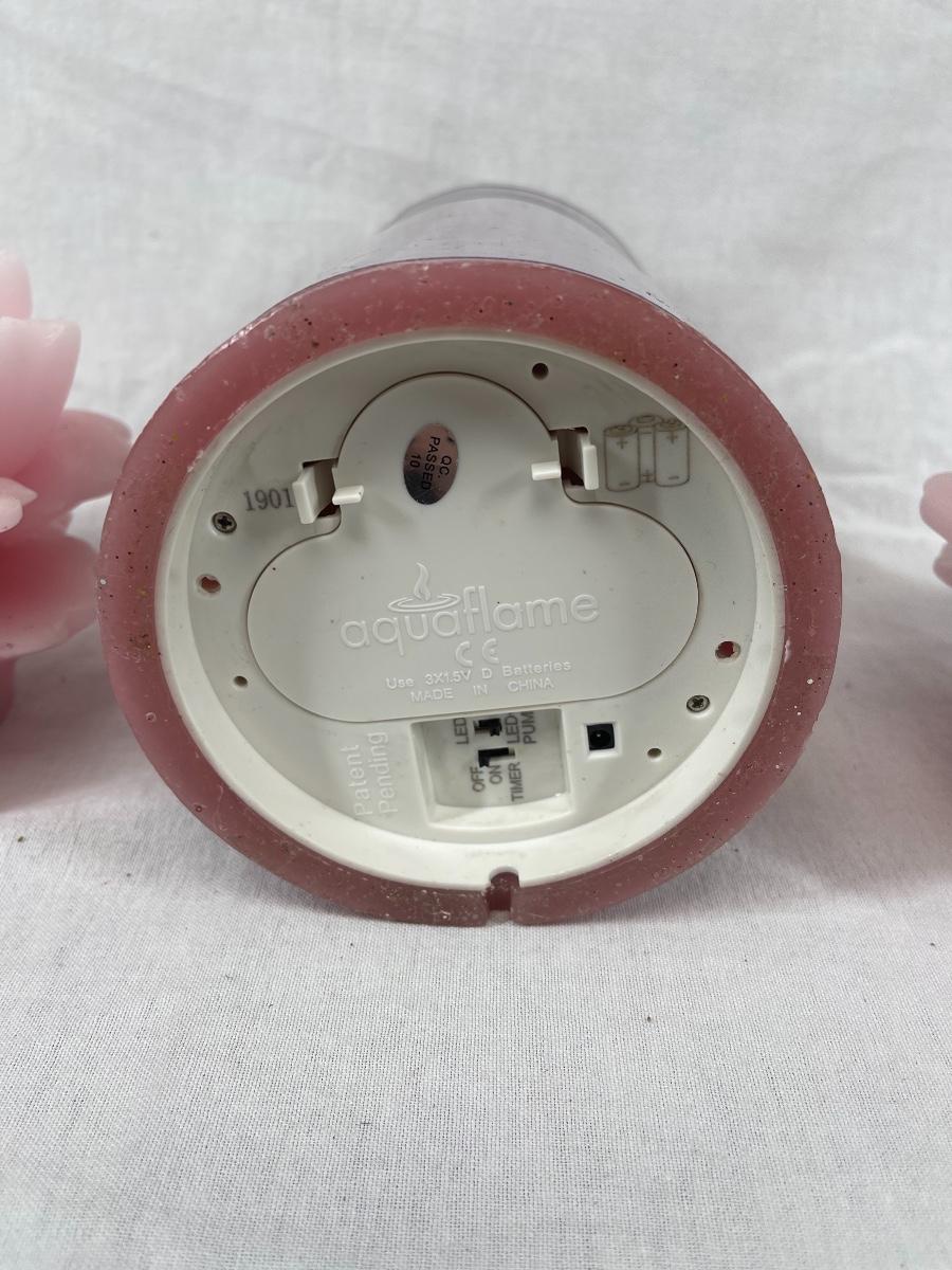 Lot of pink candles. Two flower shaped candles and an electric candle.