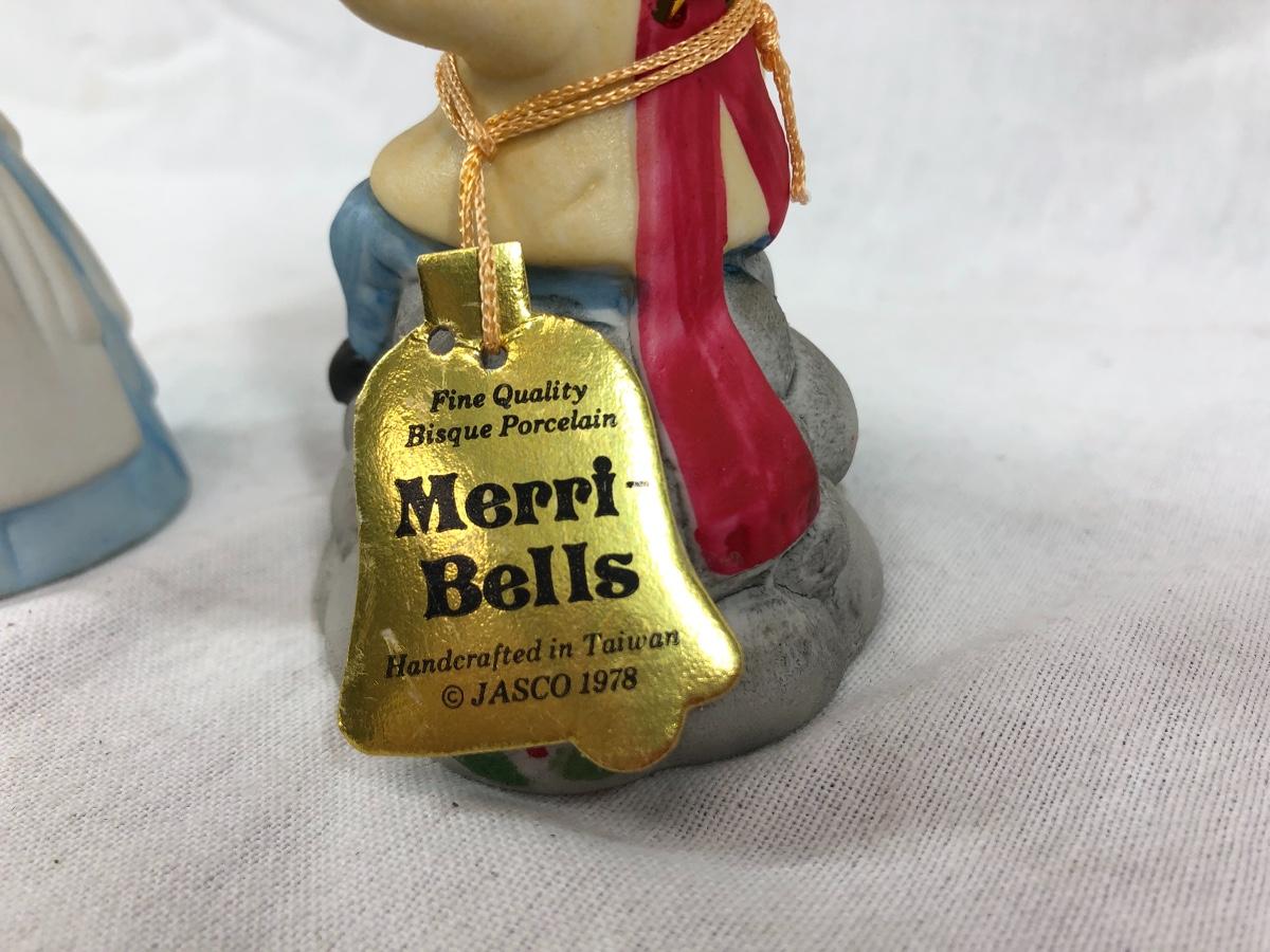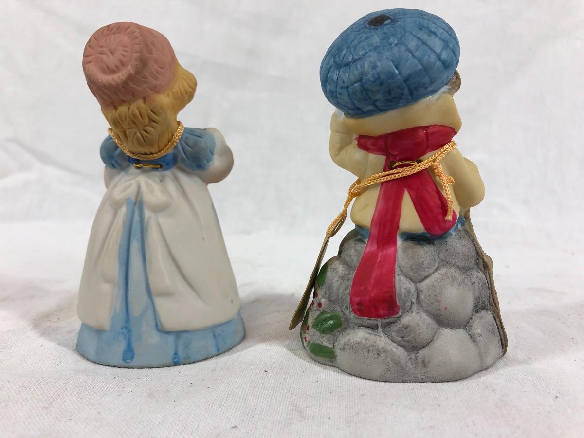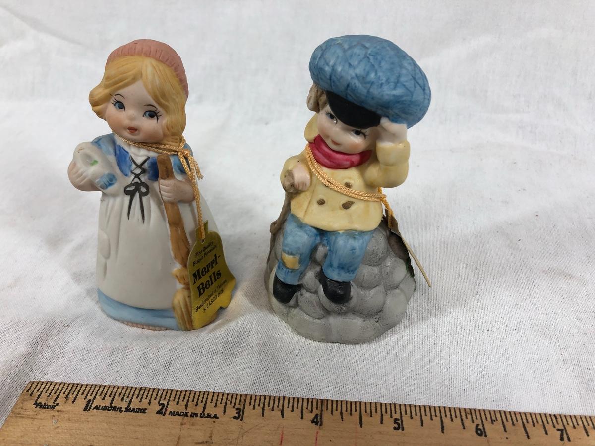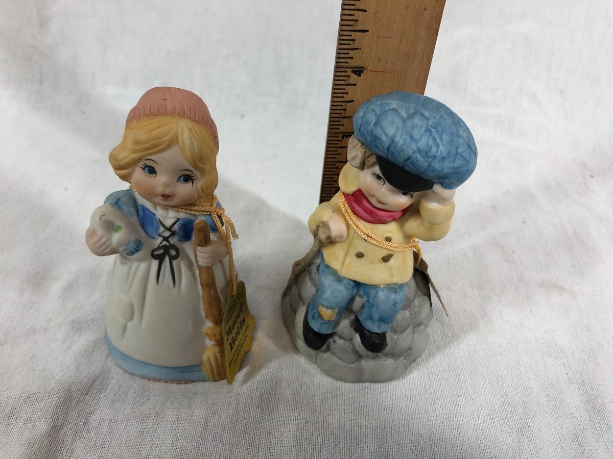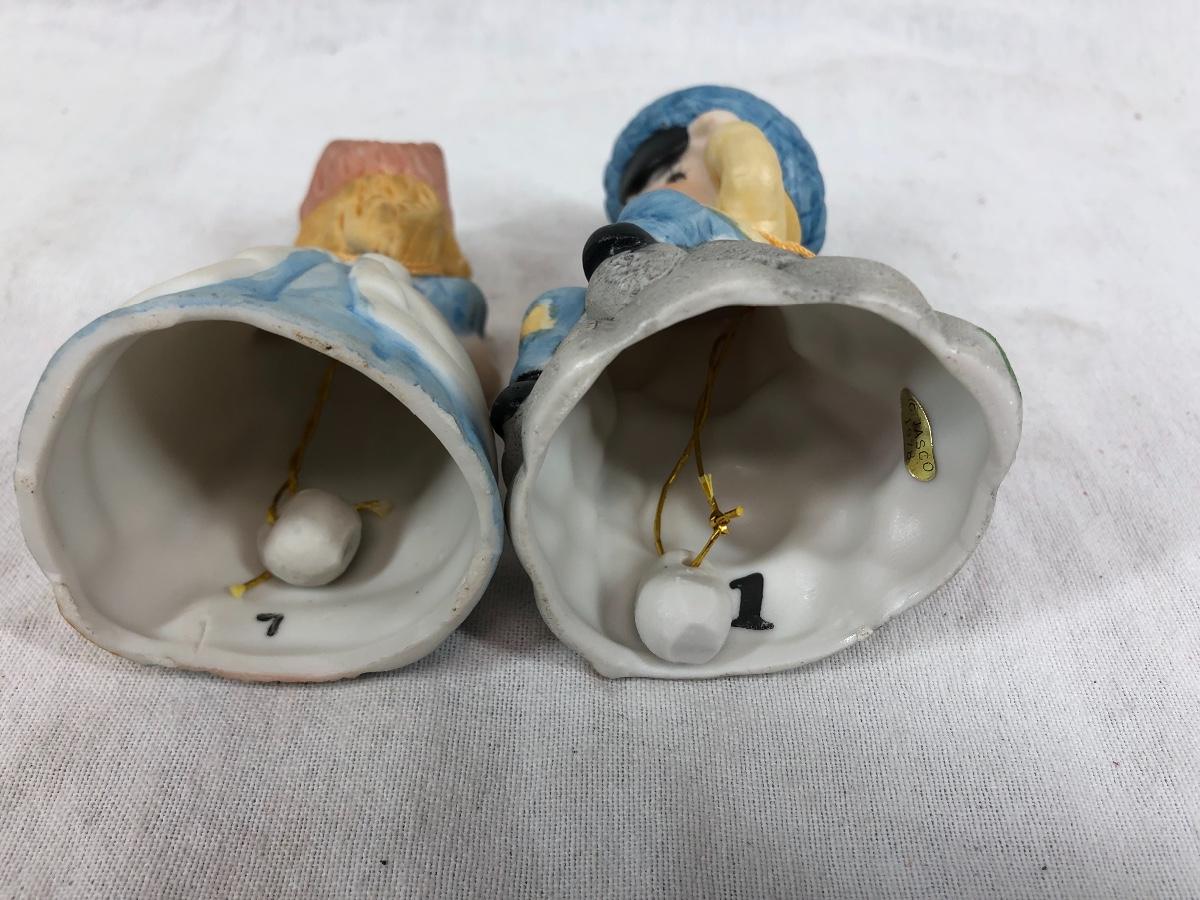 Pair of Merri-Belle bisque porcelain figurine bells, made by JASCO in Taiwan in 1978. Approx. 4” tall.