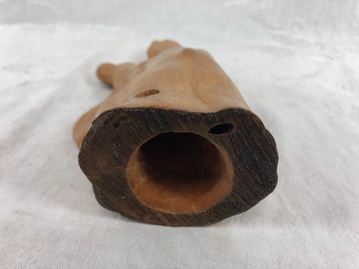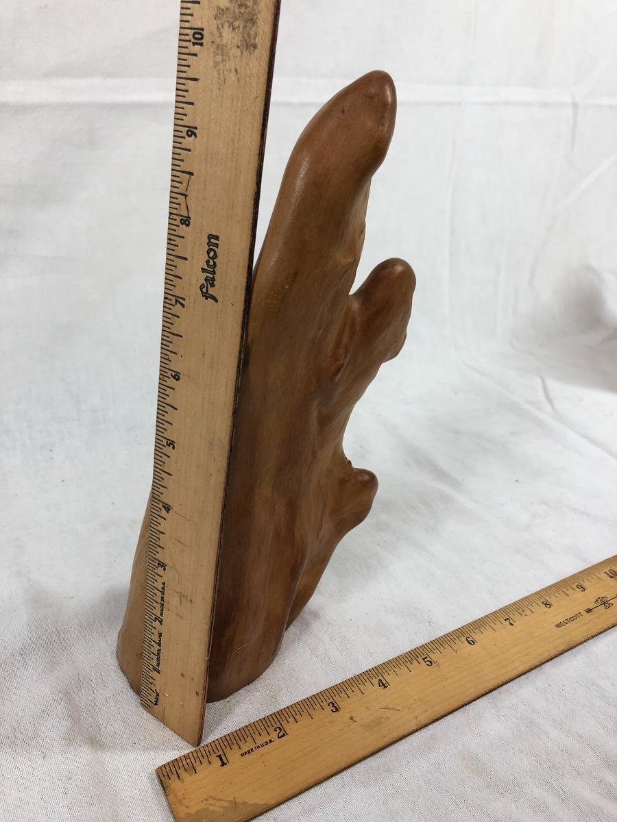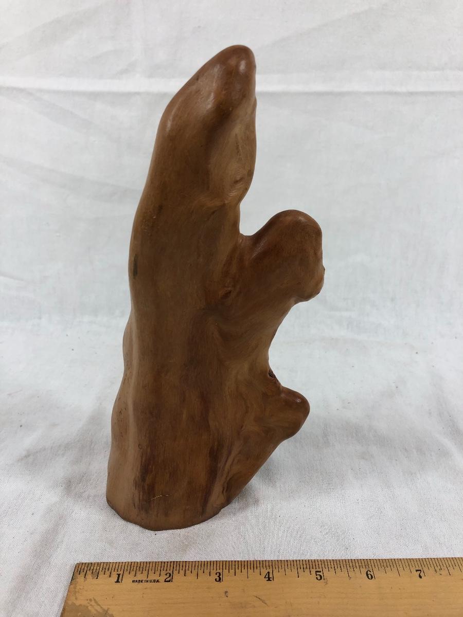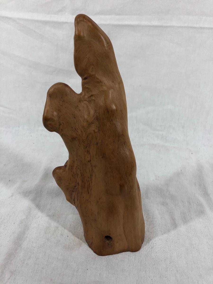 Neat finish abstract piece of wood. Center hole drill in the bottom and a small hole on side, may have been made to use as a cane handle. Great for repurpose or as an abstract art piece. About 10" length.