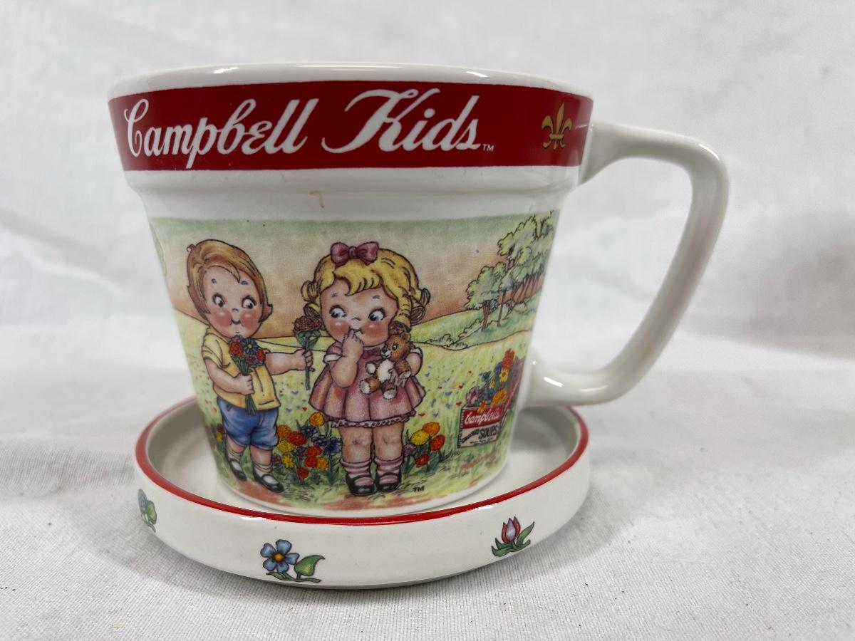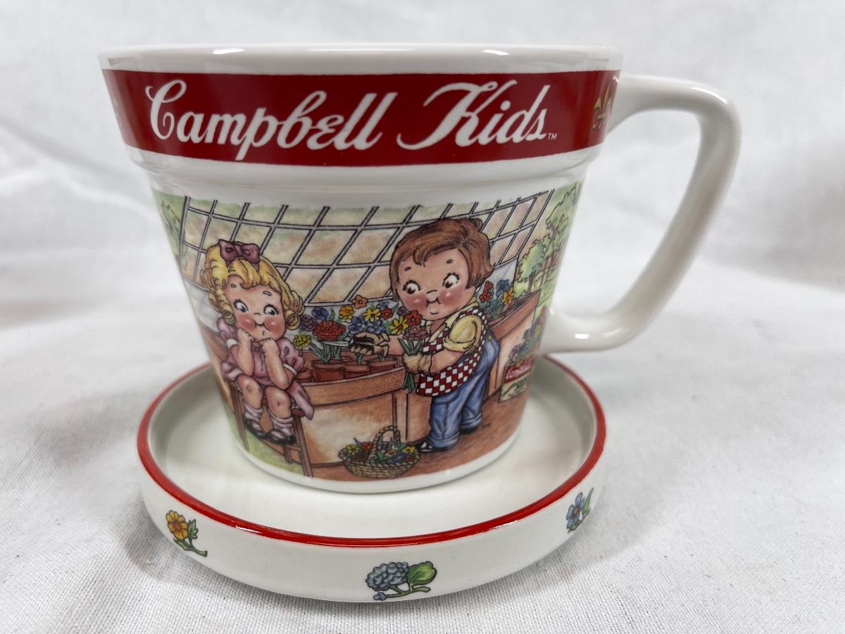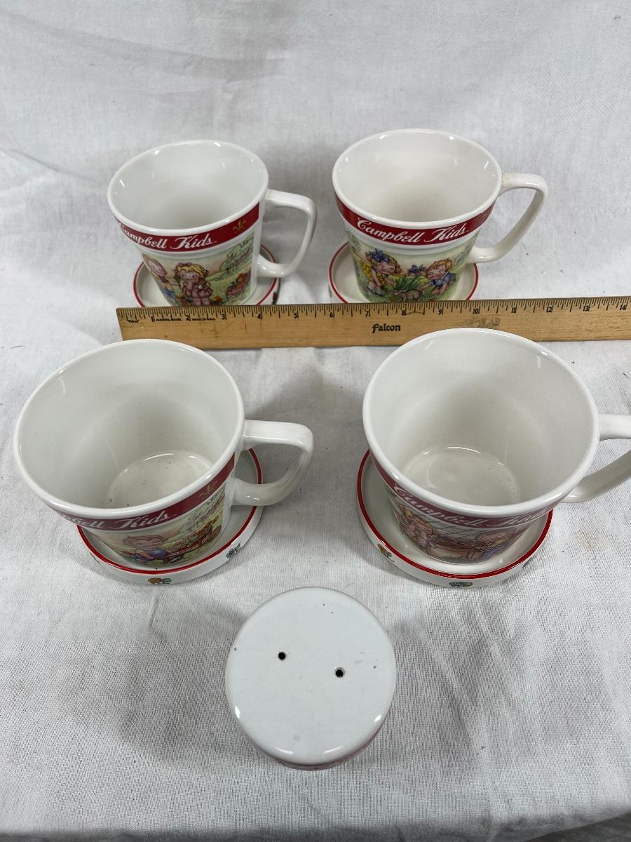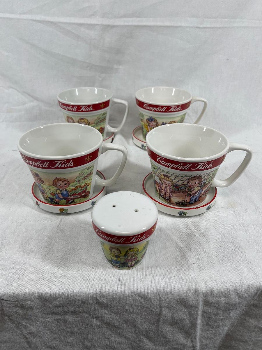 Set of 4 Campbell Soup mugs and saucers with bonus pepper shaker. Good condition.