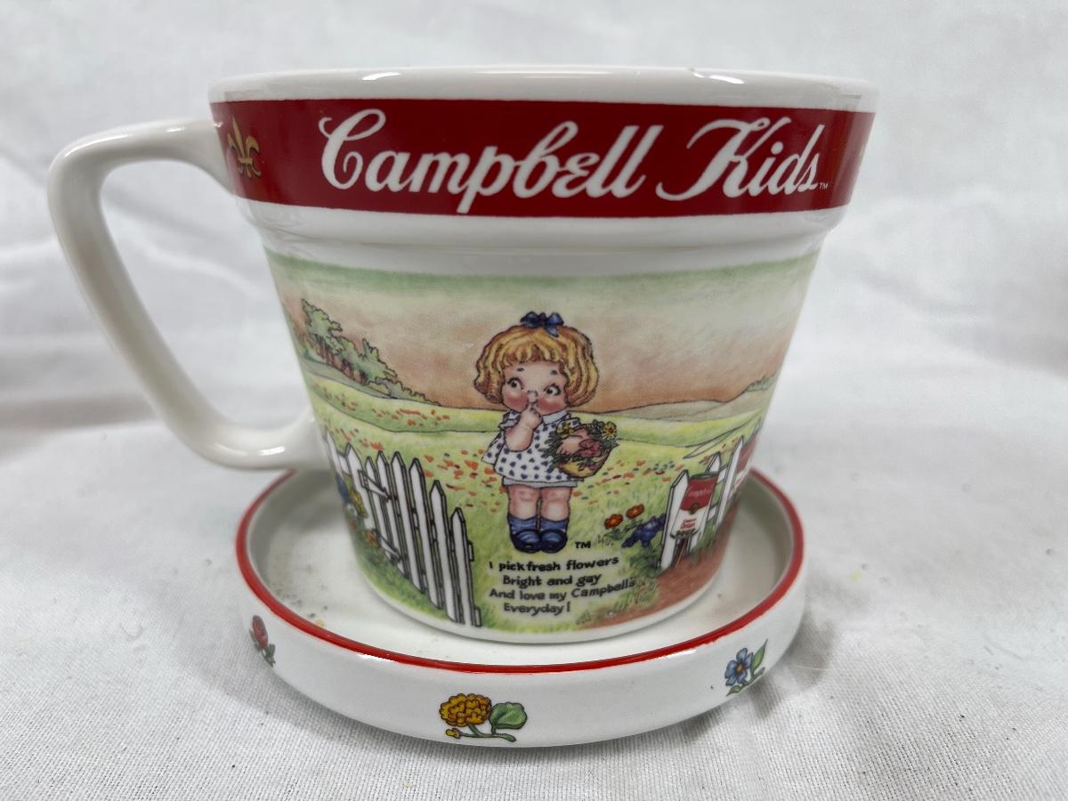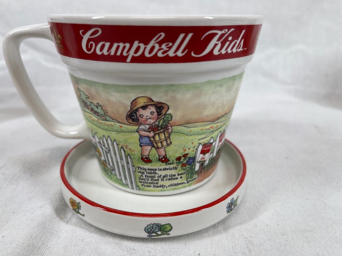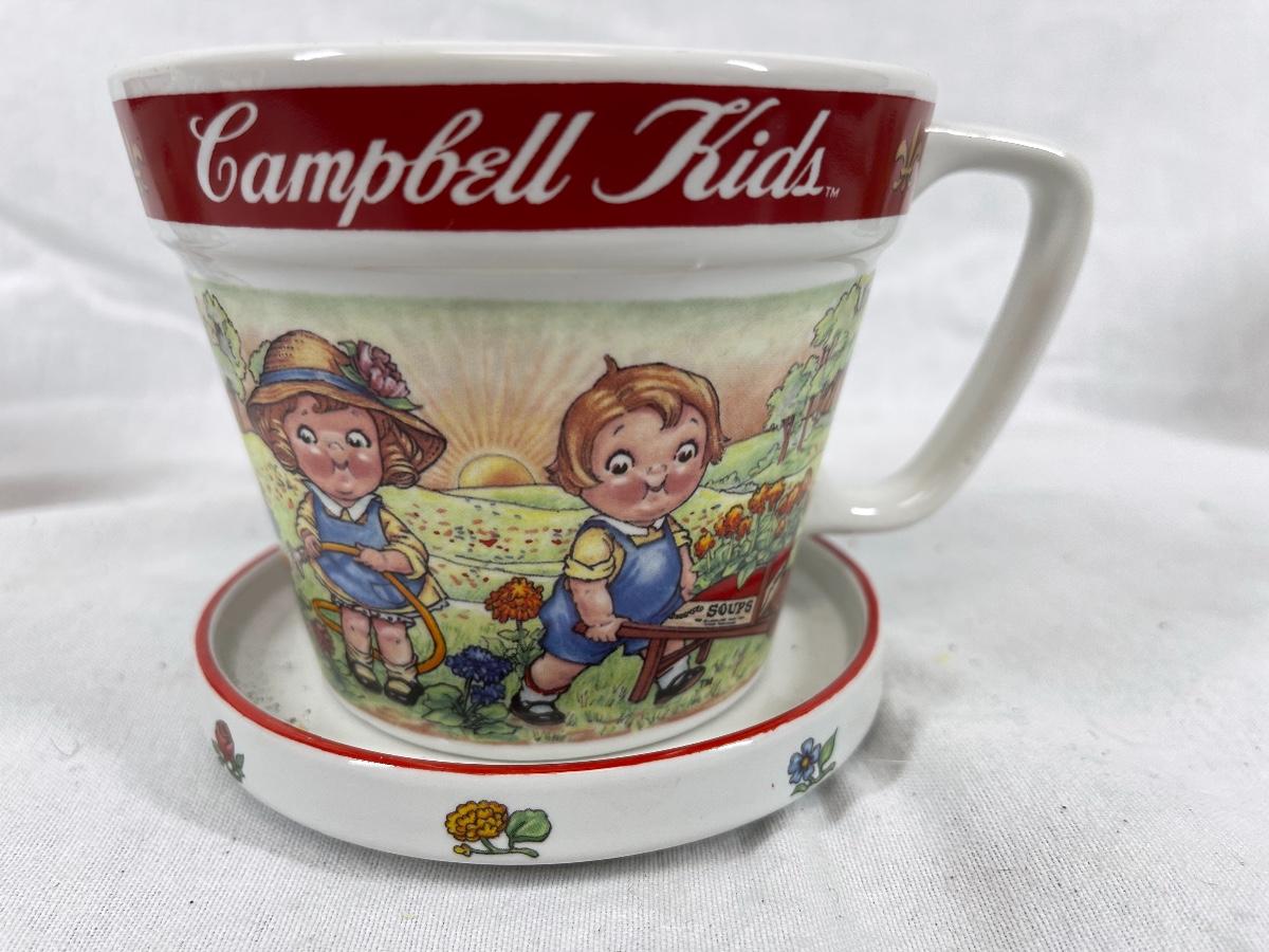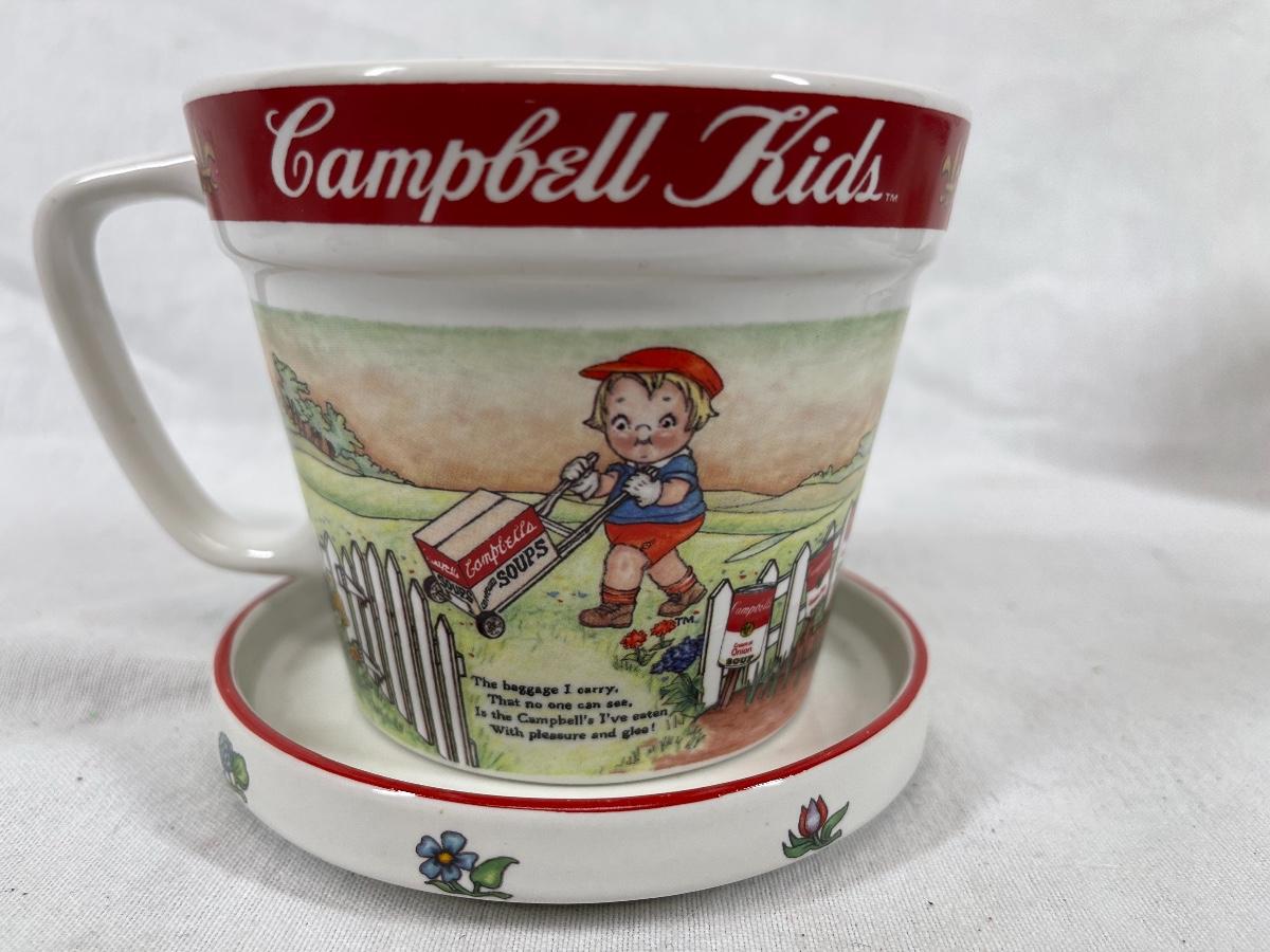 Set of 4 Campbell Soup mugs and saucers with bonus pepper shaker. Good condition.