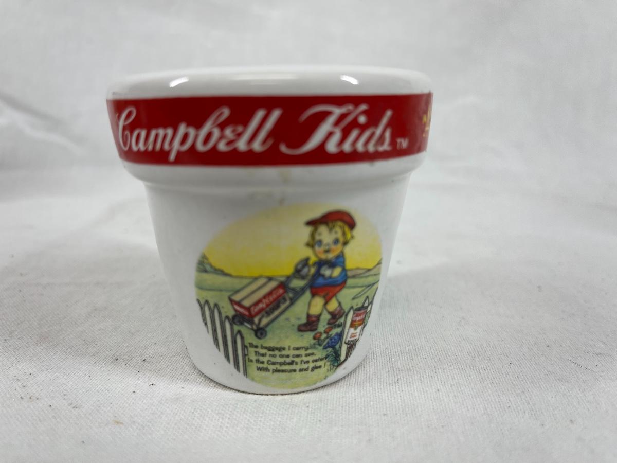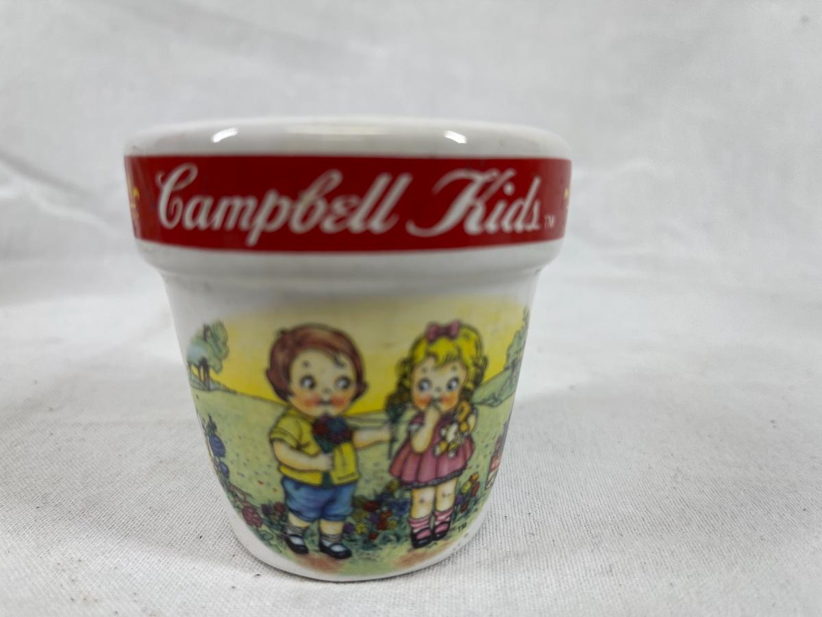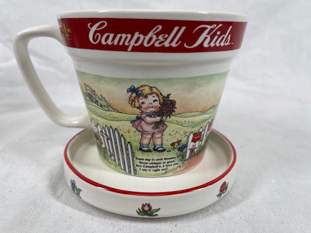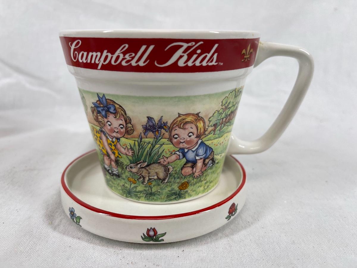 Set of 4 Campbell Soup mugs and saucers with bonus pepper shaker. Good condition.