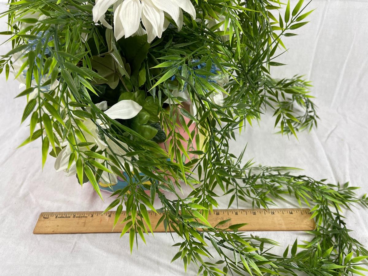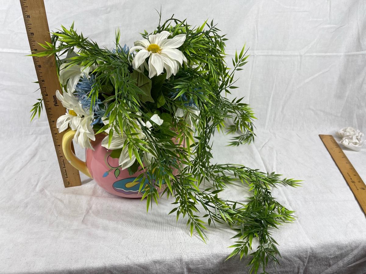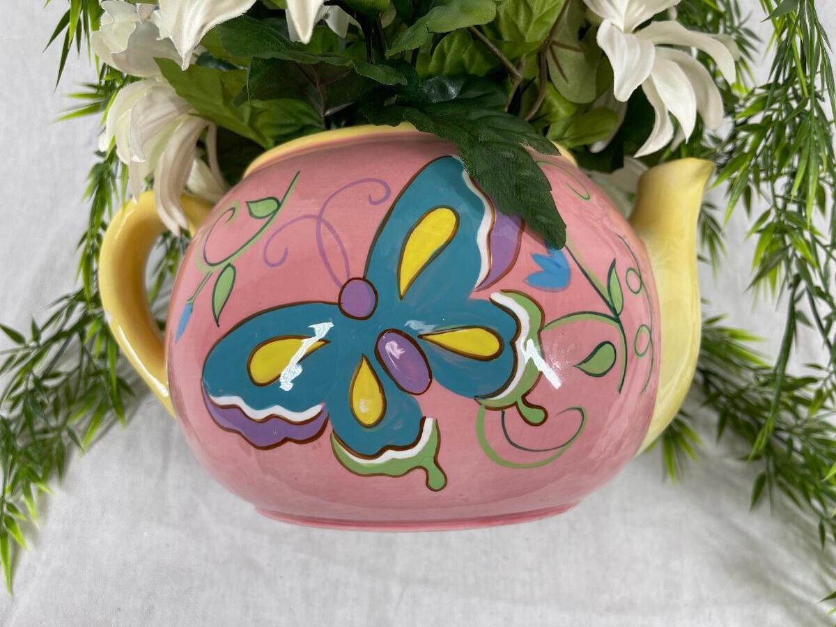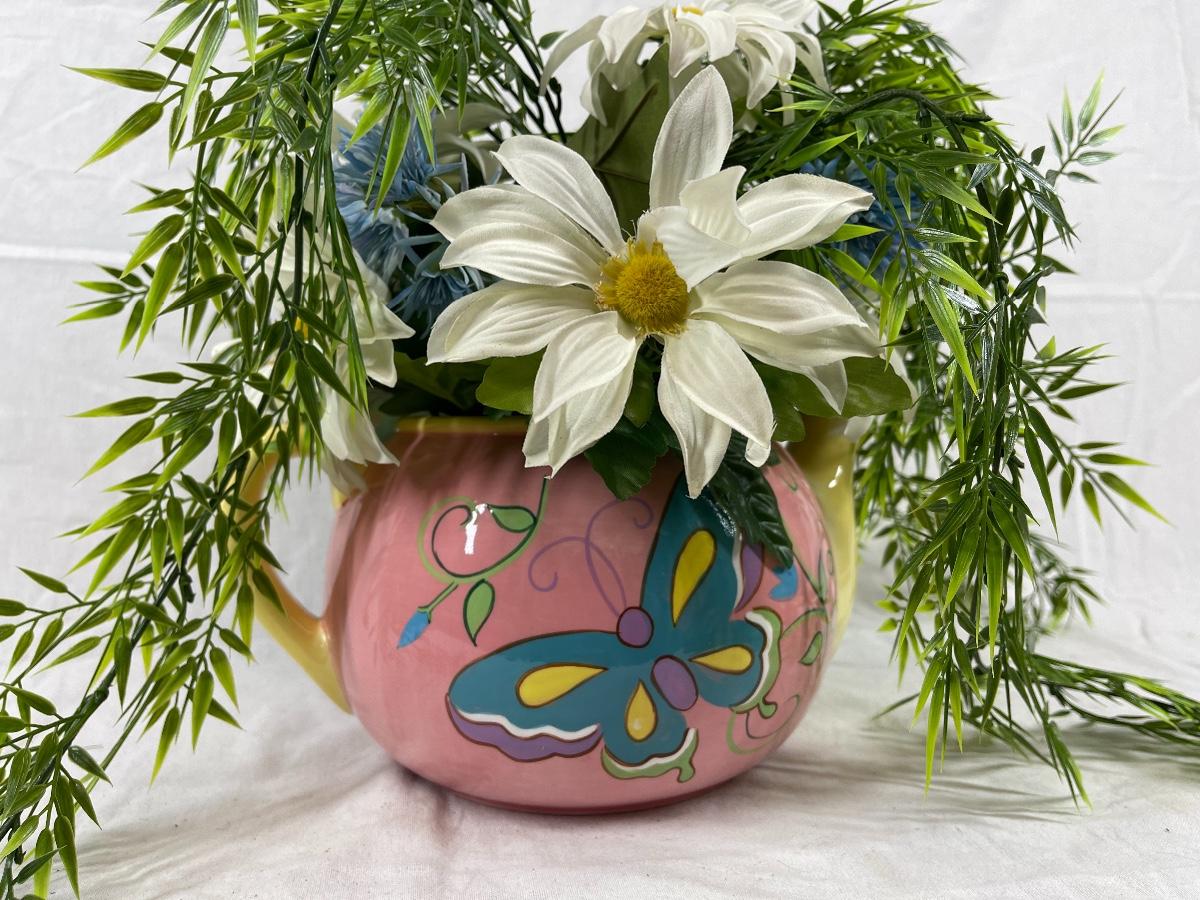 Colorful teapot turned into a planter with faux greenery. Maybe dusty from display.