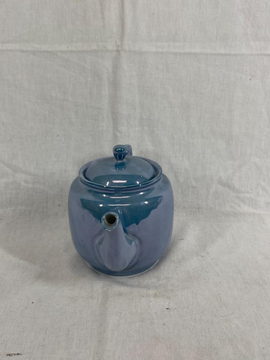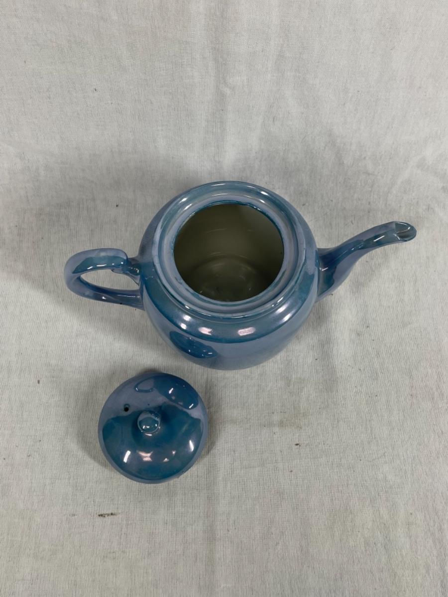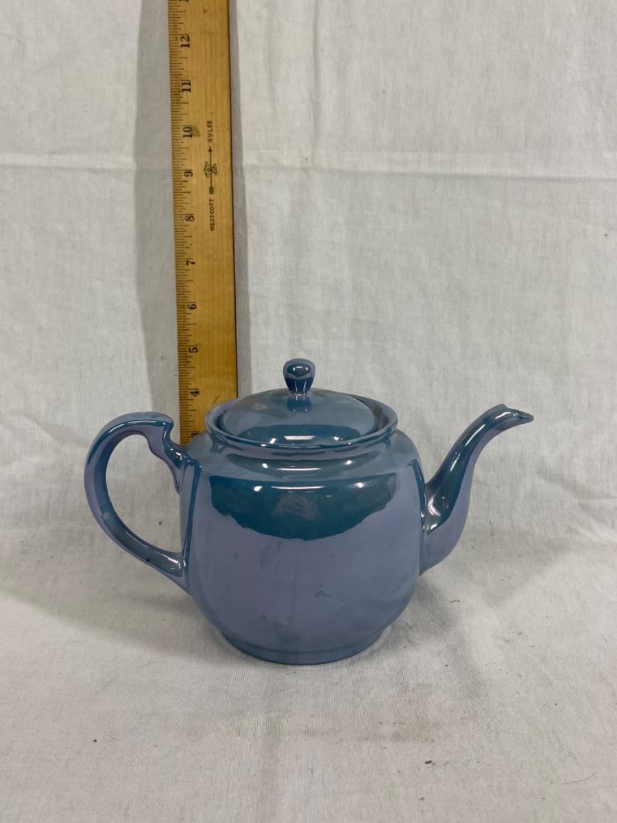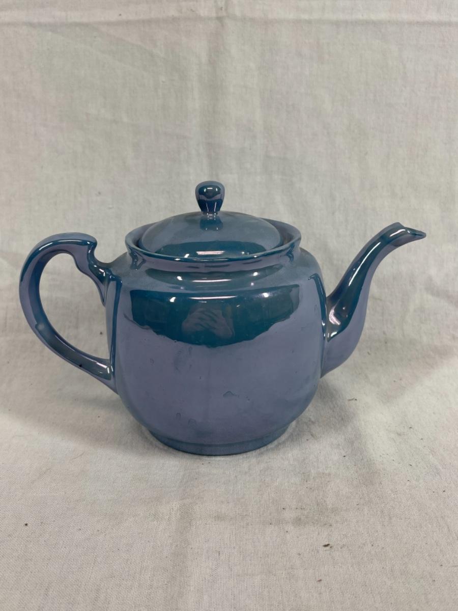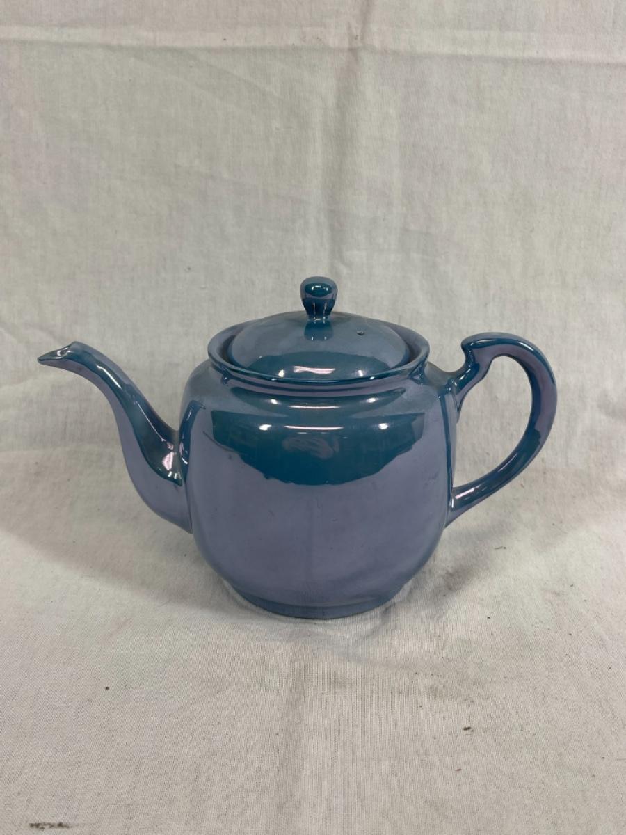 Blue ceramic tea pot. Has a slight iridescent finish common with lusterware ceramics.