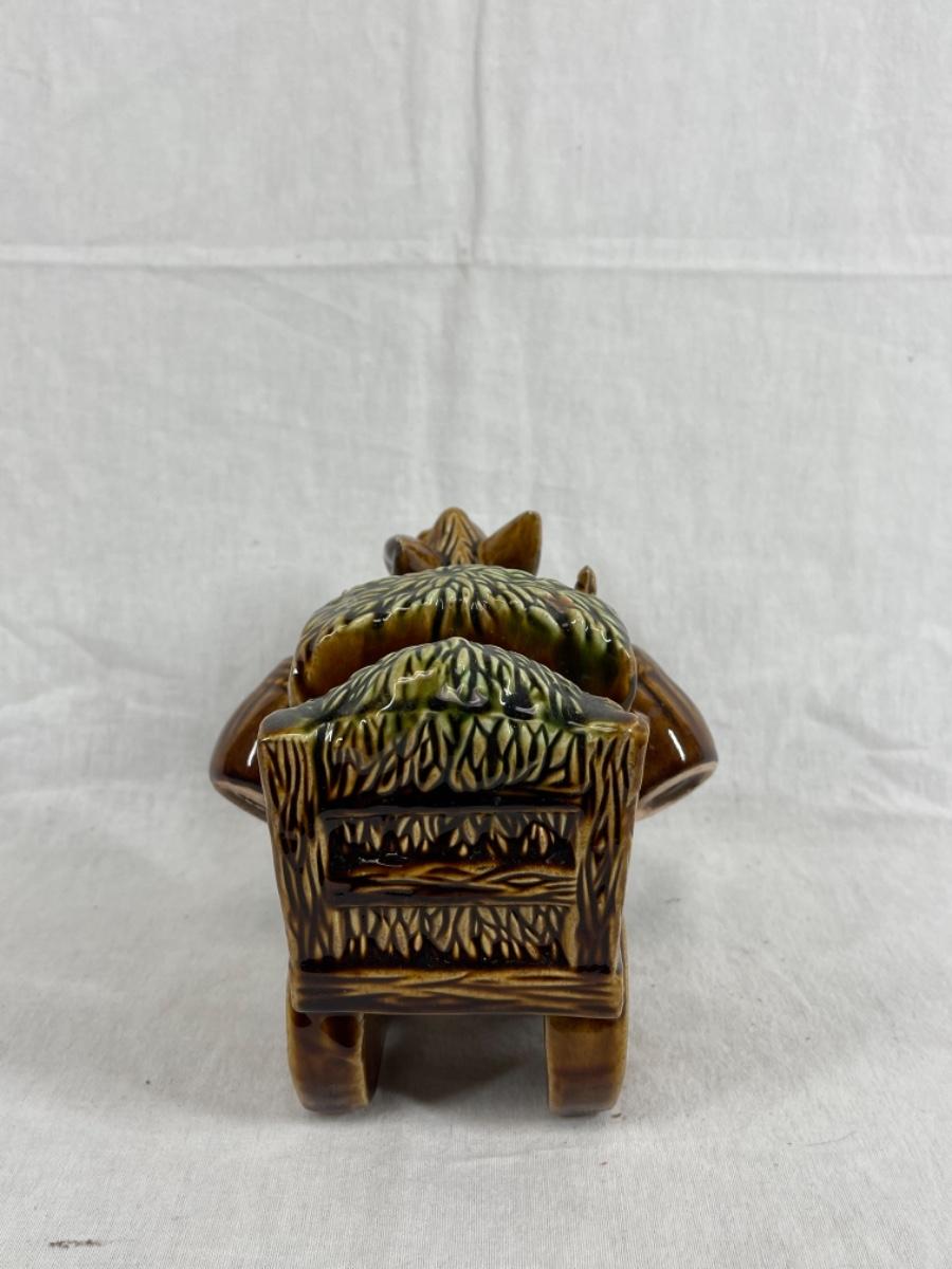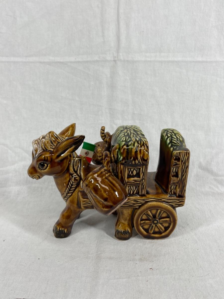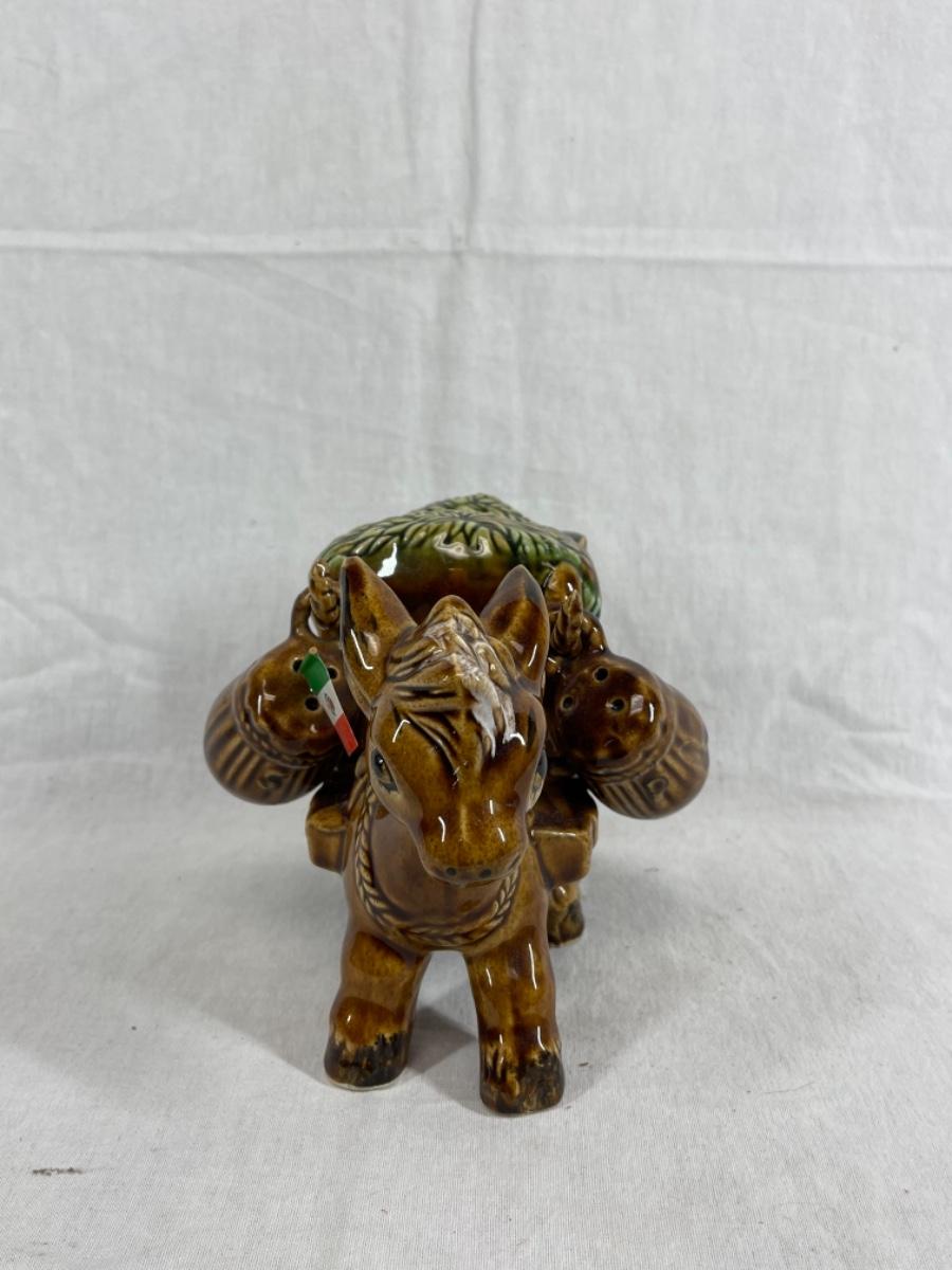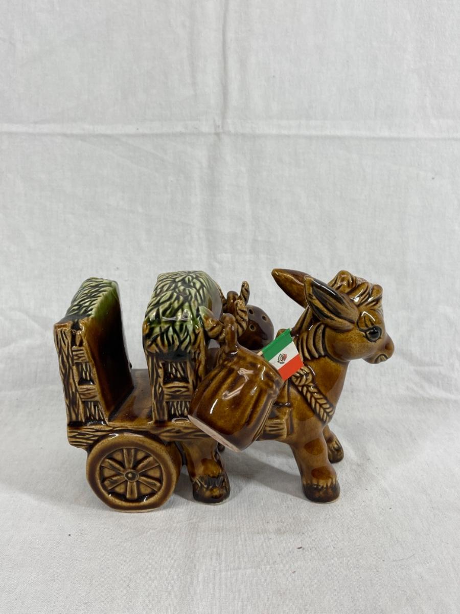 Vintage souvenir ceramic donkey. Donkey is pulling a cart. Cart is a napkin holder and hanging on each side of the front is two barrel like salt & pepper shakers. In good vintage condition. Displays great.
