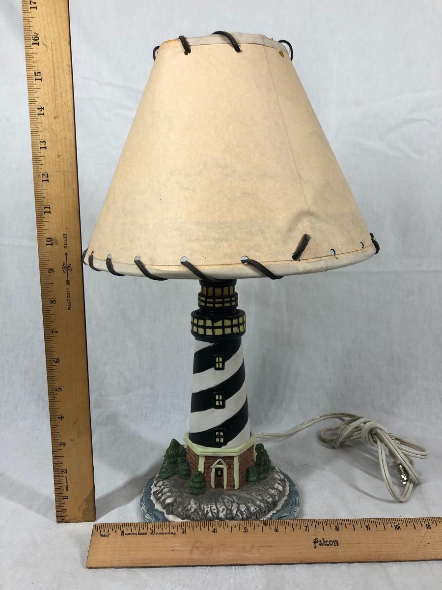Lighthouse table lamp. Small, good for desk or bedside. About 16" height with shade.