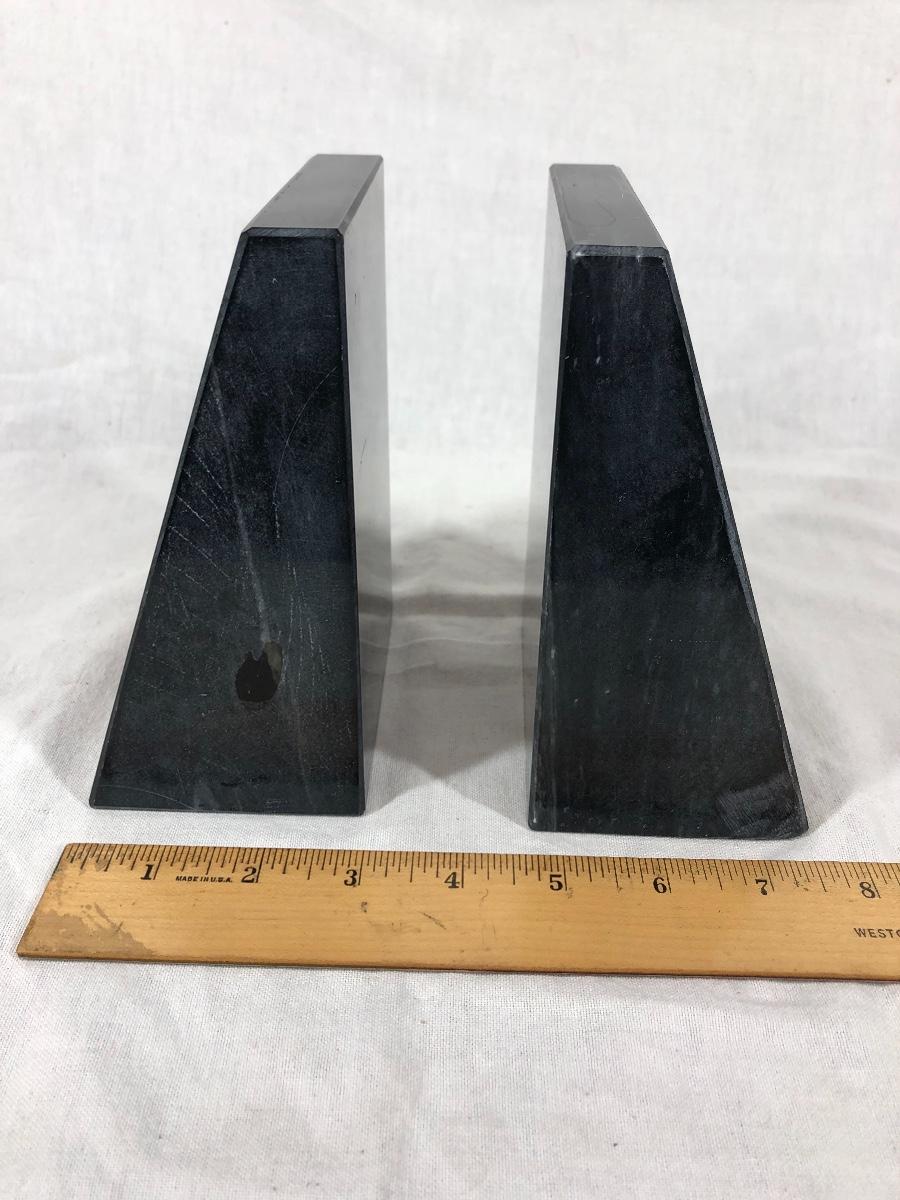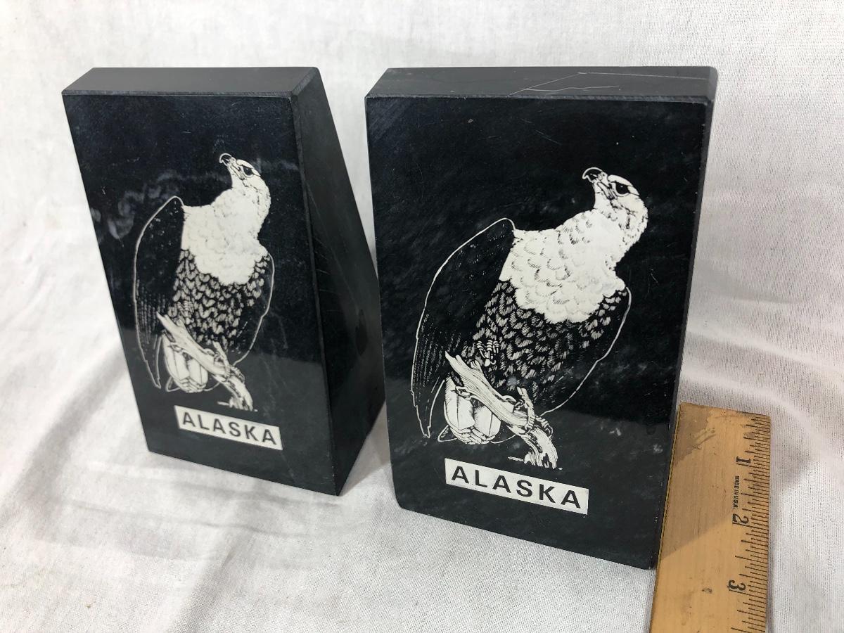 Pair of heavy bookends. Alaska souvenirs, black stone with an eagle image carved into them. About 6" tall.