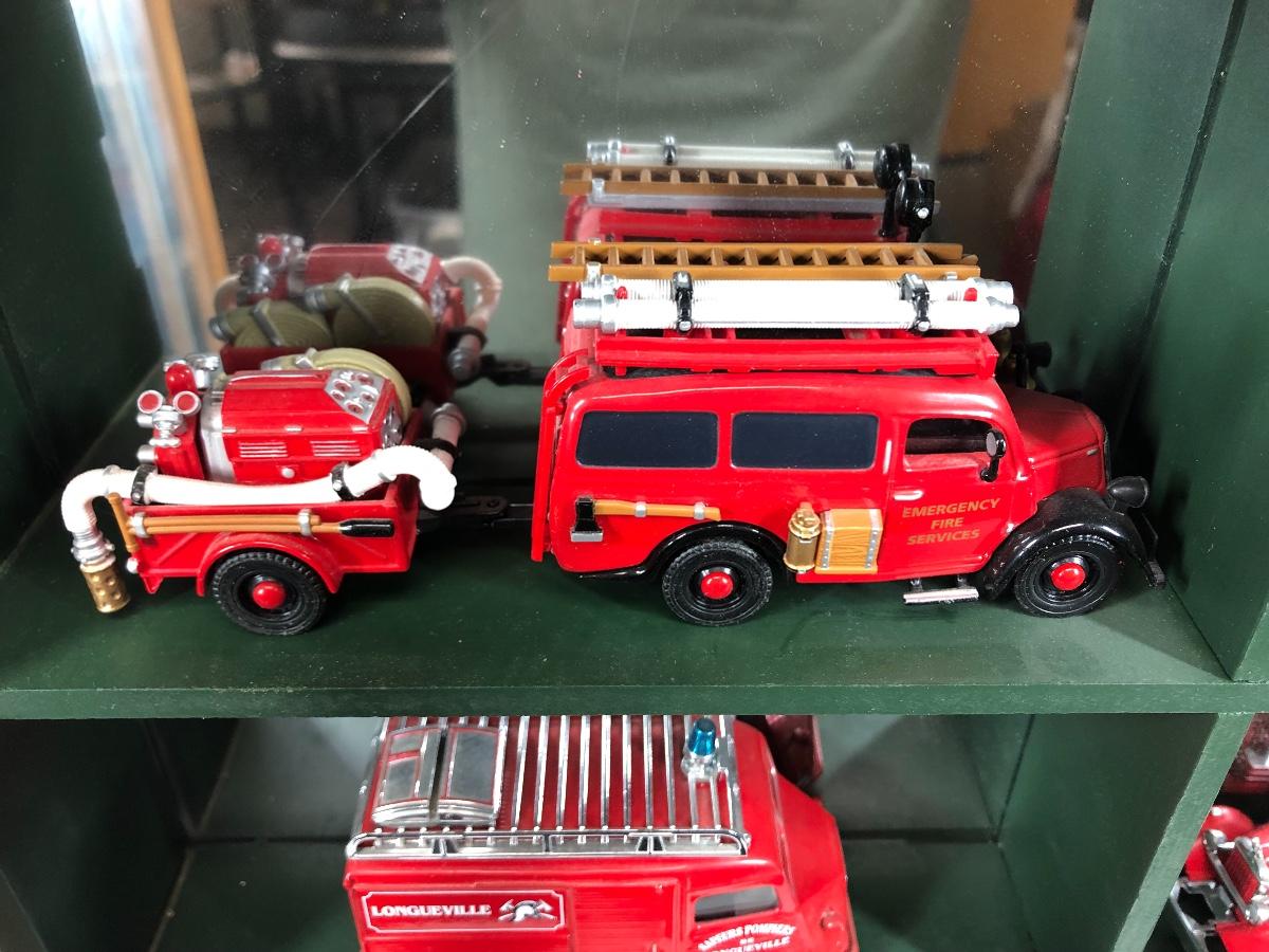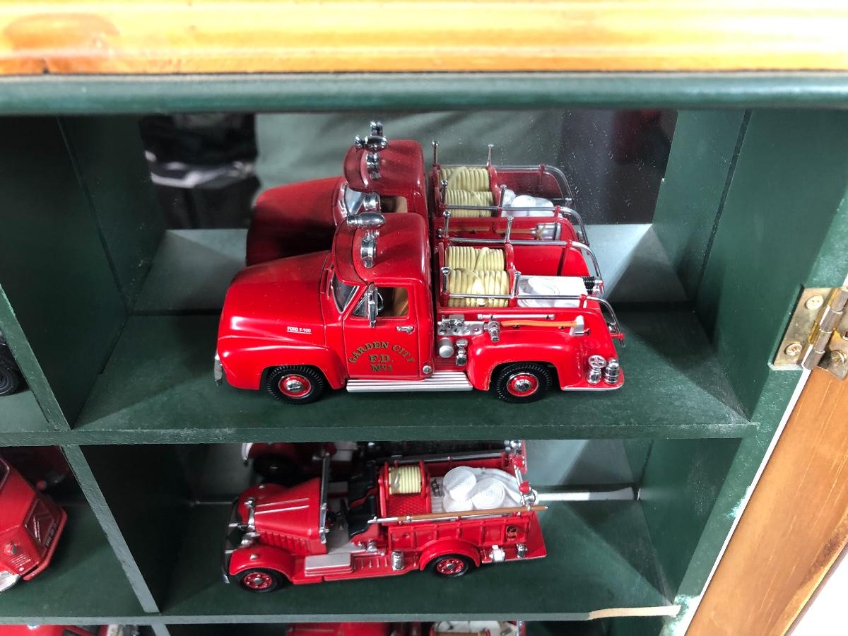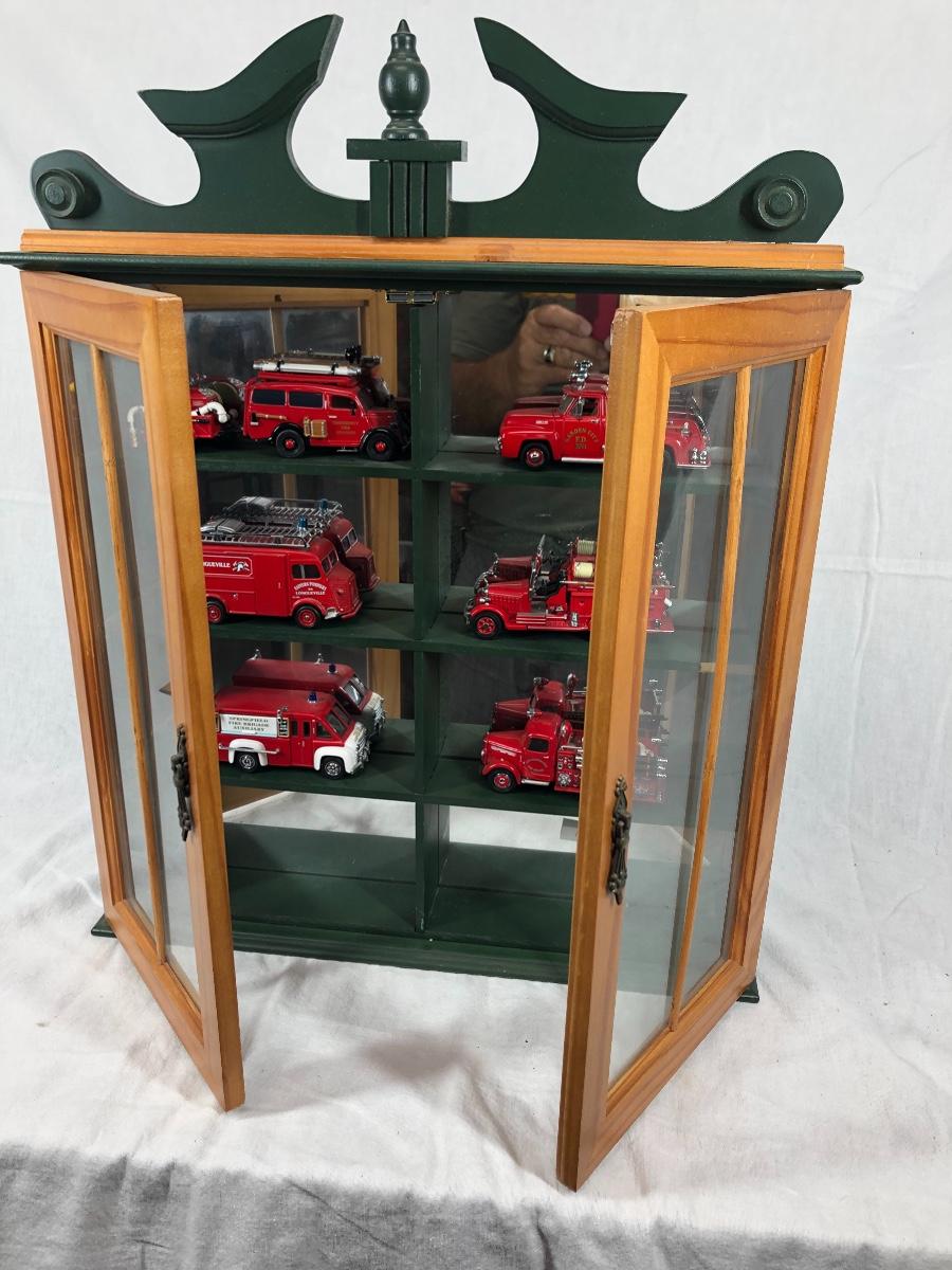 Mirrored display cabinet with 6 fire department vehicles. Cars are from Matchbox Models of Yesteryears collection. All are different fire dept vehicles. Good condition other then dusty. Car are a little bigger then your standard Matchbox car. Cabinet is about 20" tall and 18" wide.