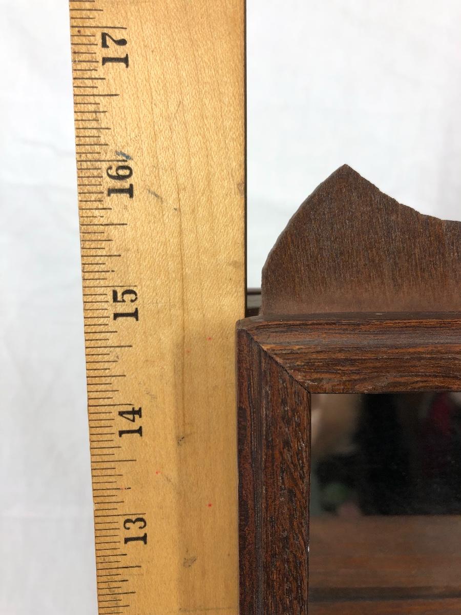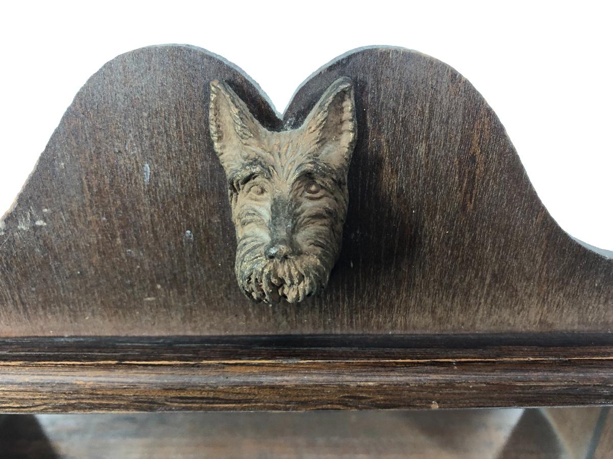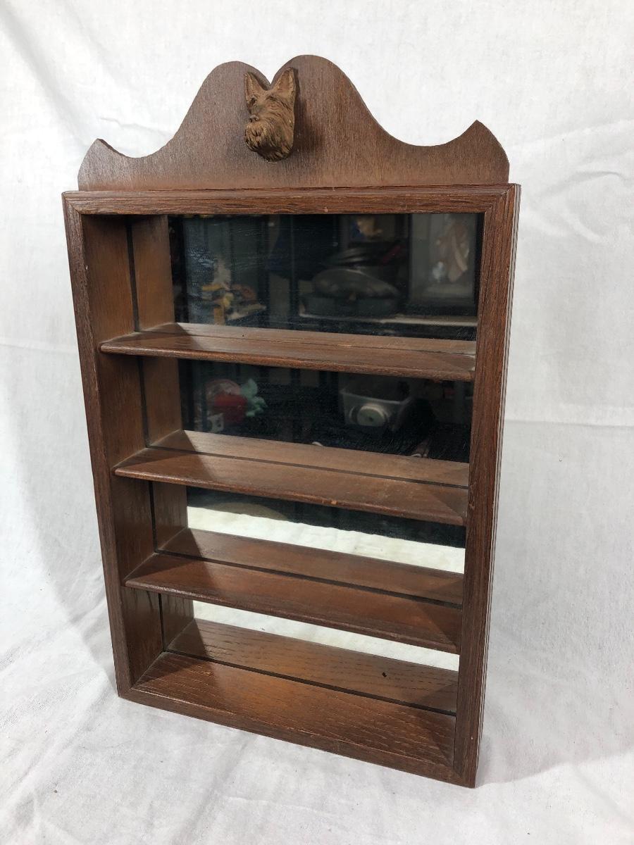 Vintage wood display shelf. Mirrored back. Has a terrier dog head at the top. About 18" tall and 11" wide. Has 4 shelves.