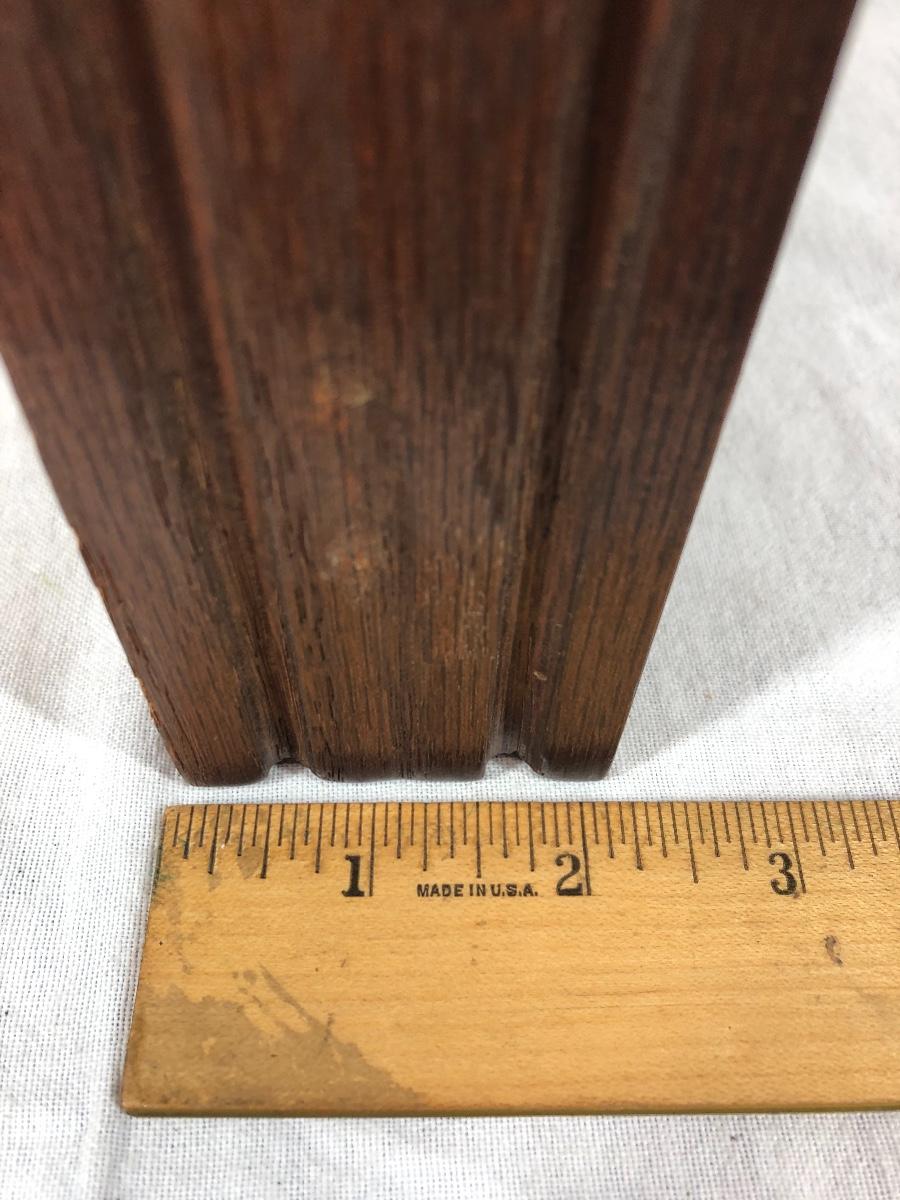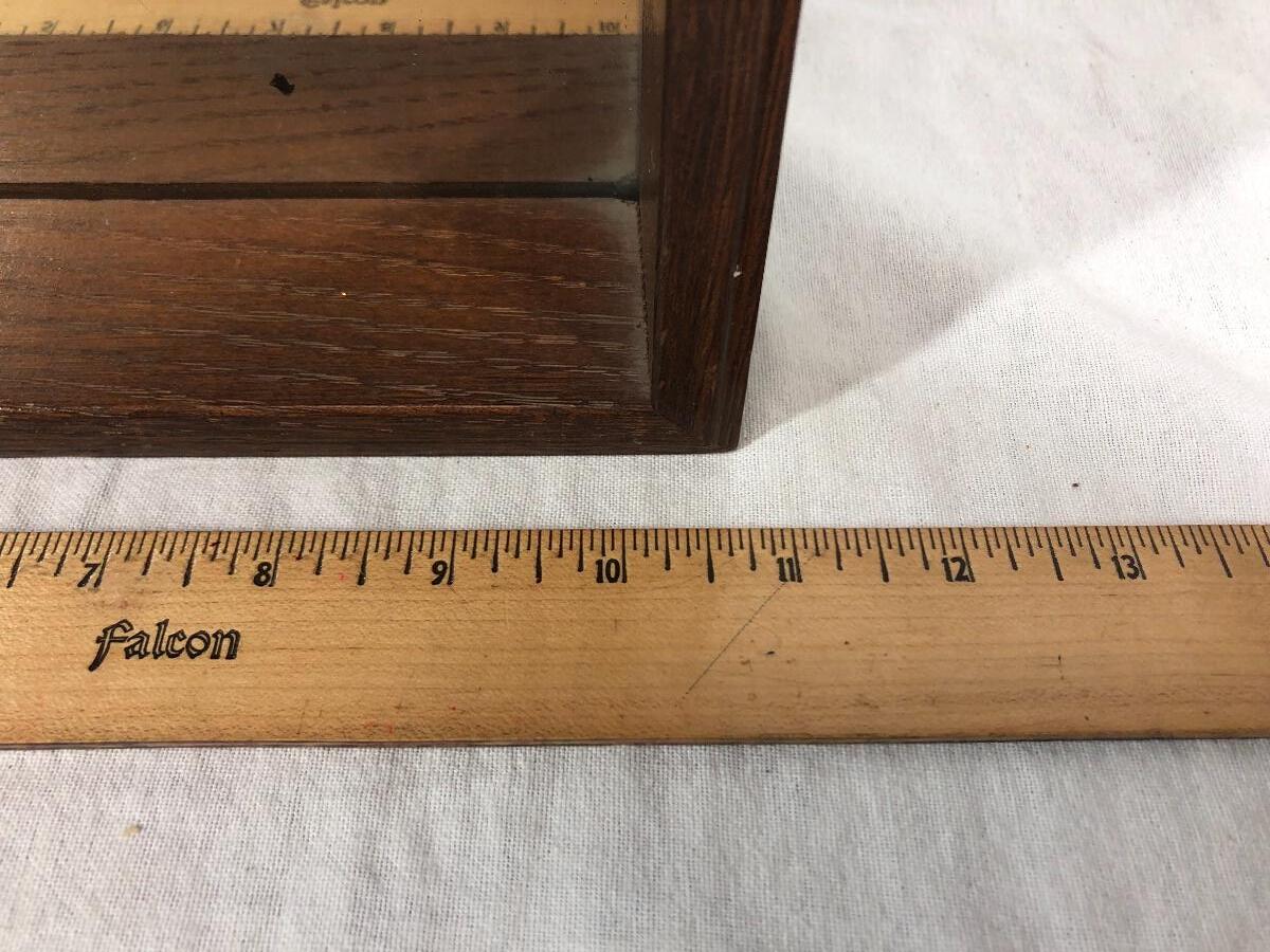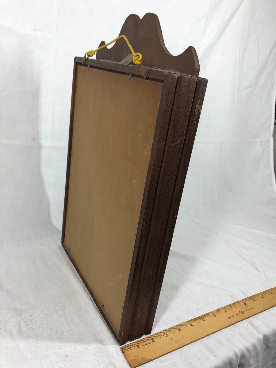Vintage wood display shelf. Mirrored back. Has a terrier dog head at the top. About 18" tall and 11" wide. Has 4 shelves.