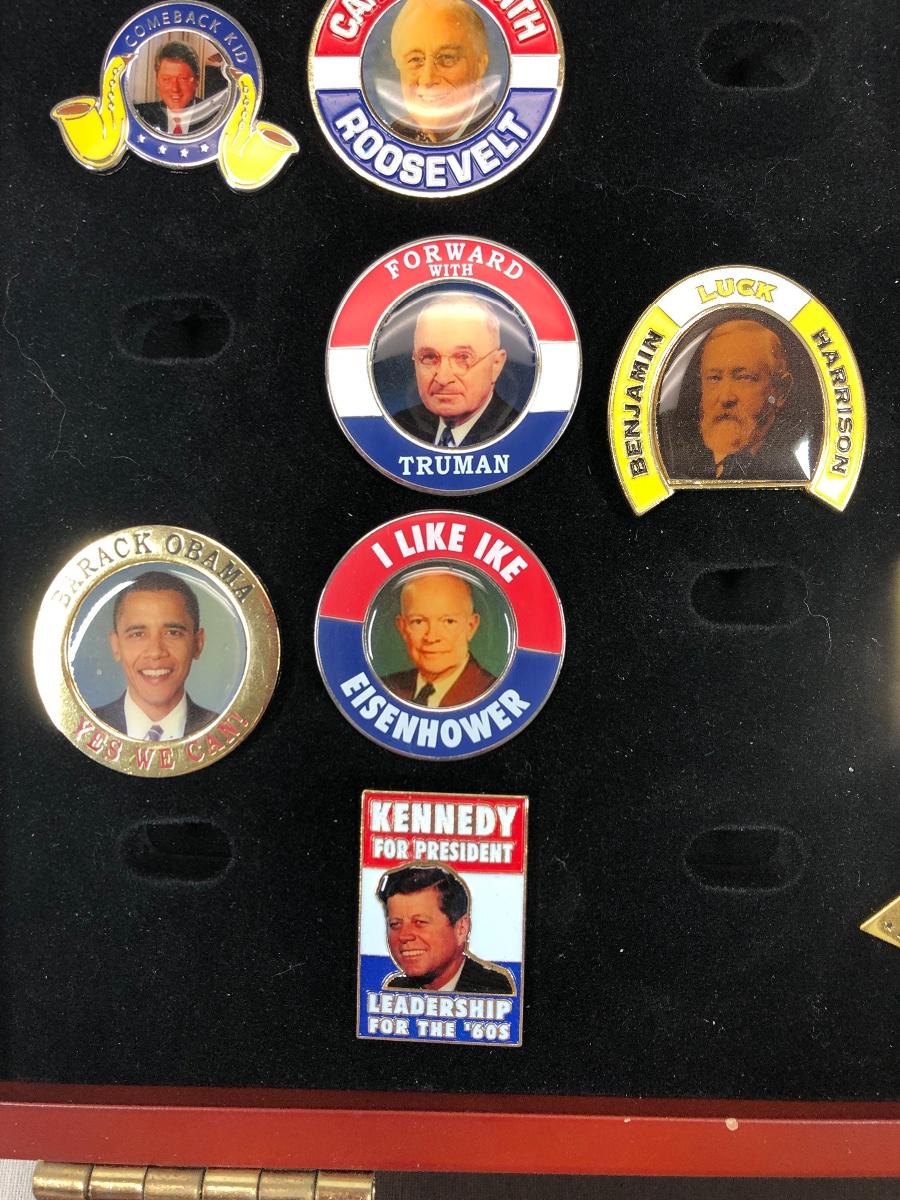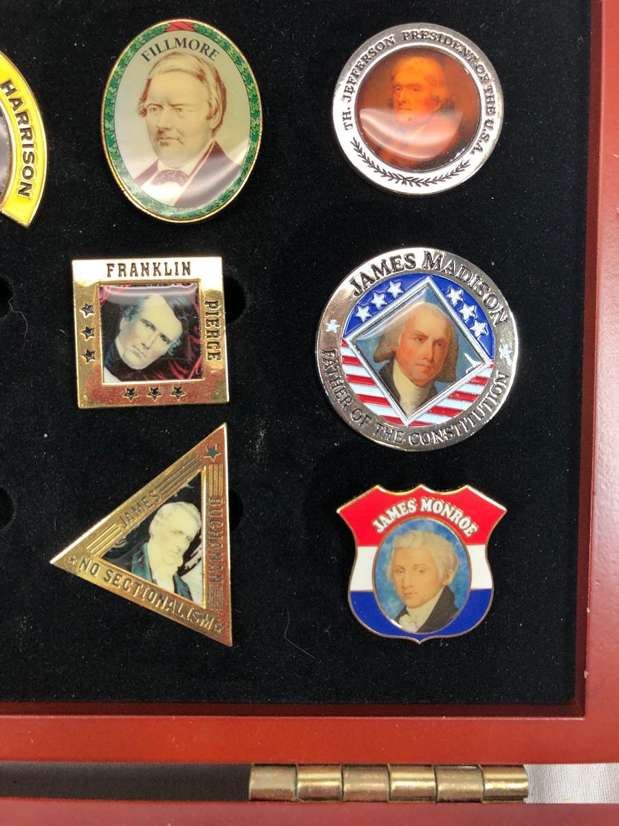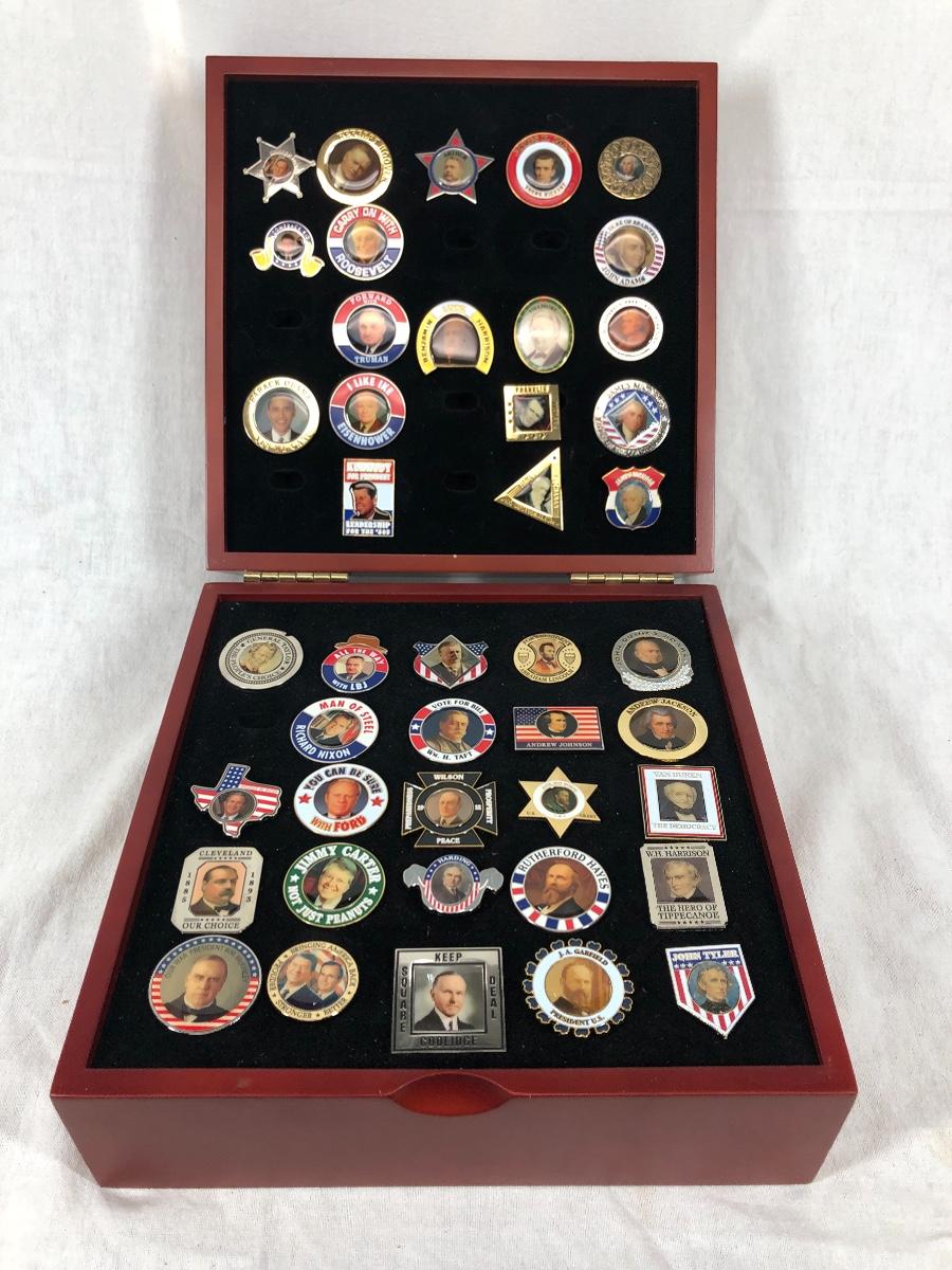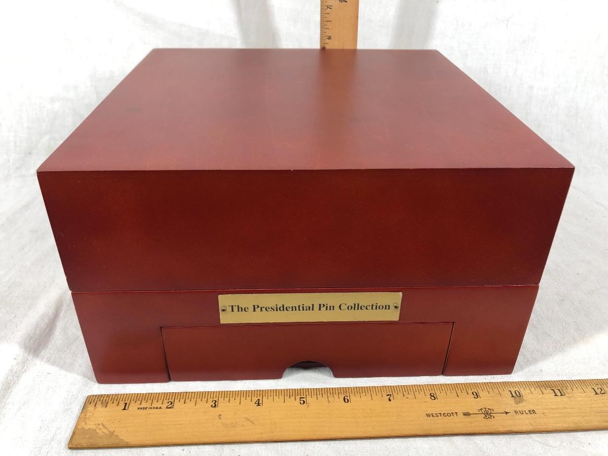 Willabee & Ward Presidential Pin Collection. Comes in a wood display box. Has a total of 43 pins plus trivia cards about the presidents. In good condition. Hinged lid box about 10" in size.