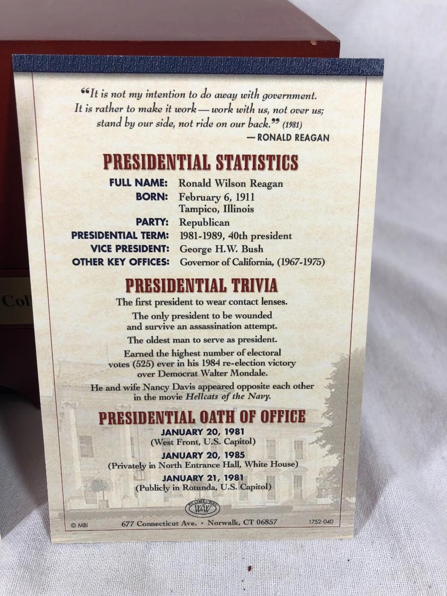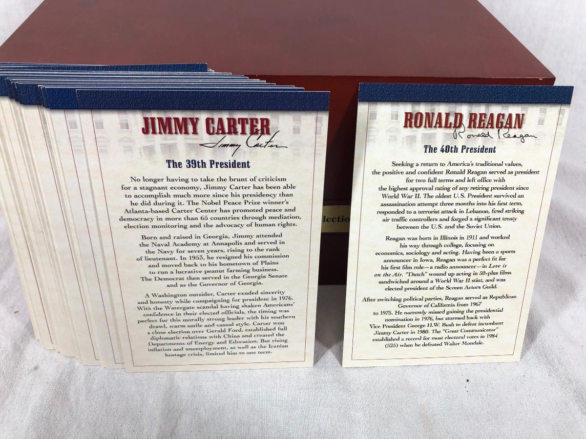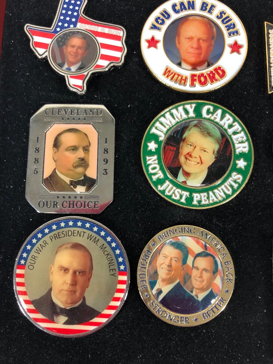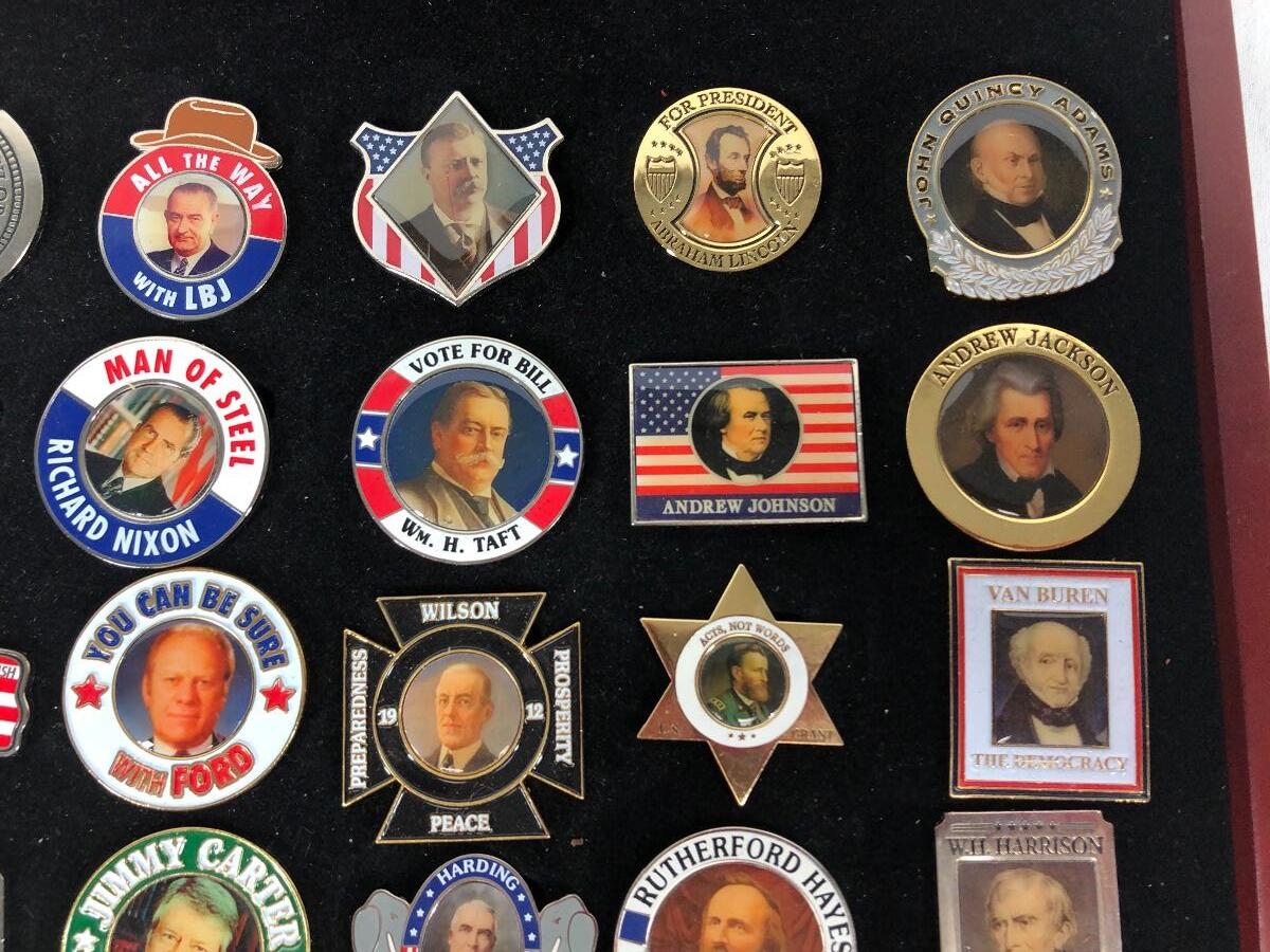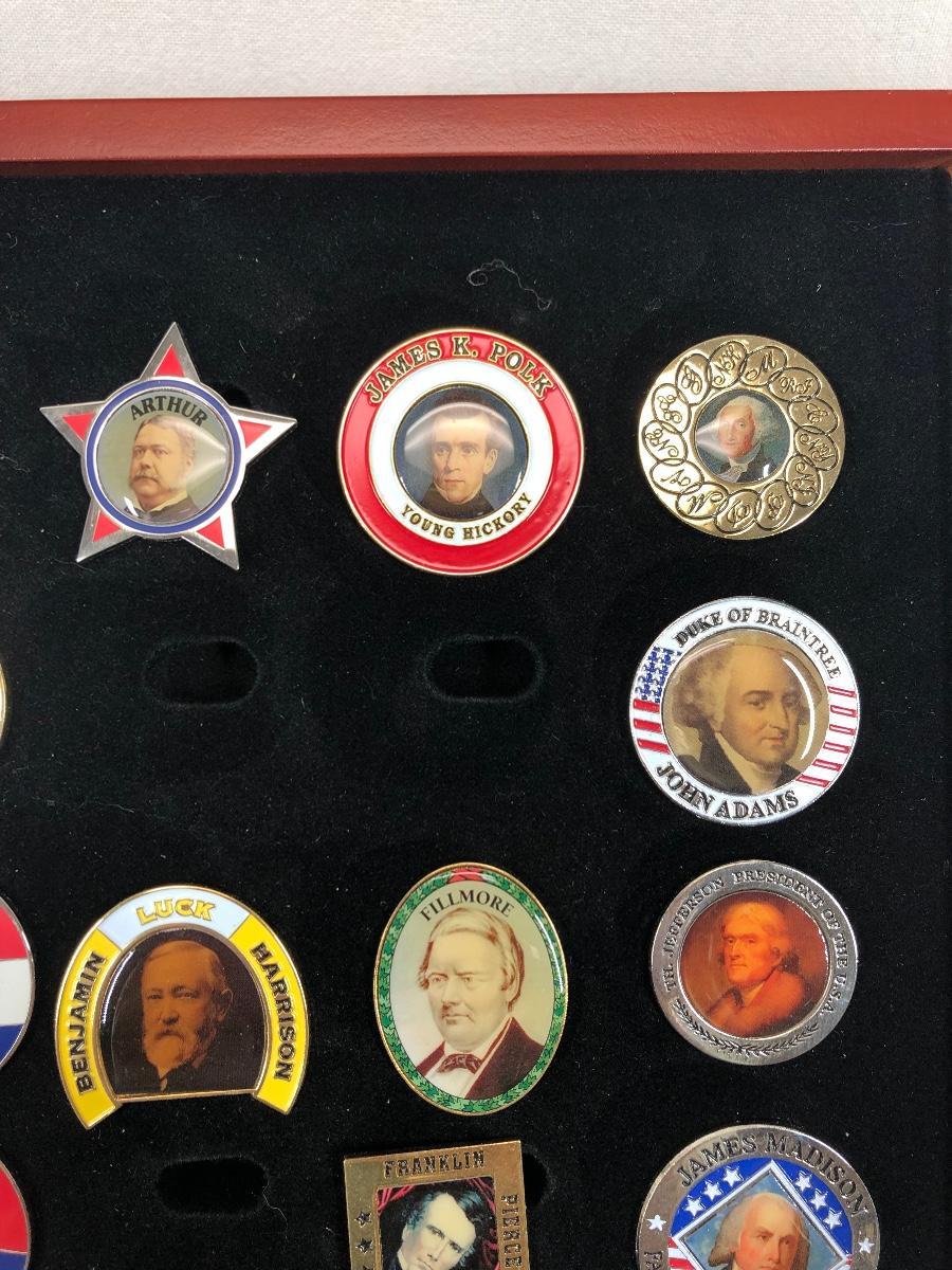Willabee & Ward Presidential Pin Collection. Comes in a wood display box. Has a total of 43 pins plus trivia cards about the presidents. In good condition. Hinged lid box about 10" in size.