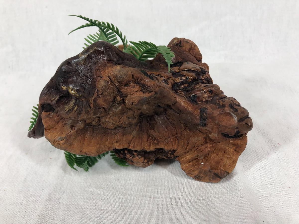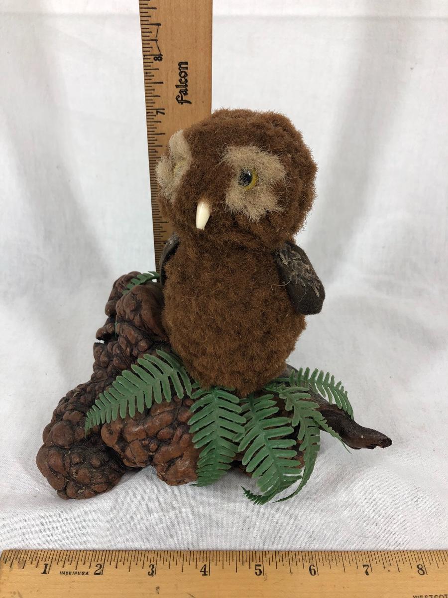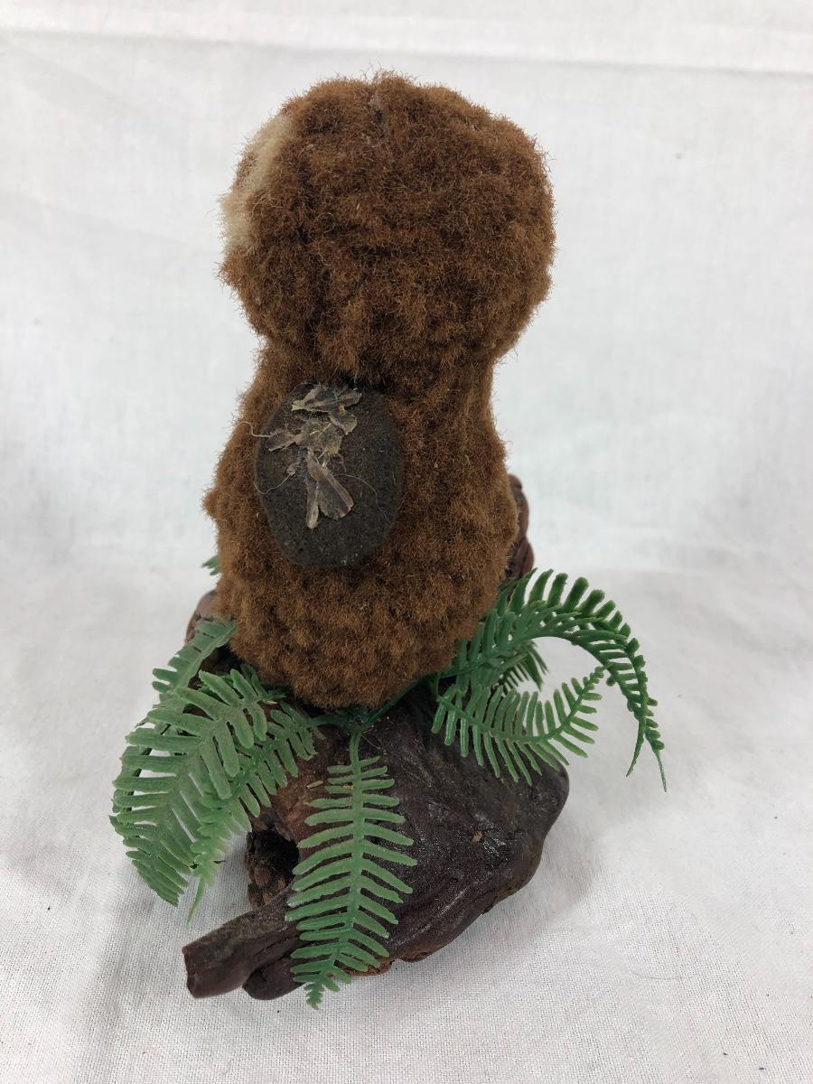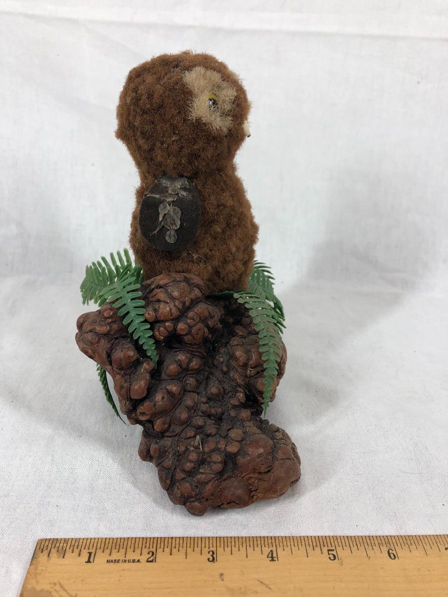 Vintage fuzzy owl figurine on burl wood base. About 7" tall.