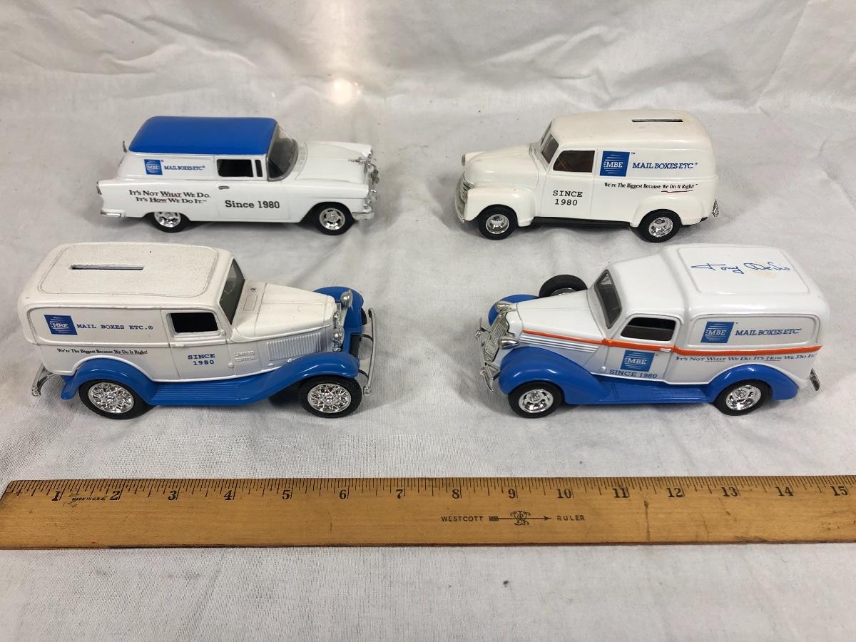 Set of 4 Mail Boxes Etc Die Cast Cars & Coin Banks