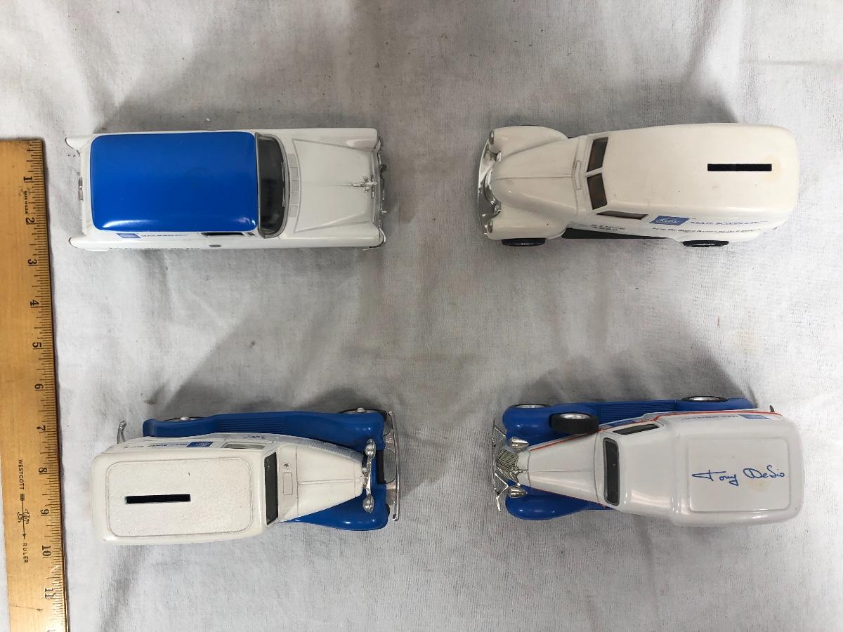 Set of 4 die cast cars and coin banks from Mail Boxes Etc. About 6" size.