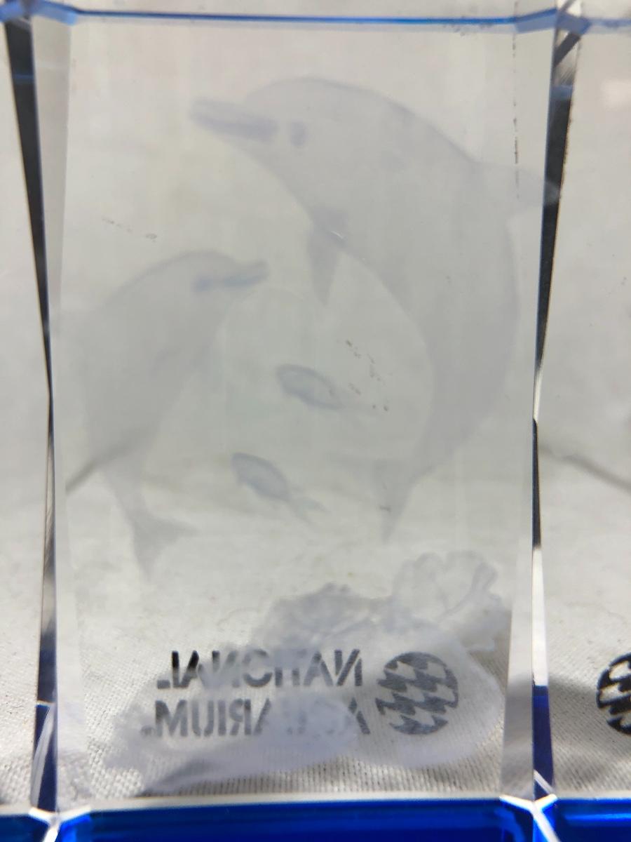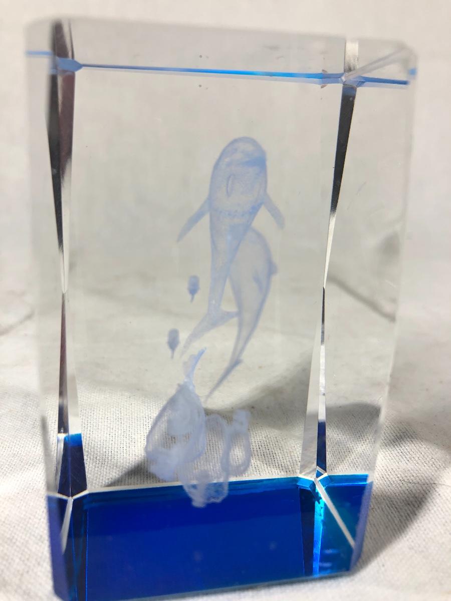 National Aquarium dolphin paperweight. Image is laser etched inside glass.