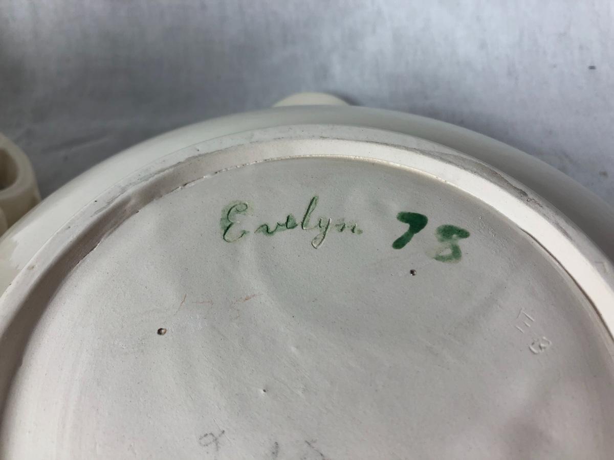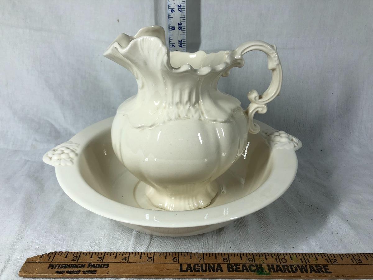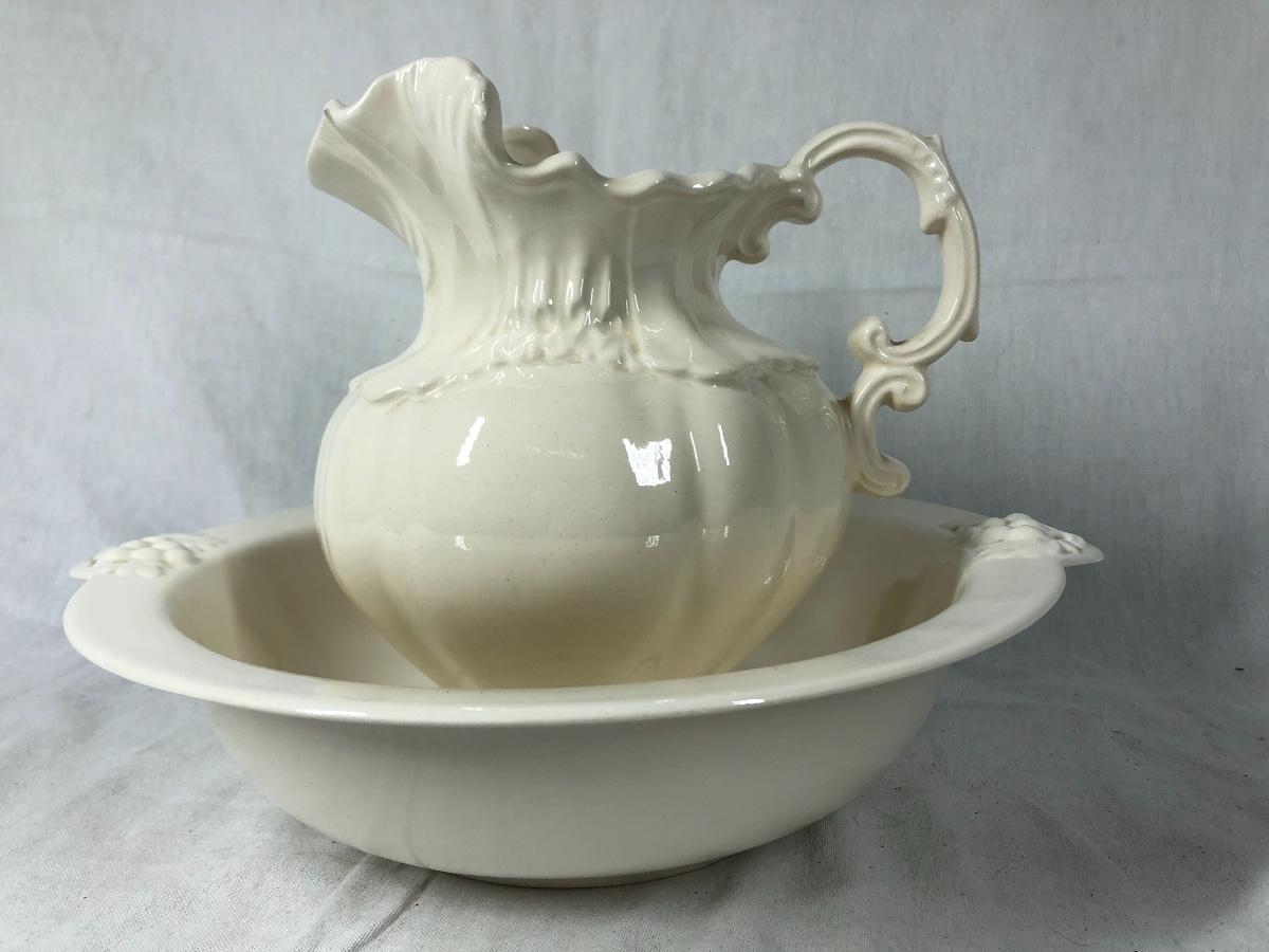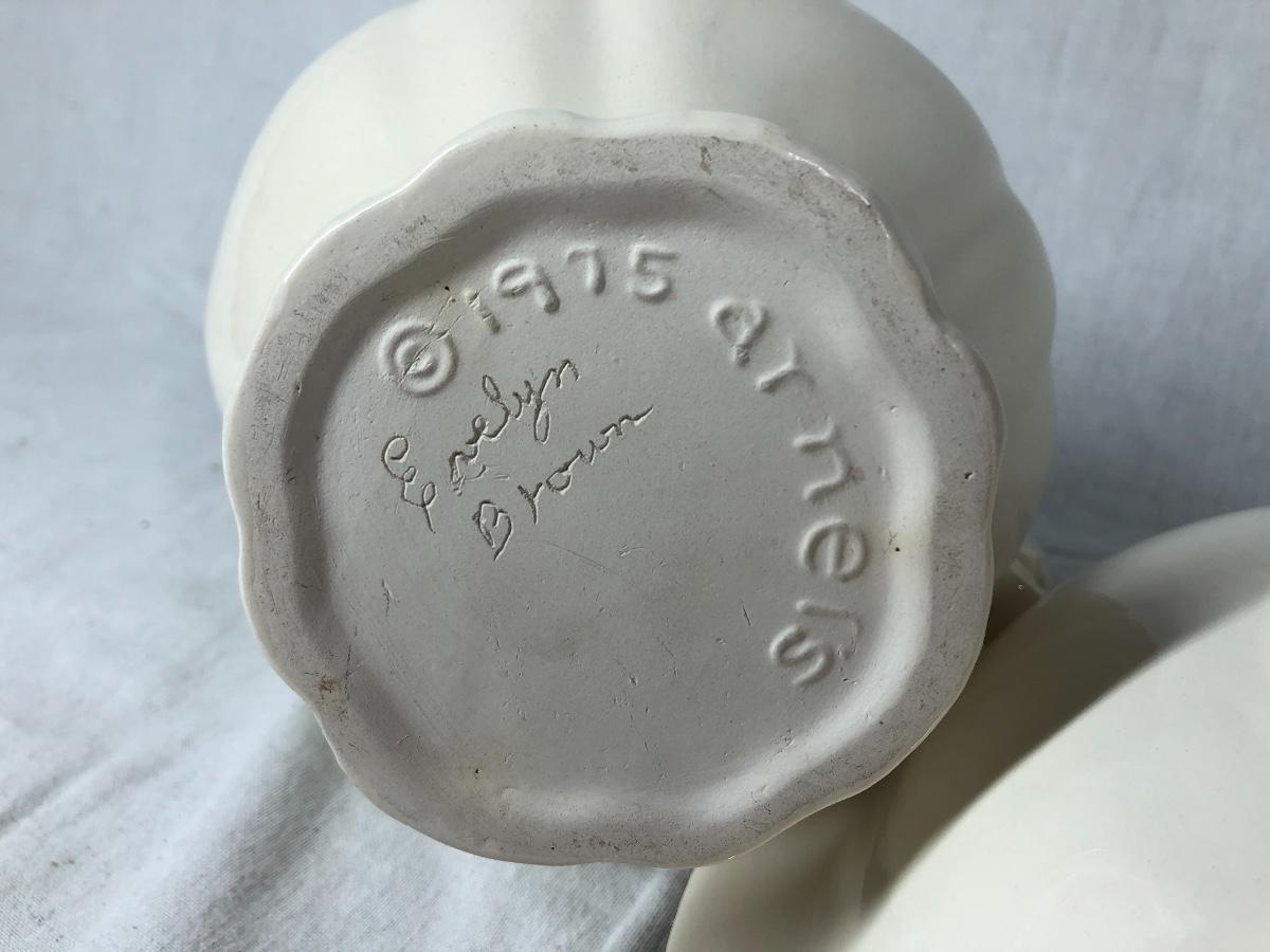1975 Arner's Pottery pitcher with basin bowl. About 9" size. Off white finish. Good condition.