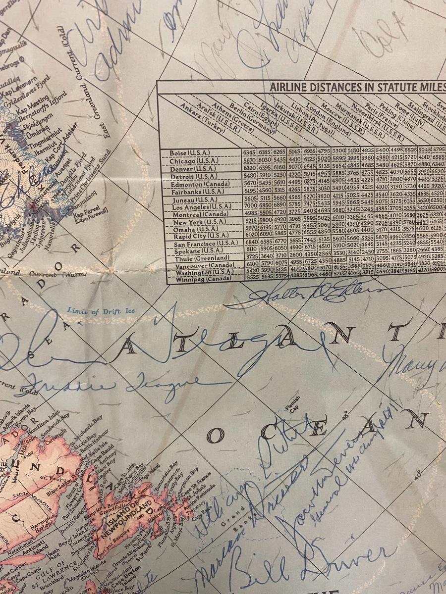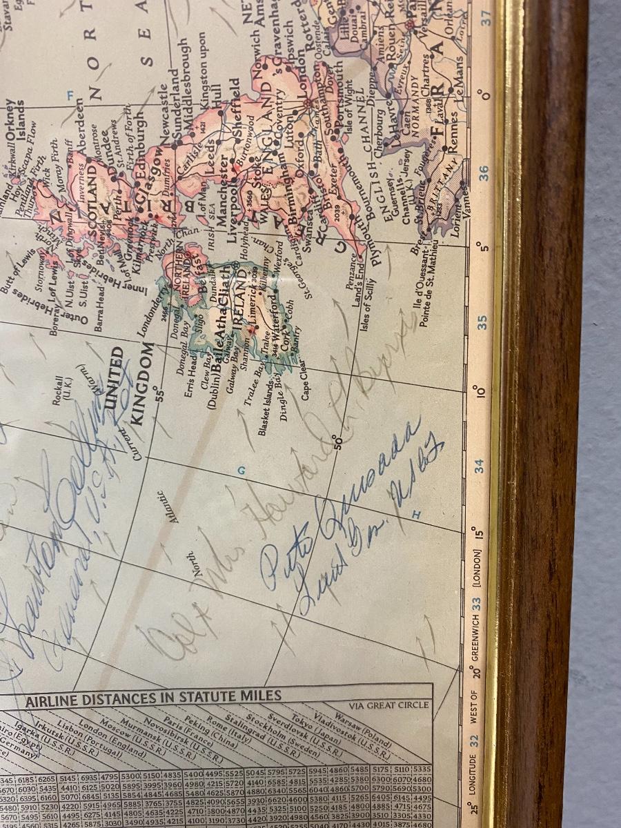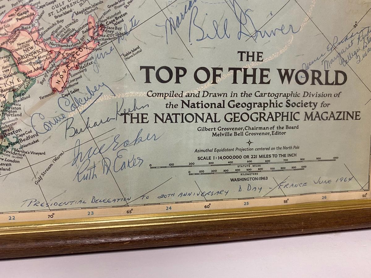 RARE ONE OF A KIND!! Signed Top of World Map from the Presidential Delegation to 20th Anniversary D-Day France in June 1964. Covered in signatures of WWII veterans, Medal of Honor recipients, and others. From the estate of A Medal of Honor recipient, Walter Ehlers.